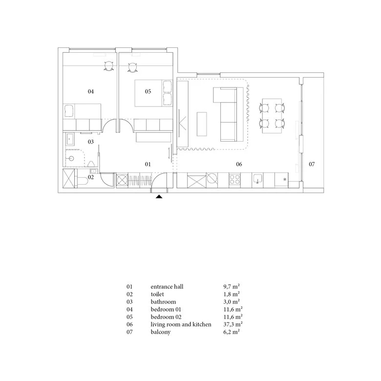 该极简风格住宅设计告诉我们什么才是生活真正需要的?我们身边的物质究竟占据了多少精神空间?是否有可能通过极简主义实现心灵和精神的自由?什么是功能,什么只是欲望?如何在预制混凝土板公寓中容纳 74 平方米的公寓,使三个家庭成员既有隐私,又有共同的空间?