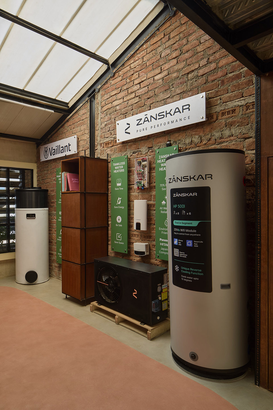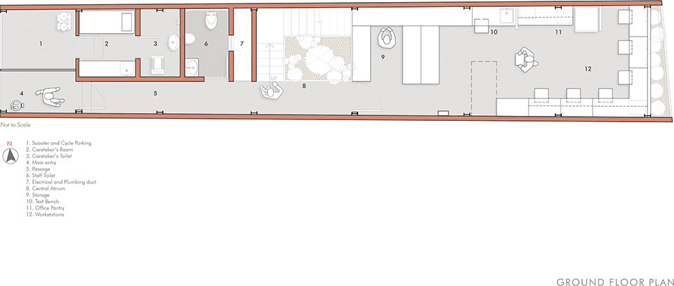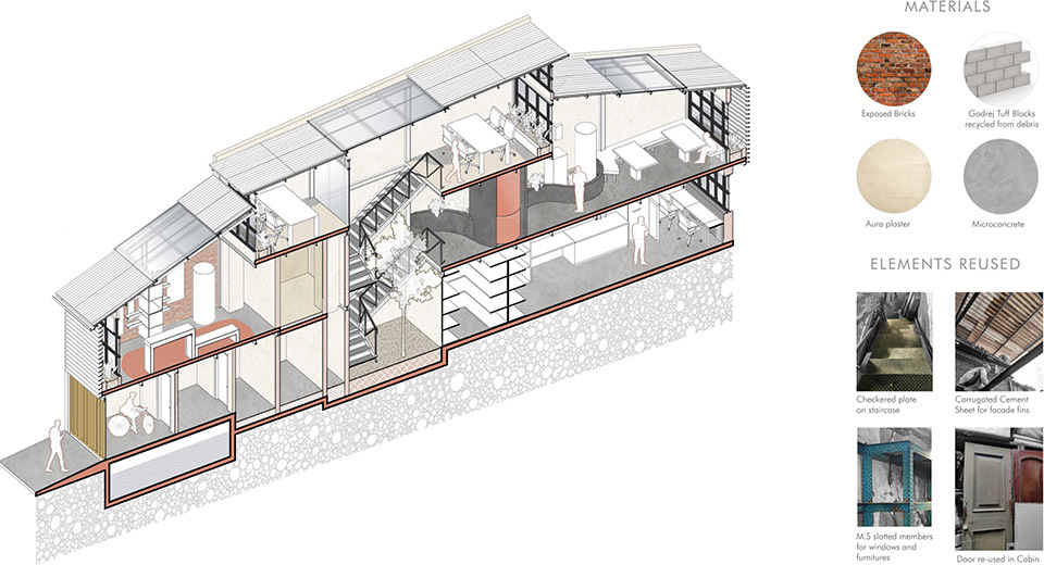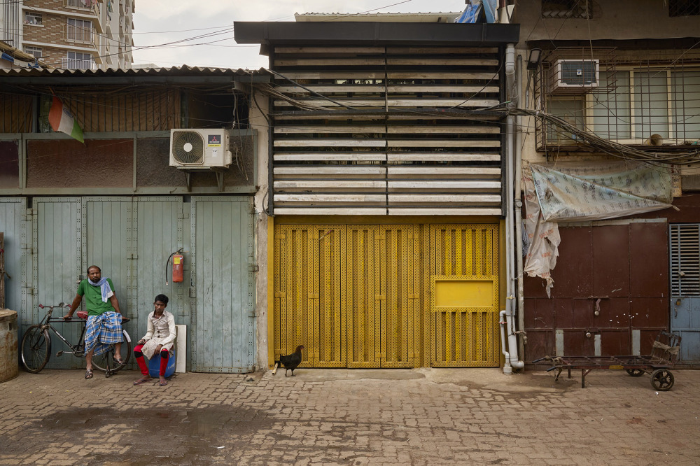 该展厅设计位于南孟买 CC Lakda Bazaar 迷宫般的巷道,木推车的吱嘎声、母鸡的轻啼、锯木的嗡鸣便交织成独特的市井交响,木香与泥土气息裹挟着生活温度扑面而来。就在这片充满烟火气的街区中,由 Huzefa Rangwala 与 Jasem Pirani 领衔设计的 Aquagreen Solutions 体验中心,以 “适应性再利用” 为核心策略,将一座功能单一的旧仓储空间,蜕变为兼具可持续理念与在地气质的建筑新载体。它以 11 英尺 ×77 英尺的狭长地块为画布,用粗粝的材质、通透的光影与流动的空间,在城市喧嚣中书写出 “低调融入环境,却自带生命力” 的设计诗篇。