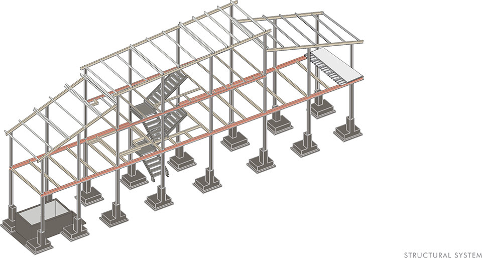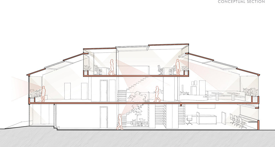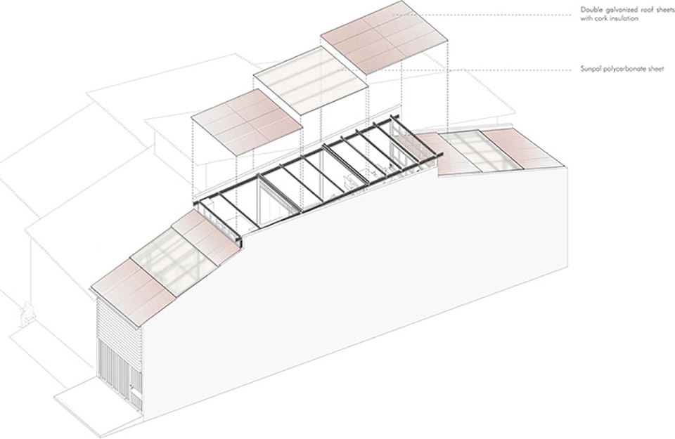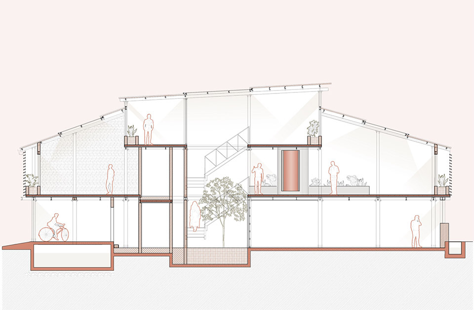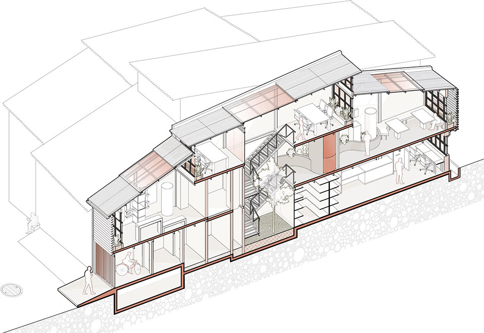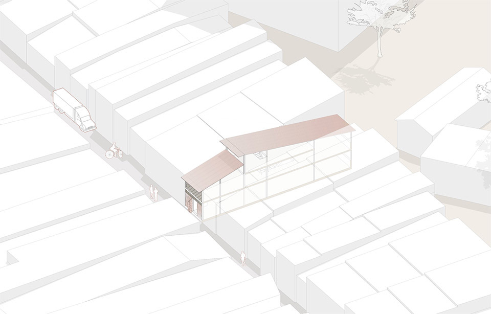 建筑立面采用上下双层半透结构,下部的赭色与上部的白色形成柔和过渡,穿孔金属与波纹水泥板叶片如同 “可呼吸的表皮”,既若隐若现地遮蔽内部空间,保障隐私,又能让巷道的光线与声音适度渗透。这种设计既呼应了 bazaar 街区 “半开放、半私密” 的商业形态,又以现代材料语言重构了传统街巷的 “灰空间” 意境,让建筑从远处看如同 “生长于巷道中的有机存在”,而非孤立的现代装置。立面材质的选择暗藏对街区的致敬 —— 穿孔金属的工业质感呼应周边木加工产业的 “手工造物” 气质,波纹水泥板的质朴纹理则与巷道石板路、老旧建筑的肌理形成视觉共鸣。赭色的选用更是巧妙捕捉了 bazaar 中泥土、木材经时光沉淀后的色调,让建筑在色彩上与街区浑然一体,实现 “虽新犹旧” 的在地融合。