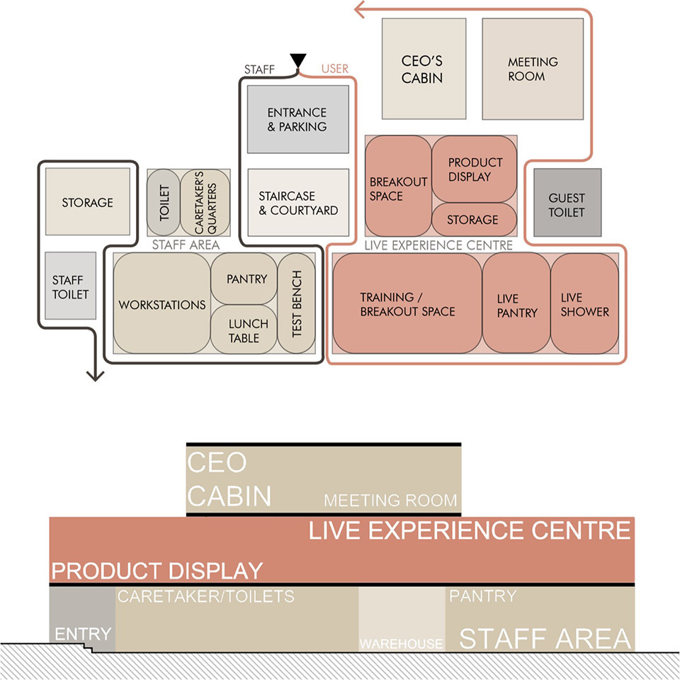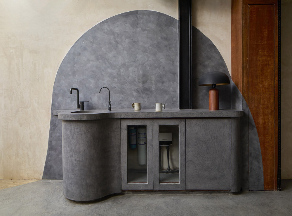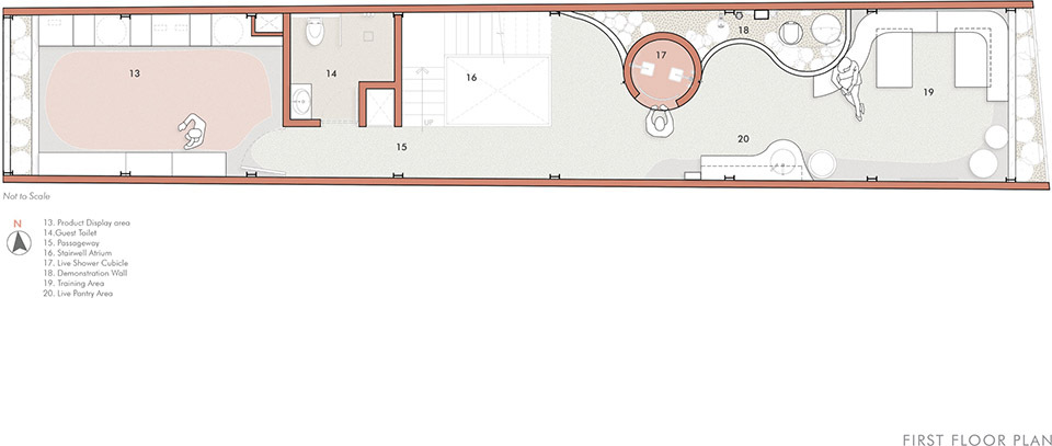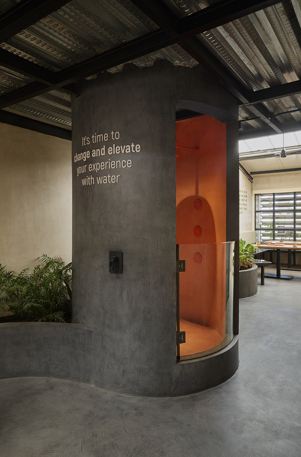 从入口的低调过渡,到中央楼梯的 “向上探索”,再到一层产品展示区的 “认知了解”,最后到顶层办公室与会议舱的 “俯瞰回望”,流线设计如同 “一场有节奏的旅行”。尤其在一层到顶层的移动中,蜿蜒的混凝土墙面引导视线不断转换,时而聚焦于淋浴展示间的赤陶光泽,时而转向窗外被遮掩的街景,让每一步移动都充满 “发现的乐趣”。一层客户体验区是空间的情绪高潮 —— 墙体由笔直转为流线,打破了狭长空间的线性单调;混凝土淋浴展示间内部泛着温润的赤陶色光泽,成为视觉焦点,既展示了产品功能,又营造出 “沉浸式的感官体验”;洽谈角落与混凝土咖啡吧的设置,让访客可在此停留休憩,透过间隙眺望 bazaar 街景,实现 “体验产品 — 感受空间 — 联结街区” 的多重互动,让商业体验不再是单纯的 “观看”,而是 “参与式的沉浸”。