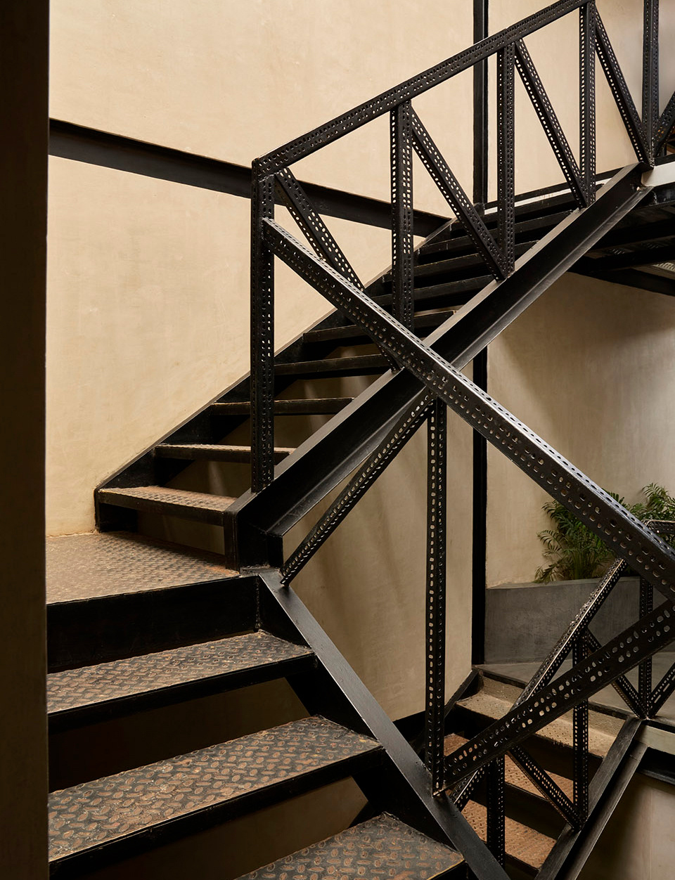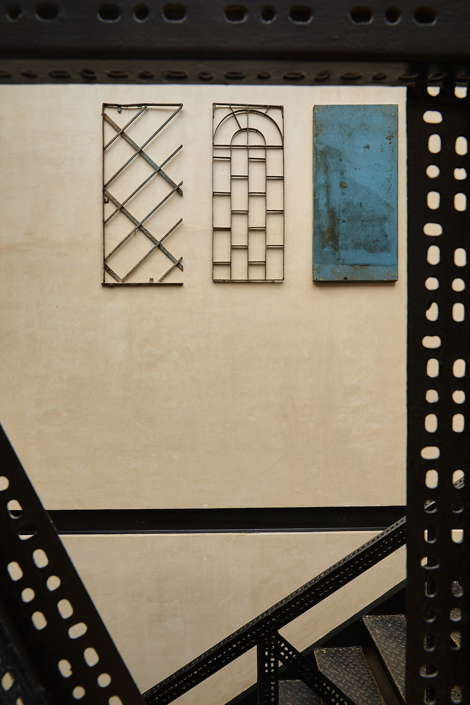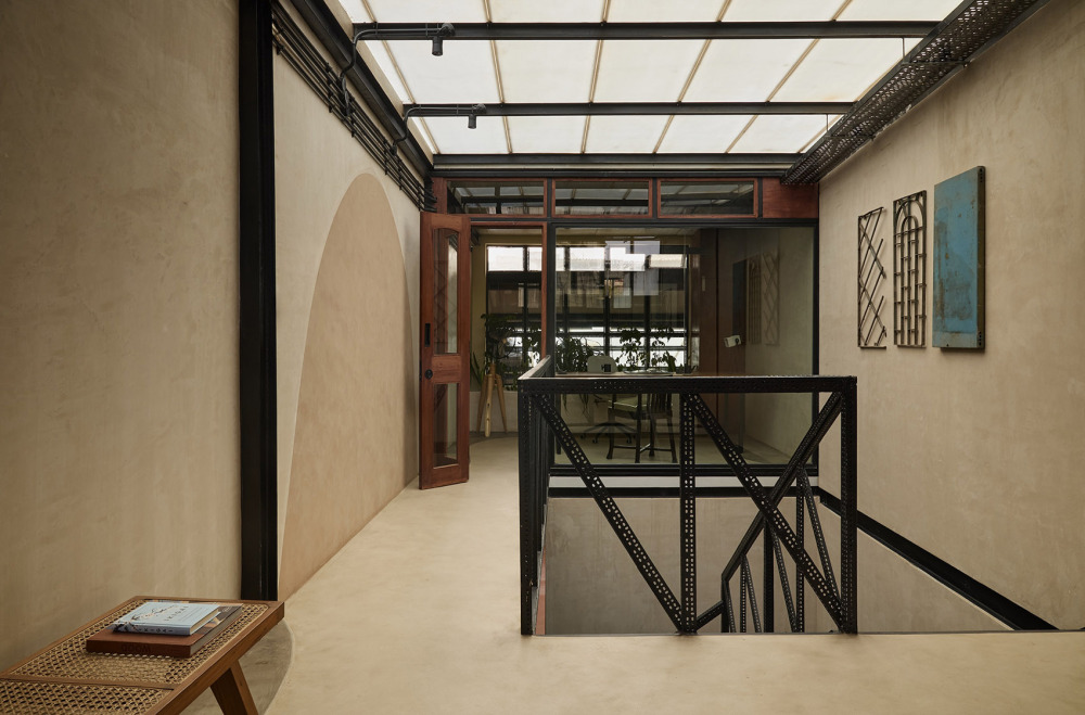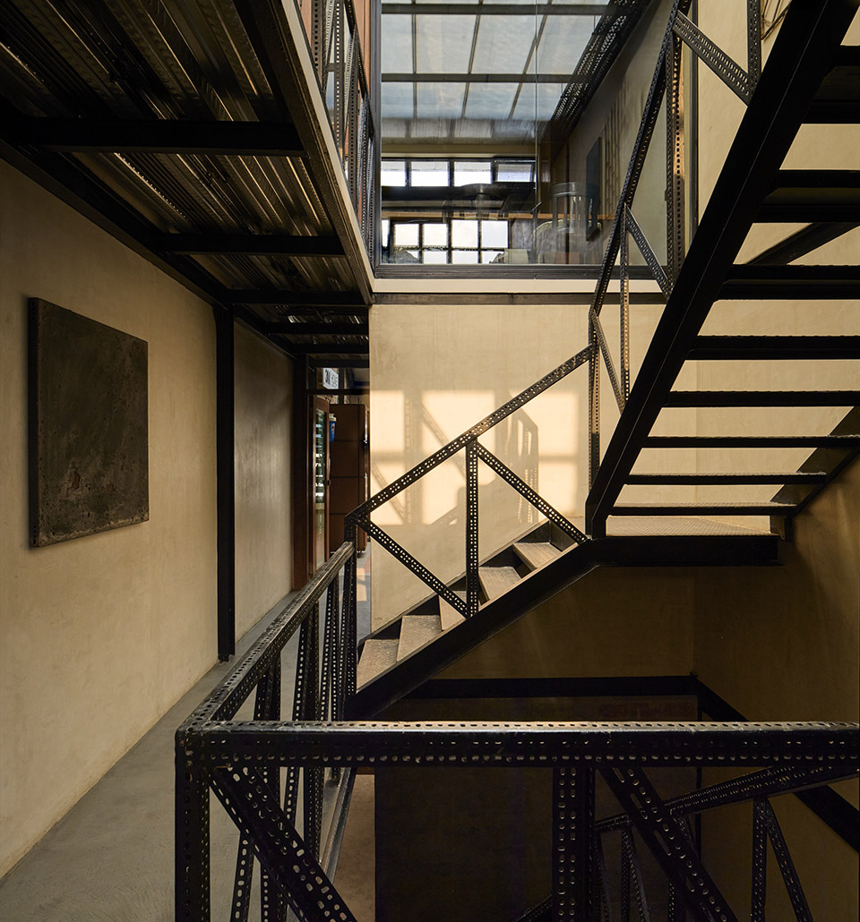 屋顶开设的天窗如同 “天空的眼睛”,让自然光成束洒入室内,照亮中央楼梯与展示区。光线在粗糙的墙面与地面上形成斑驳的光影,随时间流转不断变化,为狭长空间注入 “动态的生命力”。这种设计既解决了狭长空间自然光不足的问题,又让光影成为空间的 “隐形装饰”,让访客在不同时段感受到空间的多样气质。中央楼梯采用 MS 钢构穿孔件,其通透的结构让垂直空间不再封闭 —— 从底层可仰望顶层天窗,从顶层可俯瞰一层展示区,这种 “视觉穿透” 打破了楼层间的隔阂,让狭长空间在垂直维度上显得更为开阔。同时,楼梯的拼插式设计为空间增添了 “工业美学的轻盈感”,避免了传统楼梯的厚重感对空间的压迫,进一步强化了 “通透呼吸” 的氛围。