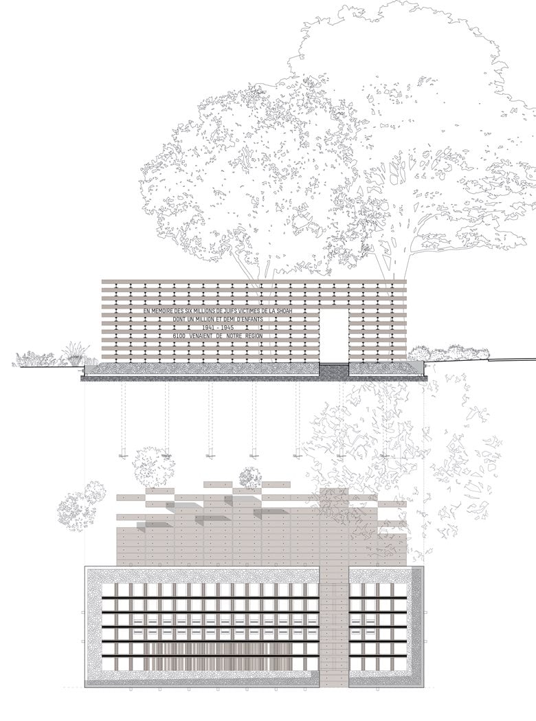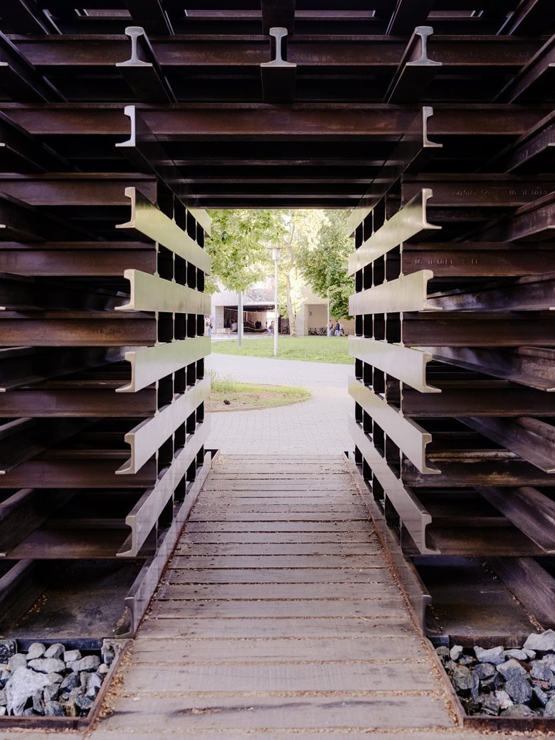 该纪念碑设计在里昂市中心,距离佩拉什车站仅几步之遥的地方 —— 昔日驱逐 convoy(押送队)就是从这里开启阴森行程的 —— 如今矗立着一座触动心灵、承载历史的纪念碑。这座名为 “记忆铁轨”(The Rails of Memory)的建筑作品极具感染力与冲击力,它远非一座普通的纪念设施:既是连接过去与未来的桥梁,更是将犹太人大屠杀(Shoah)遇难者记忆具象化的场所,以此确保这段历史永不消逝。