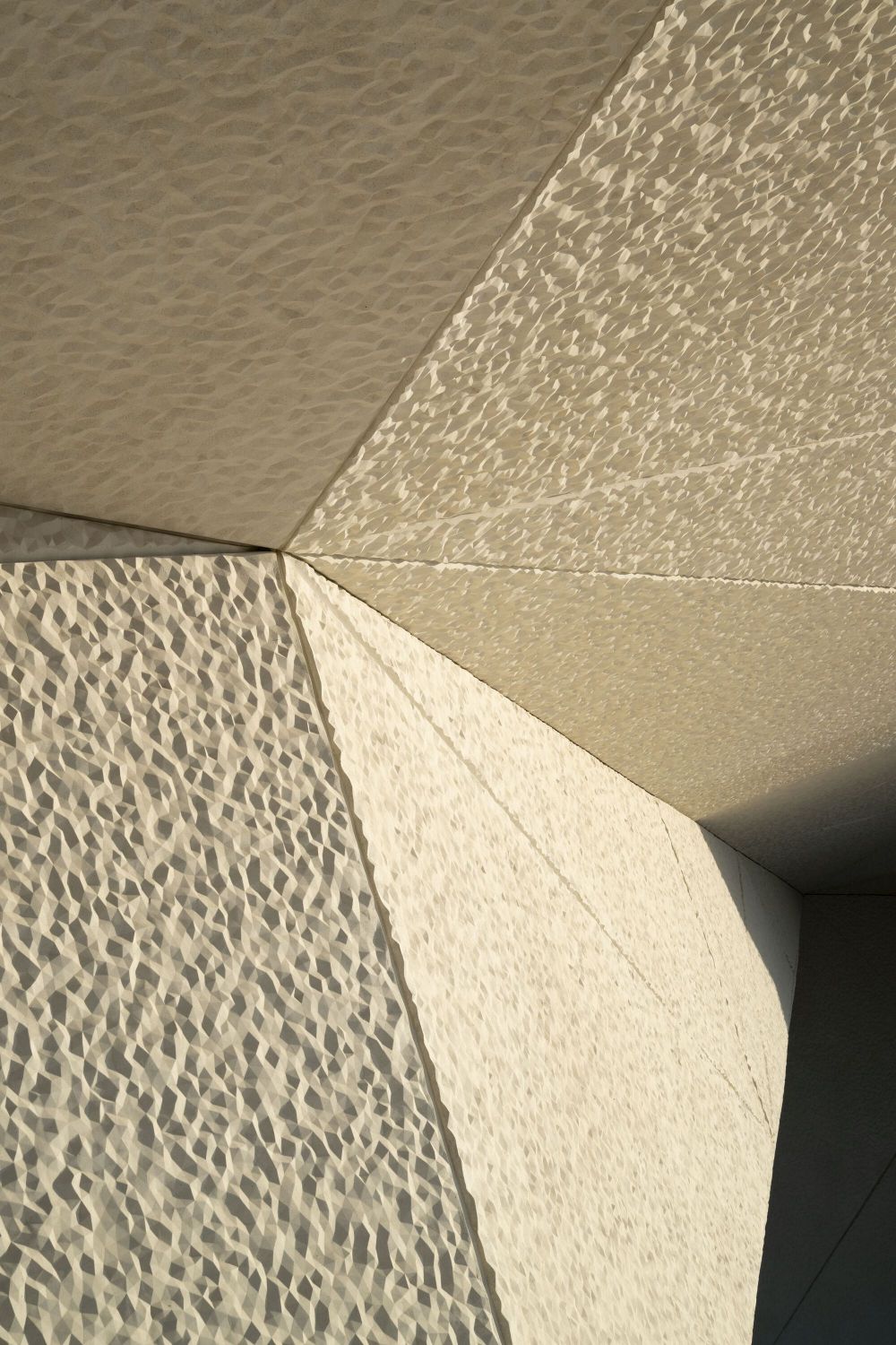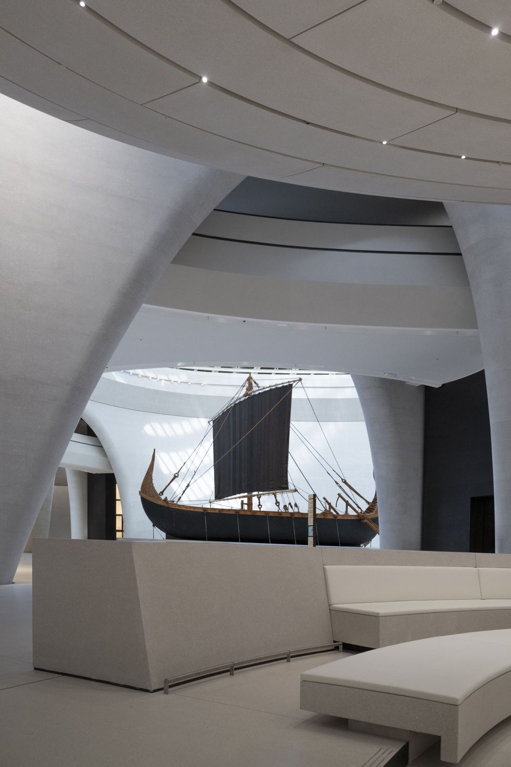 建筑材料的甄选,以“传承本土特色、适配沙漠环境”为核心原则。设计团队复刻了阿联酋七个酋长国传统建筑的材质质感,其色调随地域差异呈现出沙漠砂土的丰富层次;在此基础上,博物馆室内外空间均采用萨迪亚特岛特有的暖白色砂色调,让建筑与周边沙漠环境浑然一体,避免了突兀感。这种材质选择不仅体现了对本土文化的尊重,更具备实用价值——暖白色砂色调的饰面板与覆土丘体,能够有效反射太阳辐射,配合建筑的被动式降温系统,进一步提升了建筑的隔热性能;而钢翼采用的高强度钢材与玻璃幕墙,则保证了建筑在沙漠强风环境中的结构稳定性,实现了“美学、文化与实用”的三重统一。