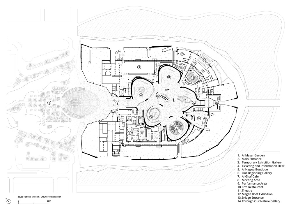 博物馆的文化与生态价值,进一步延伸至外部的阿勒马萨尔花园。这座花园寄托了谢赫·扎耶德对自然的热爱,将景观设计与文化遗产相融合,实现了“建筑与海岸、自然与社区的无缝衔接”。花园不仅是博物馆的配套景观,更是全新的社区公共空间,为人们提供社交、游乐与冥想的场所,让博物馆从“封闭的文化殿堂”转变为“开放的社区枢纽”。花园中的绿荫步道是连接建筑与自然的纽带。访客可从一层拾级而上,抵达覆土丘体顶端、钢翼塔楼底部的观景平台,在此饱览周边的海岸与城市全景,感受建筑与环境的共生之美。这种“建筑—花园—观景台”的空间序列,让访客的体验从室内的历史叙事,延伸至室外的自然与城市景观,形成“历史—文化—自然”的完整体验闭环。