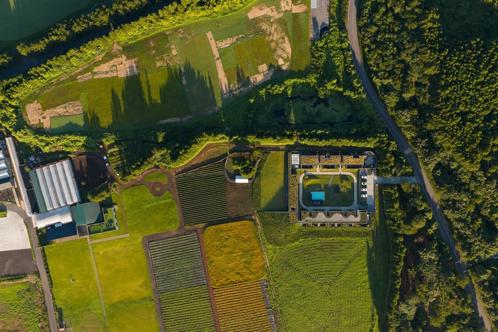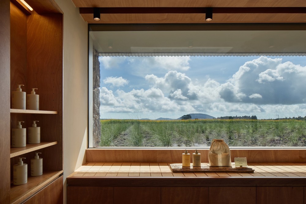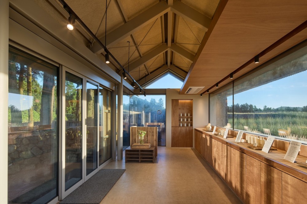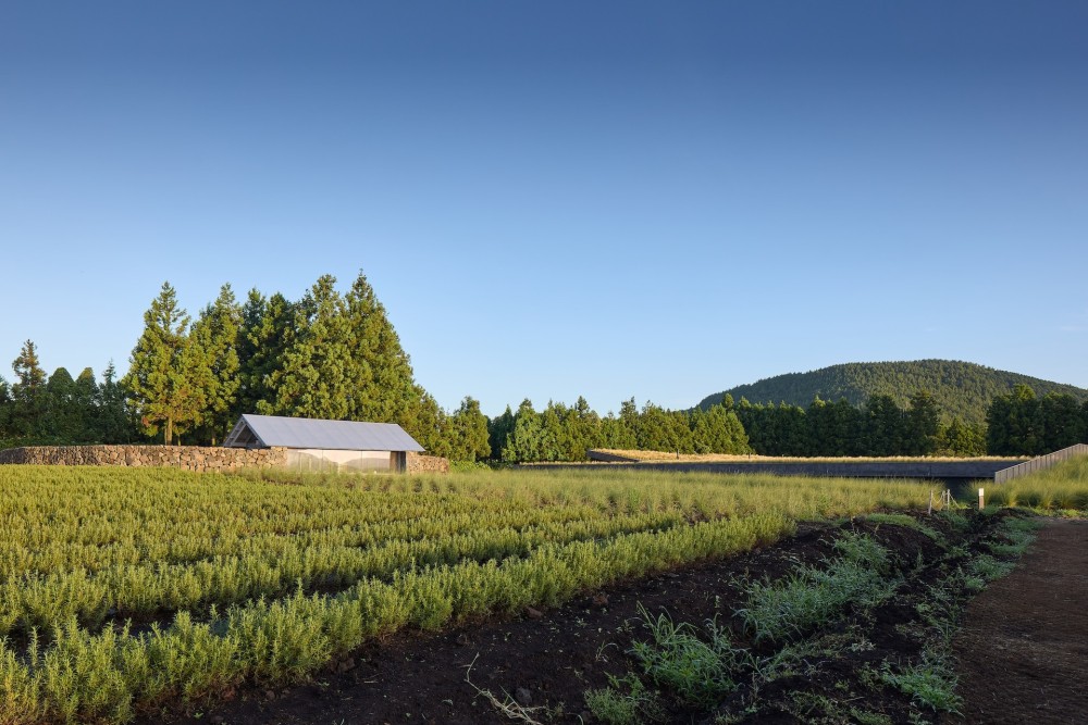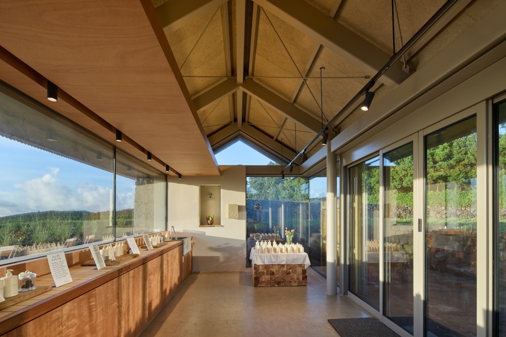 博伦瓦展厅的设计命题,始于品牌与场地的深度联结。品牌以“济州岛本土自然种植的农产品与园艺作物”为原料核心,而展厅选址恰好坐落于博伦瓦团队耕耘十余年的自然园地旁——这片可俯瞰原生景致的山坡,以及坡上的“宿营囊”杉树林,本身就是品牌“自然、耕耘、传承”理念的最佳注脚。因此,设计的核心并非“打造一座展厅”,而是“让空间成为场地与品牌的共同叙事者”。8坪的狭小建筑面积,反而催生了“突破物理边界”的设计思路。设计团队明确:空间不应局限于室内,而需以开放式结构与杉树林、田野浑然相融,向外延展。这种“以小见大”的逻辑,既契合博伦瓦“从本土作物中萃取精华”的品牌特质,又尊重了场地的原生肌理——正如品牌从济州土地中获取养分,展厅也从这片山坡上生长而出,成为土地与品牌的桥梁。