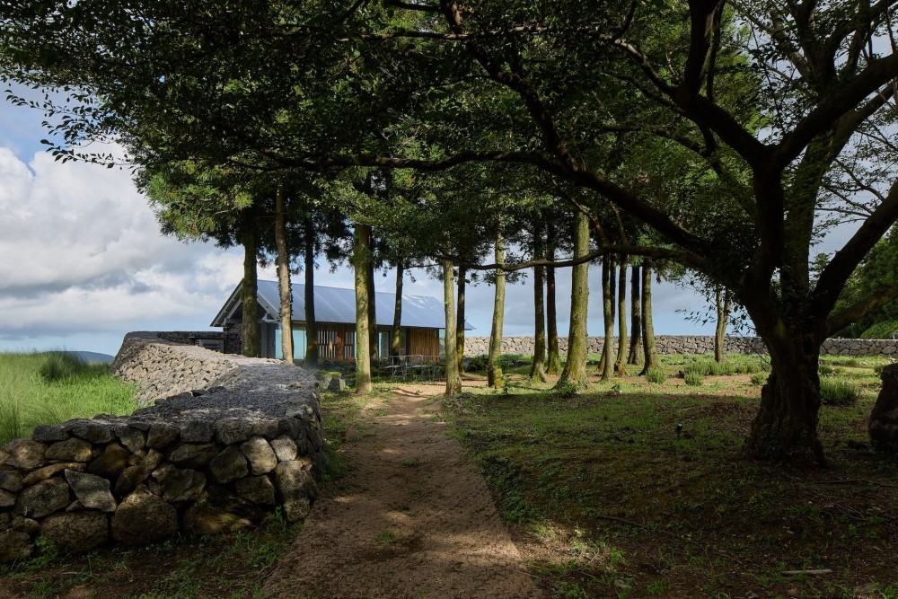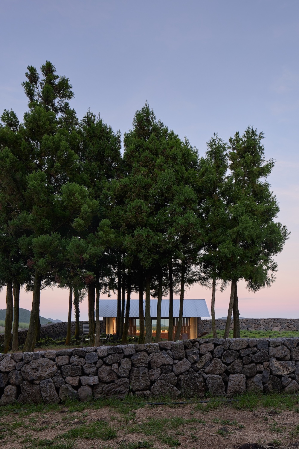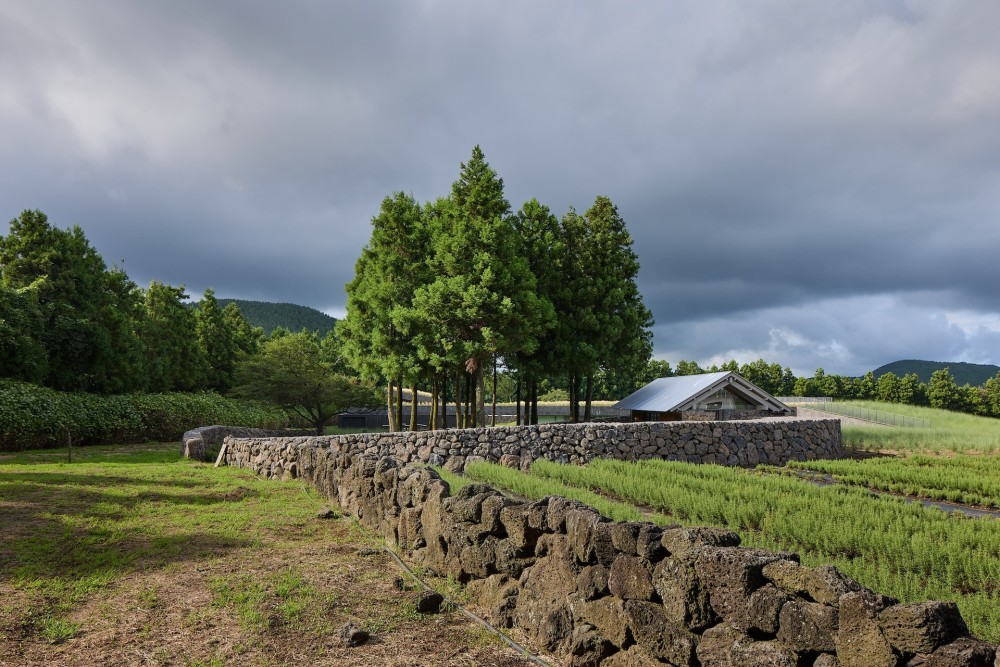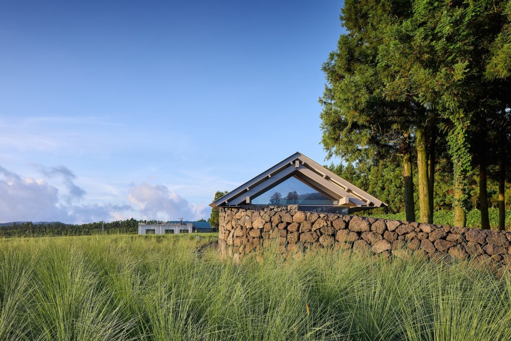与多数建筑“先定框架,再做装饰”不同,博伦瓦展厅的设计原点是“石墙”——这一承载济州岛千年农耕文明的建筑元素,被设计团队视为空间的灵魂。济州岛中山间田野,留存着两类典型石墙遗迹:一是“松子墙(松子城)”,宽厚粗犷的墙体与不规则石块,曾是牧场的拦马围挡;二是“泥浆”,农田中随意堆积的石堆,记录着先民开垦耕地时收集碎石的痕迹。这两种石墙的形态特质,共同构成了展厅的设计基因。设计团队没有对石墙进行“符号化复刻”,而是完成了“功能与精神的双重转译”。施工过程中,团队并未遵循固定图纸,而是在现场对石墙的宽度、倾斜角度与石块排布进行精细化调整:借鉴松子墙的“宽厚粗犷”,让墙体具备结构支撑力的同时,传递出牧场围挡的厚重质感;融入“泥浆”石堆的“自然随性”,避免石块排列的规整刻板,还原先民劳作时的质朴状态。这种“现场调整”的施工方式,让石墙脱离了“装饰”属性,成为“可触摸、可感知”的济州文化载体——当访客穿行于杉林间,指尖划过石块的粗糙肌理,便能自然沉浸于中山间的石墙文化,感知场地独有的历史底蕴。