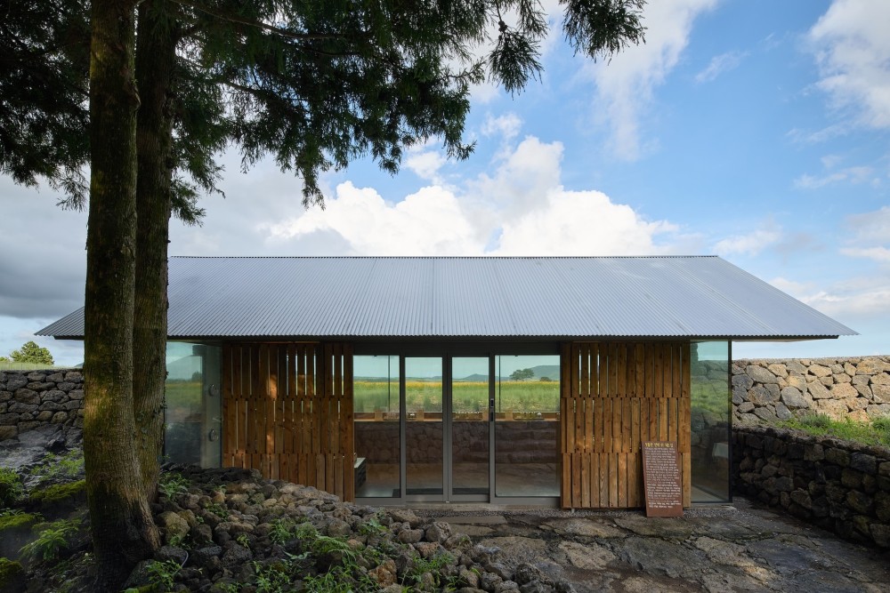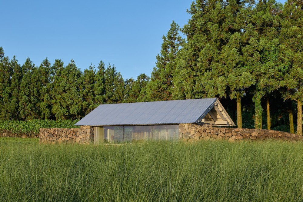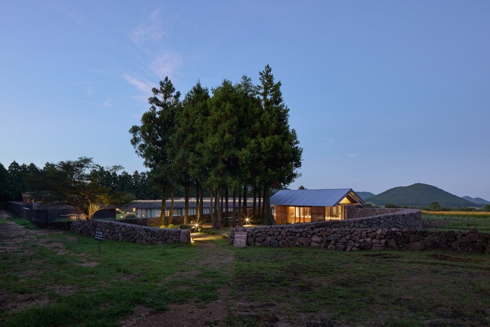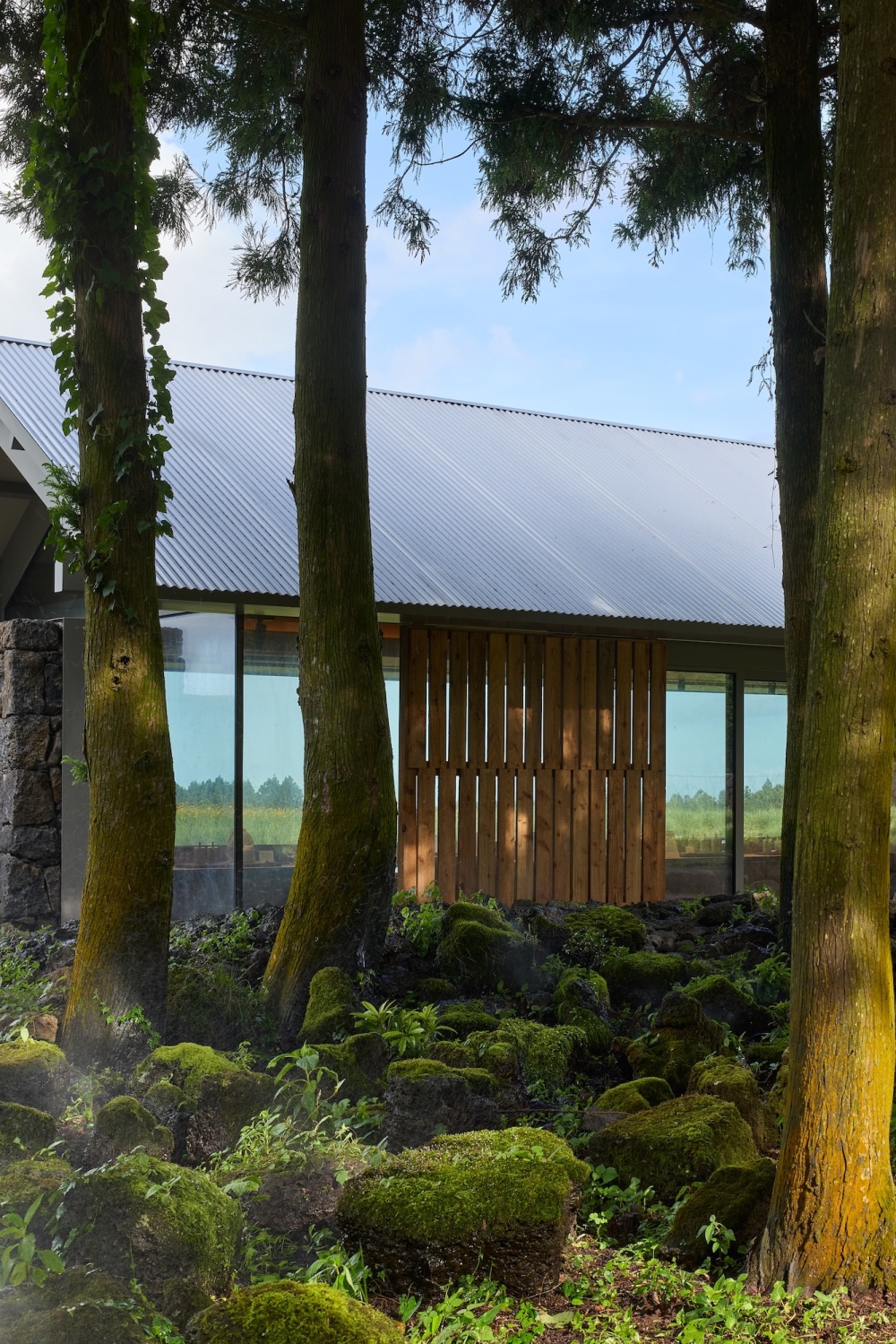 与多数建筑“先定框架,再做装饰”不同,博伦瓦展厅的设计原点是“石墙”——这一承载济州岛千年农耕文明的建筑元素,被设计团队视为空间的灵魂。济州岛中山间田野,留存着两类典型石墙遗迹:一是“松子墙(松子城)”,宽厚粗犷的墙体与不规则石块,曾是牧场的拦马围挡;二是“泥浆”,农田中随意堆积的石堆,记录着先民开垦耕地时收集碎石的痕迹。这两种石墙的形态特质,共同构成了展厅的设计基因。设计团队没有对石墙进行“符号化复刻”,而是完成了“功能与精神的双重转译”。施工过程中,团队并未遵循固定图纸,而是在现场对石墙的宽度、倾斜角度与石块排布进行精细化调整:借鉴松子墙的“宽厚粗犷”,让墙体具备结构支撑力的同时,传递出牧场围挡的厚重质感;融入“泥浆”石堆的“自然随性”,避免石块排列的规整刻板,还原先民劳作时的质朴状态。这种“现场调整”的施工方式,让石墙脱离了“装饰”属性,成为“可触摸、可感知”的济州文化载体——当访客穿行于杉林间,指尖划过石块的粗糙肌理,便能自然沉浸于中山间的石墙文化,感知场地独有的历史底蕴。