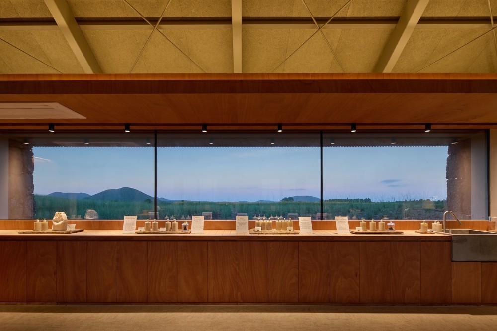 博伦瓦展厅的空间叙事,始终围绕“石墙”展开,实现了“地域文化与品牌故事”的同频共振。石墙的“厚重与质朴”,呼应着济州岛先民的耕耘智慧;而石块的“自然形态”,则与博伦瓦“萃取本土自然原料”的品牌核心形成呼应——正如先民从土地中获取生存资源,博伦瓦从济州土地中获取产品养分,石墙成为了这种“土地依存关系”的具象表达。开放式的空间设计,让品牌故事的传递更具温度。展厅没有设置封闭的展示墙,而是将博伦瓦的发展故事融入石墙与环境的对话中:访客在杉林间触摸石墙时,便能联想到品牌十余年的耕耘;在展厅远眺农场时,便能直观理解“原料源自本土”的品牌承诺。这种“不说教的叙事”,比室内展板更具感染力——空间本身就是品牌理念的最佳诠释。