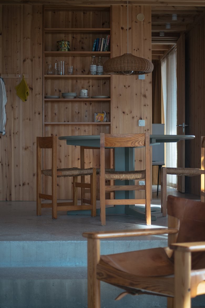 其立面采用定制抹灰表面和原始木柱,与低矮的松树和周围柔和的色调相得益彰。景观的灰色调延伸至室内,当地石材的大块碎片被精心嵌入混凝土地面。金色的松木包覆墙面营造了室内的氛围。在完美的矩形屋顶下,平面布局灵活多变。功能区域分布在整个场地,间隙空间的设计将新旧、室内外以及自然与建筑巧妙交织。