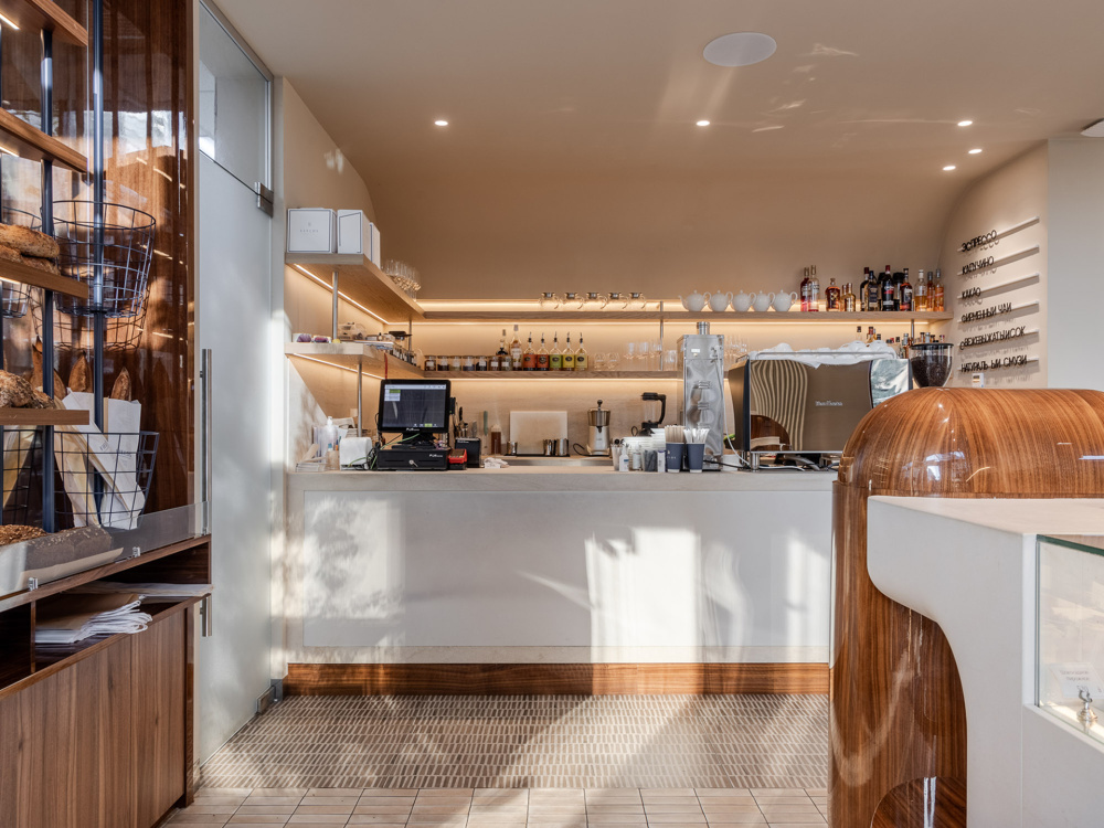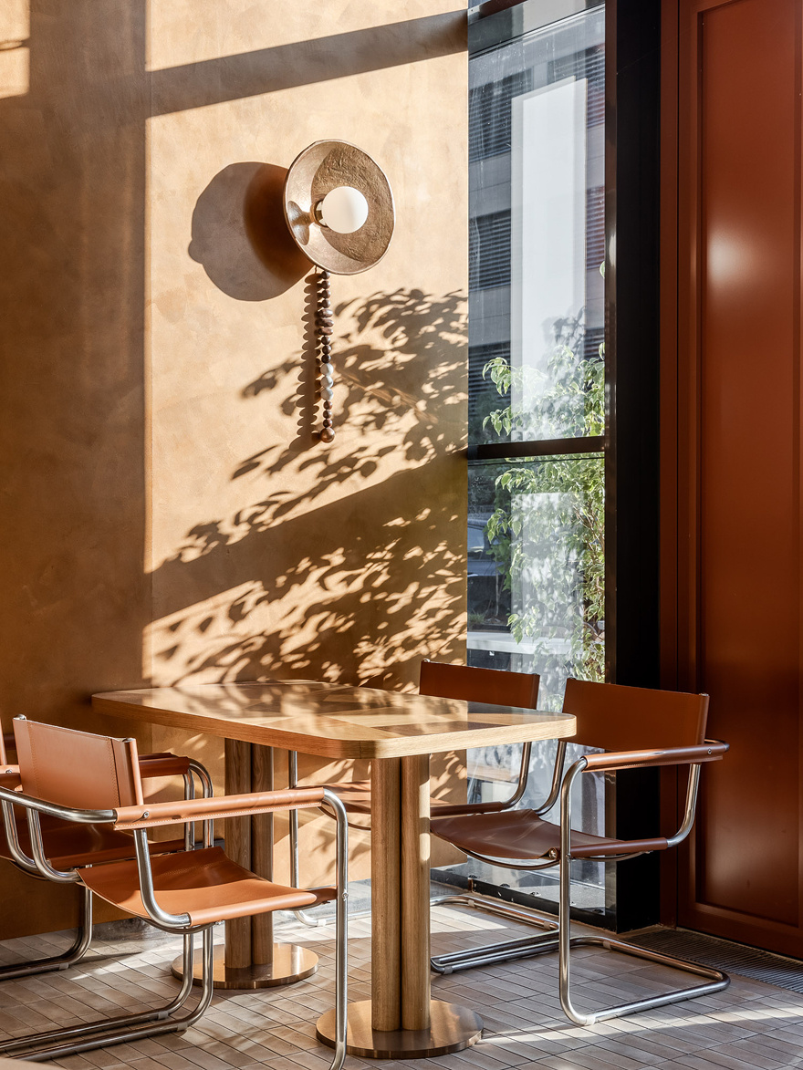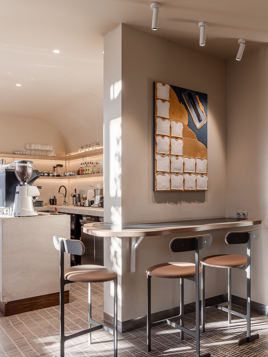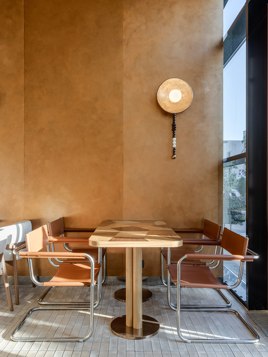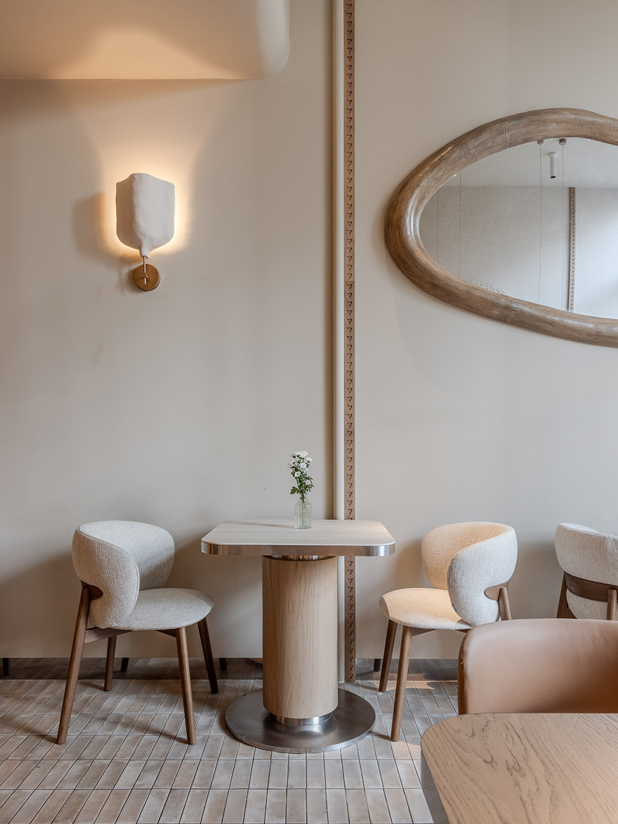 门店的 “烟火感”,从街道便已开始:通透的玻璃界面没有刻意遮挡,路人能清晰看见厨房工作人员烘焙面包的身影 —— 这是顾客的核心诉求,也是设计的叙事起点。玻璃如同 “生活的取景框”,将后厨的忙碌与街道的日常连接:当面包的麦香随蒸汽漫出,路人的视线与烘焙师的动作相遇,空间便提前完成了 “温暖的预告”。而进入室内,这种烟火感并未被 “精致设计” 消解,反而以材质的温度持续延伸:浅米色的墙面带着手工抹涂的肌理,如同刚出炉的面包表皮;地面的细长陶砖以细密的排列,呼应着面团发酵的纹理,让空间从视觉到触觉,都与 “烹饪的温度” 形成隐性共鸣。