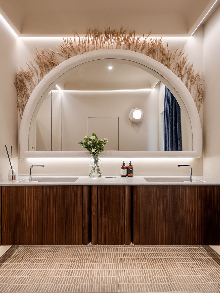 家具与细节:餐桌的木质台面保留了木材的自然纹理,边缘的圆弧处理如同手工打磨的温柔;吧台的弧形柜体以流畅的曲线,呼应着面包的松软形态,而柜面的手工金属把手,又以细腻的光泽,为空间注入精致的层次。