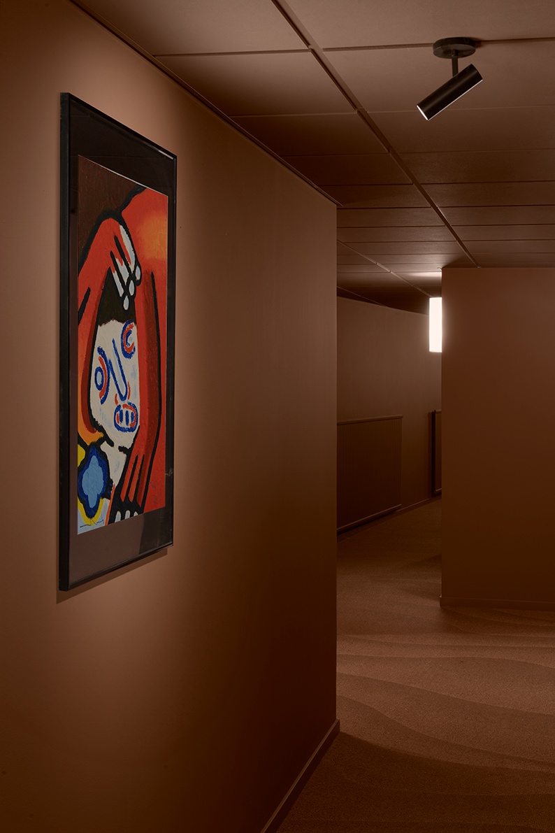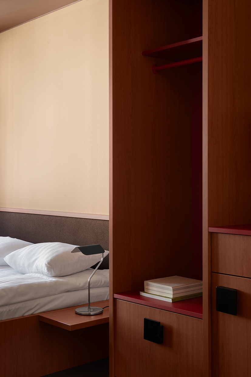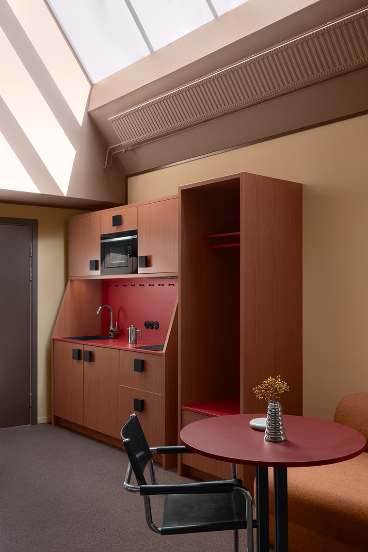 设计通过 “内外反差”“公共与私密反差”,为酒店赋予层次分明的空间韵律,同时兼顾功能实用性:外观与室内的氛围融合:建筑外立面延续老酒店的粗犷质感,线条沉稳、色调内敛,传递出斯德哥尔摩建筑特有的 “低调厚重”;而室内则切换为 “活力乐观” 的氛围,大胆的色彩块面、灵活的家具组合,让空间瞬间摆脱老建筑的刻板印象,形成 “外敛内活” 的独特张力,精准契合现代斯德哥尔摩 “沉稳中藏活力” 的城市气质;公共与私密的节奏切换:公共区域的走廊采用单色设计,以简洁的色调、利落的线条引导动线,营造出 “安静过渡” 的秩序感;而进入单间公寓后,氛围即刻转变 —— 俏皮的色彩、温馨的居家陈设扑面而来,形成强烈的视觉反差。这种 “先抑后扬” 的空间节奏,让入住者从公共区域进入私密空间时,能快速切换情绪,感受到 “从公共秩序到居家松弛” 的舒适过渡。