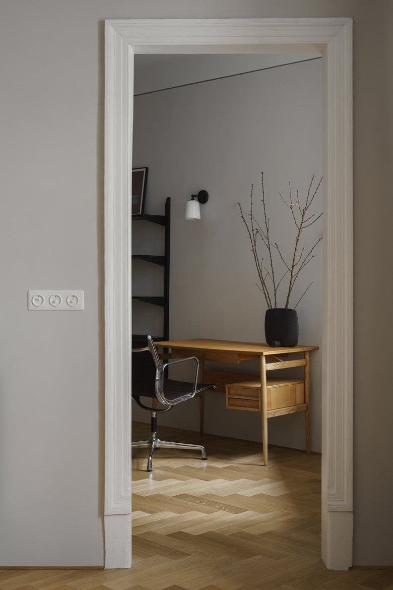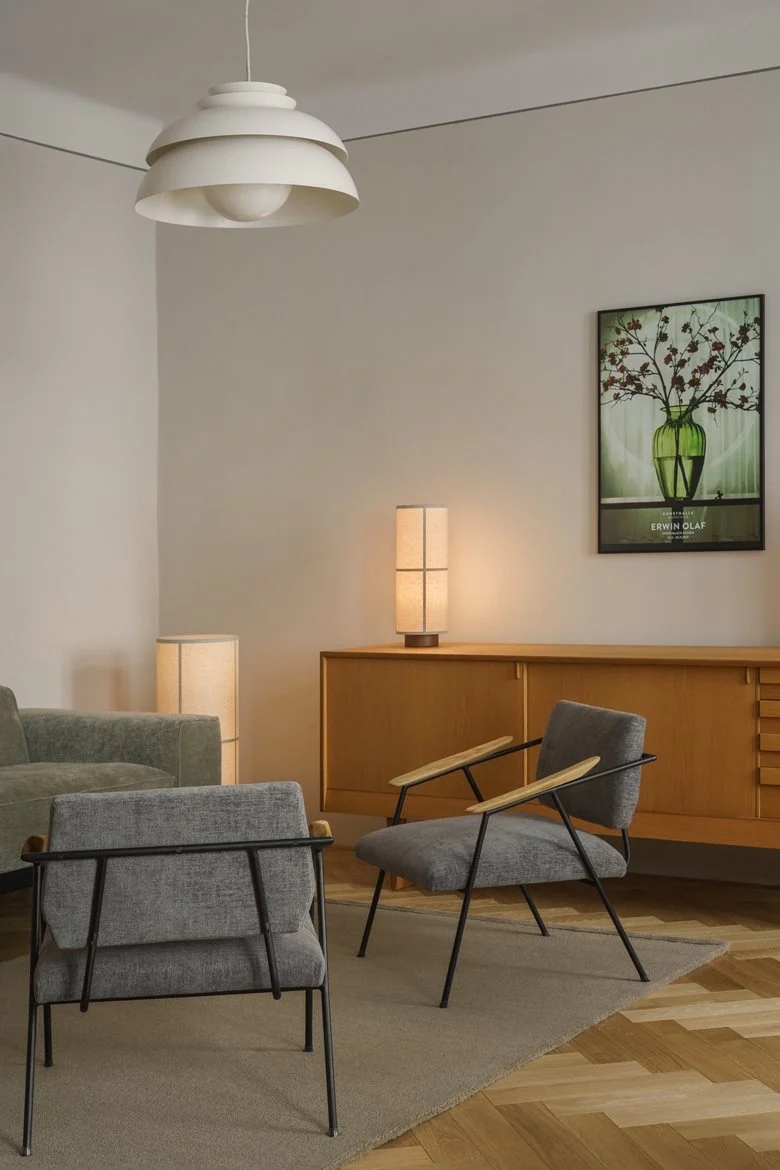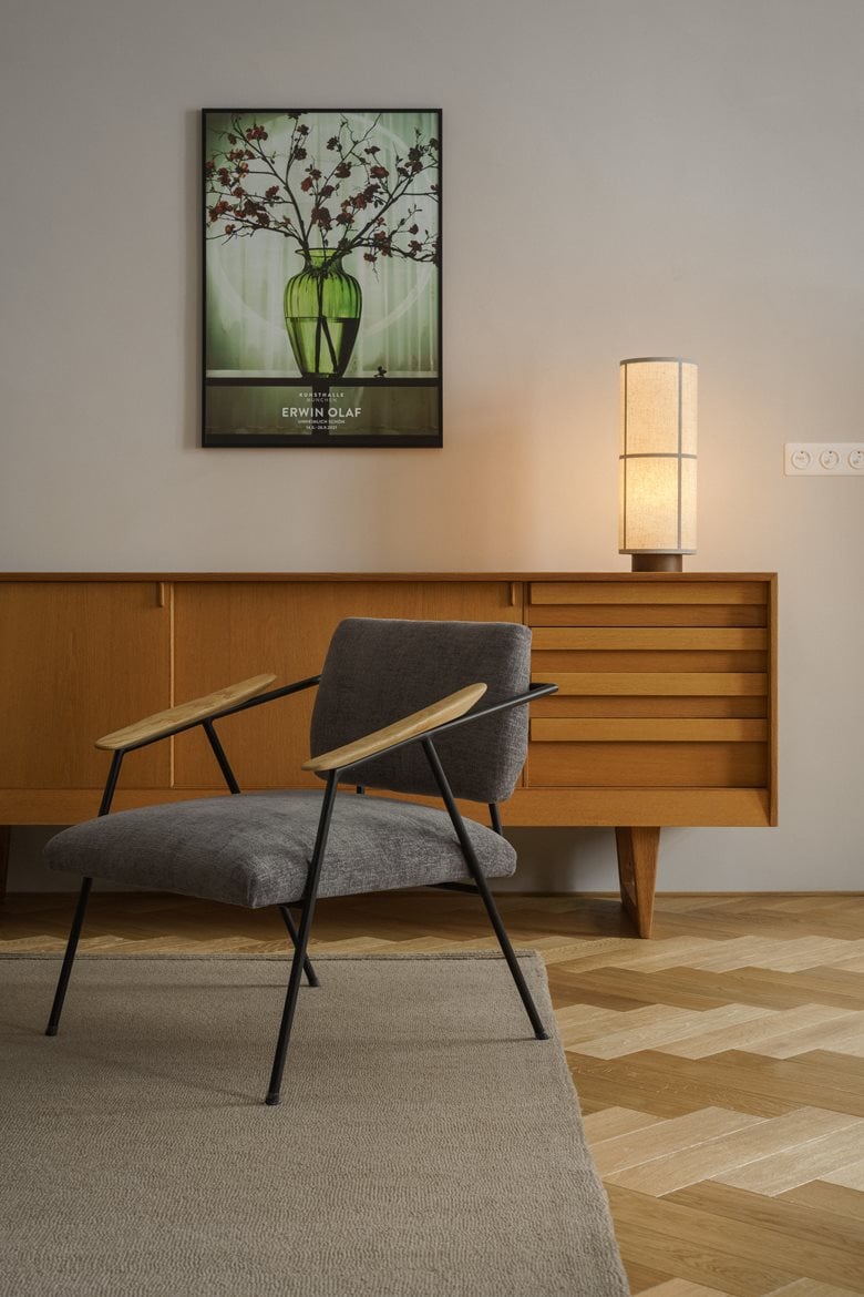 此外,我们还收集了一系列家具、灯具和配件,主要出自丹麦、捷克和波兰设计师之手。在这些家具和灯具中,有几件来自复古市场。这些家具均经过了专业的木工和软装翻新。公寓设施中一个有趣的元素是一对极为罕见的收藏级扶手椅,它们生产于 20 世纪 50 至 60 年代之交。客厅的墙面装饰采用了一张欧文・奥拉夫(Erwin Olaf)展览的海报。