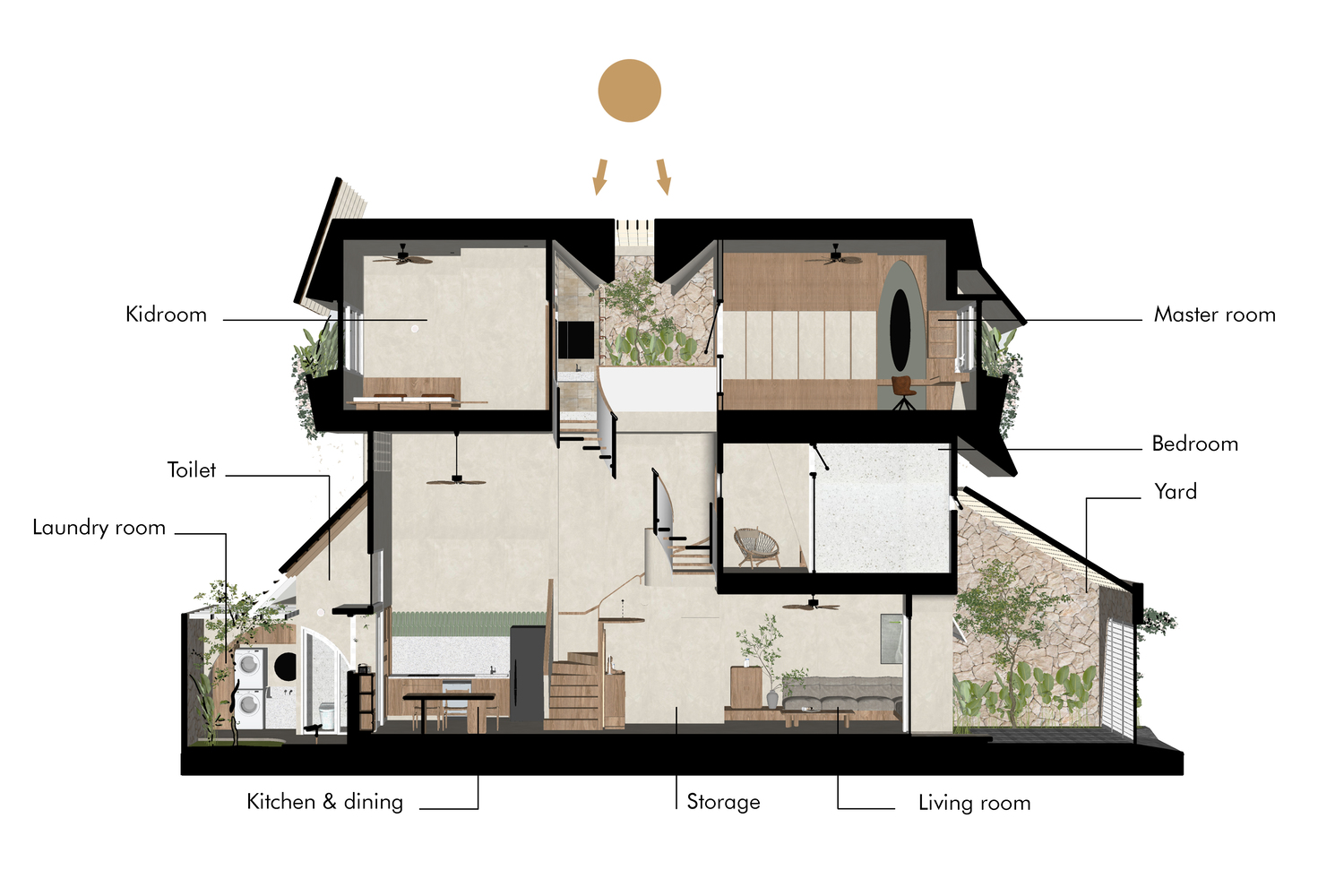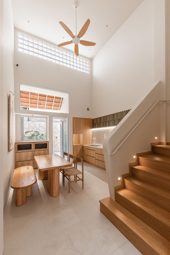 该房屋采用质朴简约的设计风格,采用原材料,给屋主带来温暖和放松的感觉。独具匠心的天窗既能透过自然光,又能增强通风效果,是热带气候下狭窄筒式房屋的理想解决方案。
