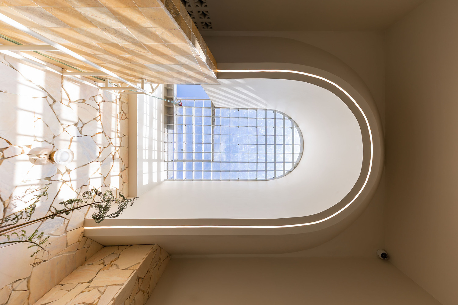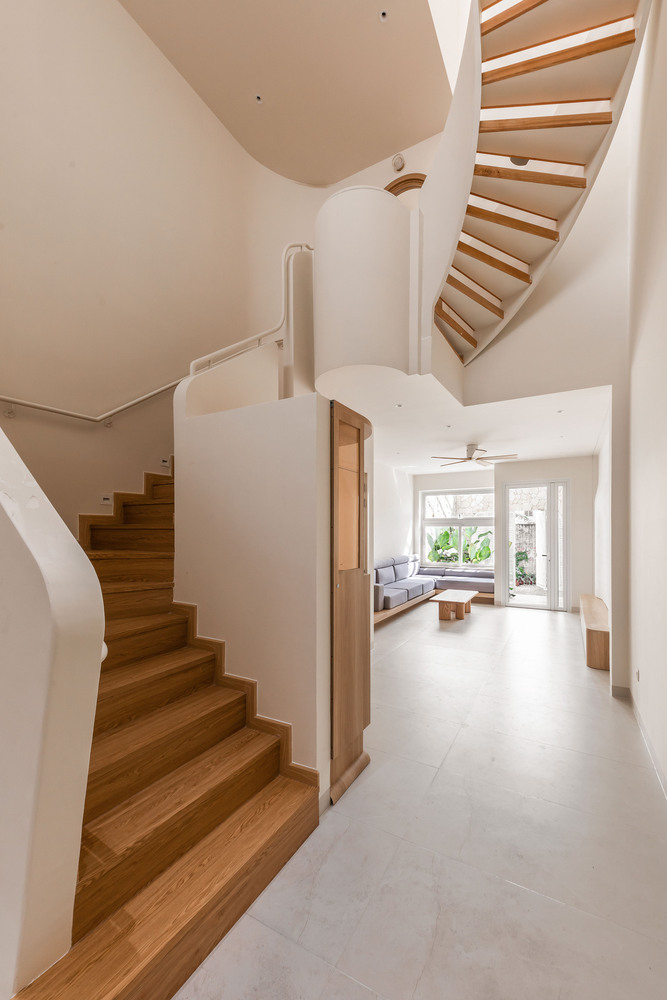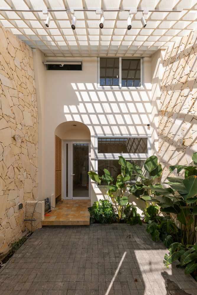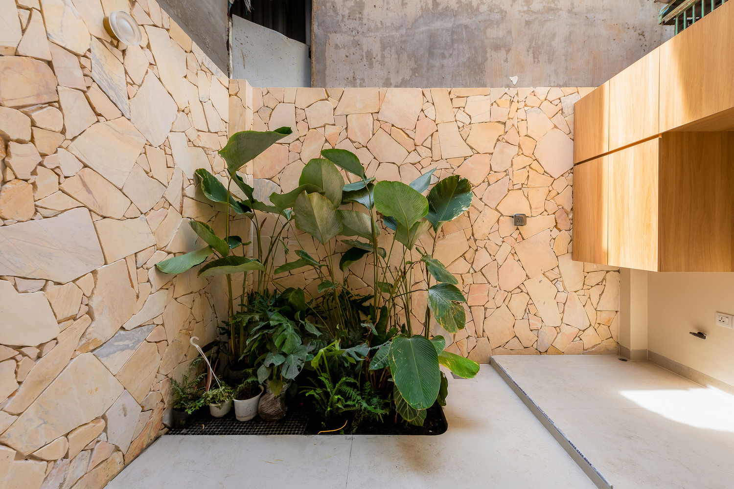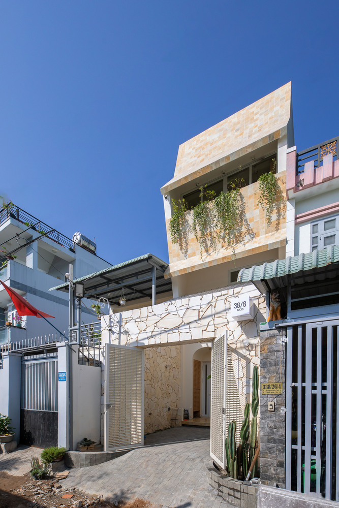 由天然石块砌成的入口大门就像一座坐落在西贡市中心的堡垒。折纸屋完美融合了石瓦外墙、折叠元素、自然采光和通风以及原始质感的室内装饰,是热带住宅的理想建筑方式。