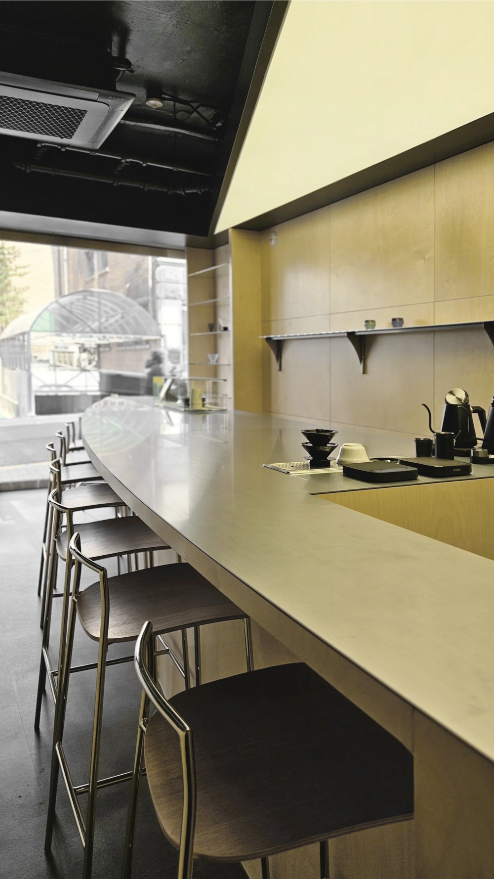 客户的愿景简洁却深刻:打造一个能让 “交流自然发生” 的场所。OA 工作室没有一味追求座位数量的最大化,而是围绕 “开放性” 与 “互动性” 构建空间布局。实现这一设计的关键,在于咖啡馆的标志性元素 —— 吧台中央特意开凿出的方形空缺区域。在这个凹陷区域内,咖啡师被顾客环绕其中,制作咖啡时能与顾客正面相对。这个设计看似简约,却带来了颠覆性的体验:它打破了物理空间的隔阂,营造出一种温暖的、符合人体尺度的互动氛围。顾客无需面对传统吧台的拘谨感,既能观赏咖啡制作的全过程,还能与咖啡师交流,甚至参与到咖啡制作的仪式中。