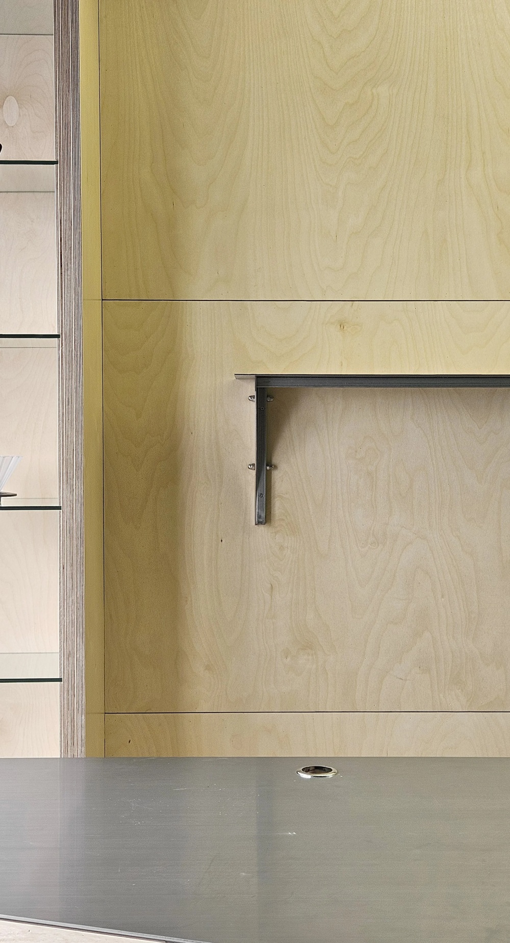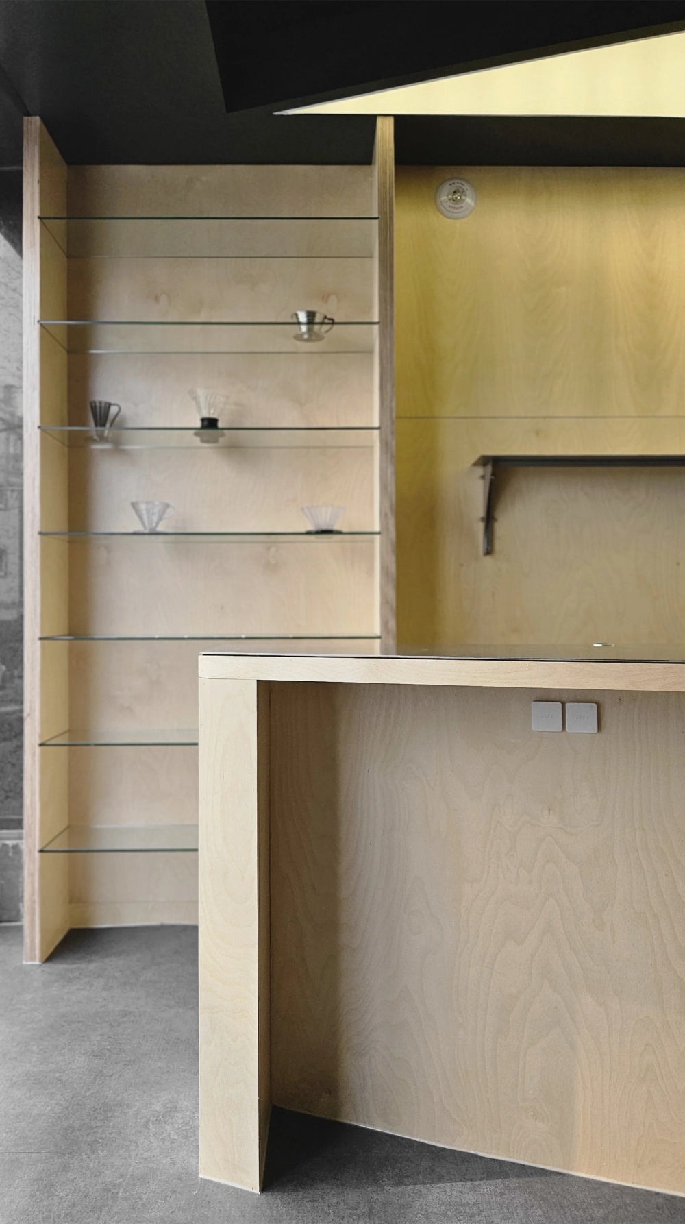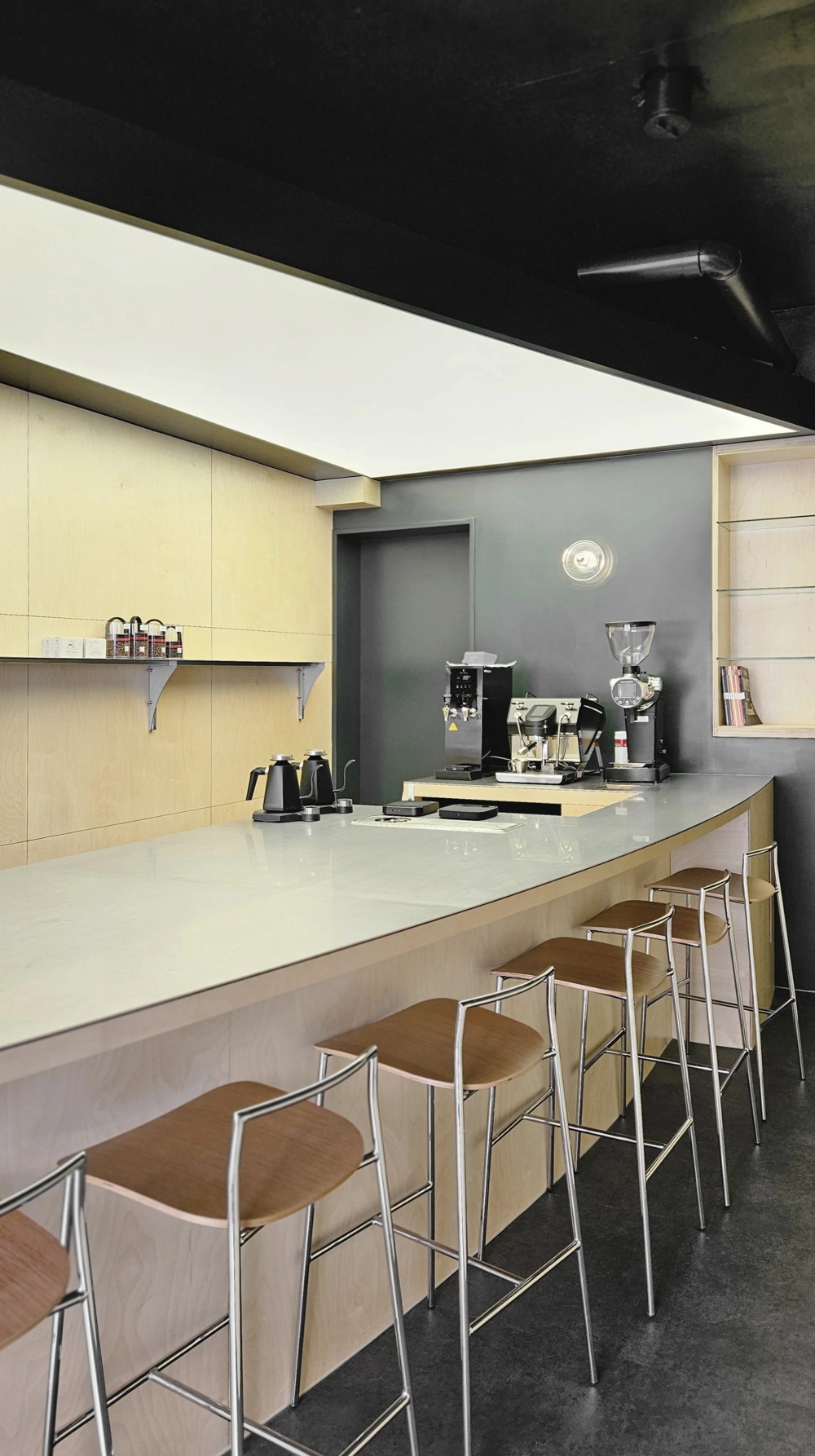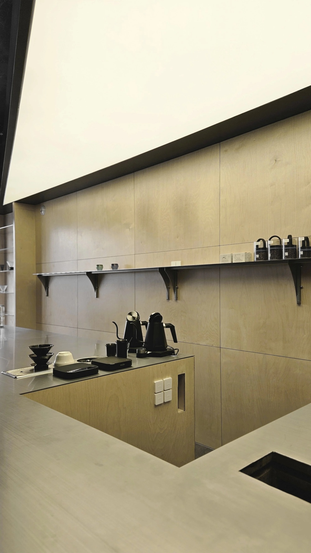 通过单一且连贯的光源设计,OA 工作室营造出了宁静、平衡的氛围,让空间的材质本身成为视觉焦点。柔和的光线凸显了桦木胶合板的触感温度,也让不锈钢的低调光泽更加明显,进一步强化了咖啡馆内敛优雅的气质。整体而言,“圆环形” 咖啡馆给人的感觉更像是一个公共客厅,而非传统的商业咖啡馆 —— 在这里,制作咖啡与分享咖啡的过程,都成为了一种共享的体验。其设计风格自信却不张扬,核心是对客户价值观的真诚回应,而非对视觉潮流的盲目追随。