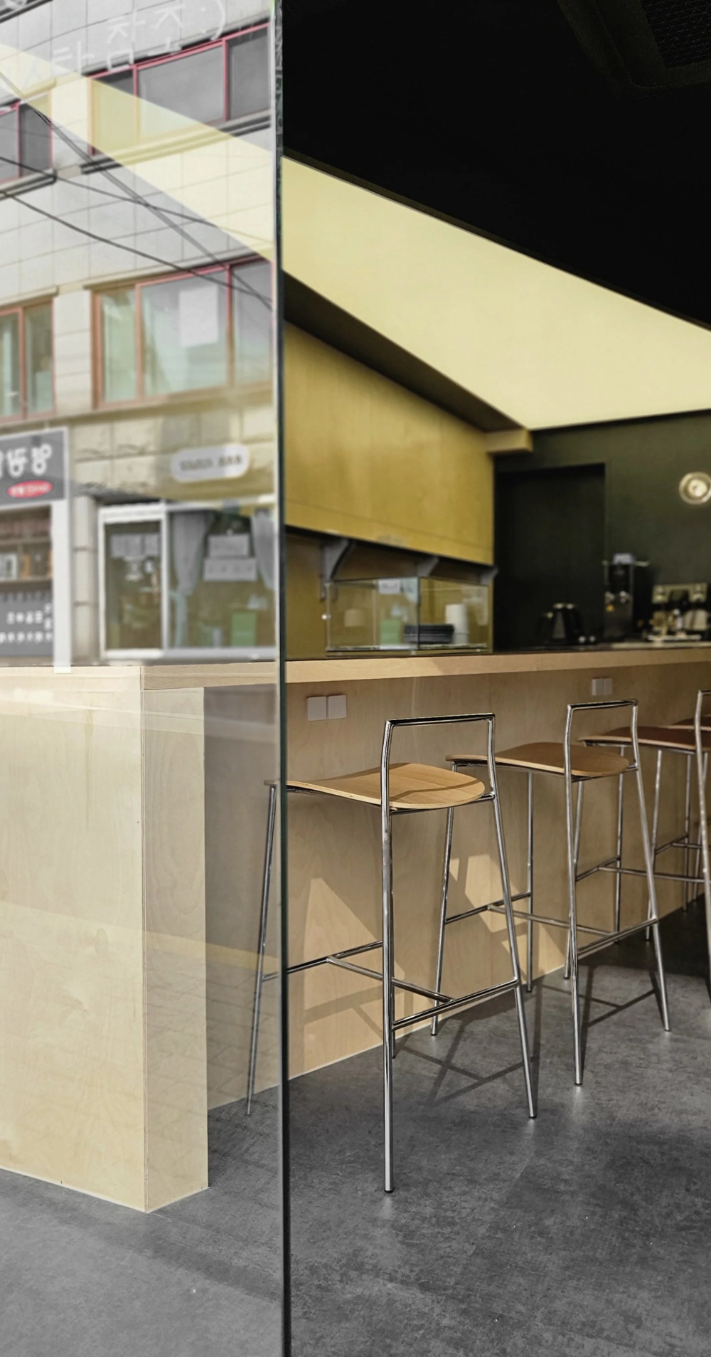 正如工作室所阐释的,这一设计概念源于店主自身的理念:将 “交流” 置于一切之上。设计师表示:“店主希望能真正‘走进’吧台内部,与顾客距离更近。” 这种通过空间设计具象化的 “亲近感”,成为了 “圆环形” 咖啡馆的核心标识。为呼应咖啡馆的 “圆环形”(Round Circle)之名,店内的中央桌(同时兼具共享工作台的功能)采用了柔和且连贯的曲线设计。这张桌子由桦木胶合板打造而成,既具备结构上的实用性,又传递出情感上的温暖感。选择桦木并非偶然:其浅色调与富有触感的木纹能营造出宁静氛围,与咖啡馆所在的居民区环境相得益彰。