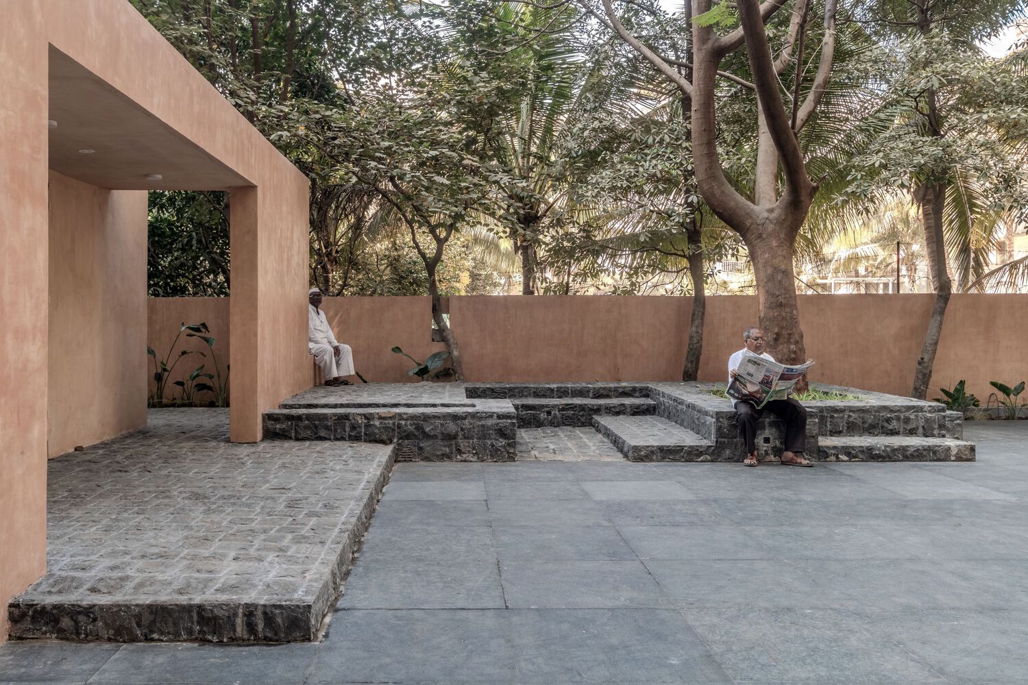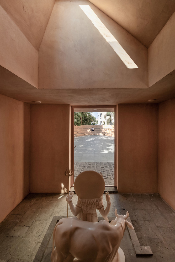 在寺庙主体之外,一个带有露天剧场的大型开放区域提升了空间的功能性。这个区域可用于举办社区活动、文化集会和宗教讲座,促进社会和谐。为了使设计更贴合当地环境,设计师巧妙地融入了马哈拉施特拉邦的建筑元素。比如利用平台(otta)、门槛(par)和类似阳台的空间(osari)在树周围打造座位,既增添了传统韵味,又为游客提供了阴凉的休憩场所。