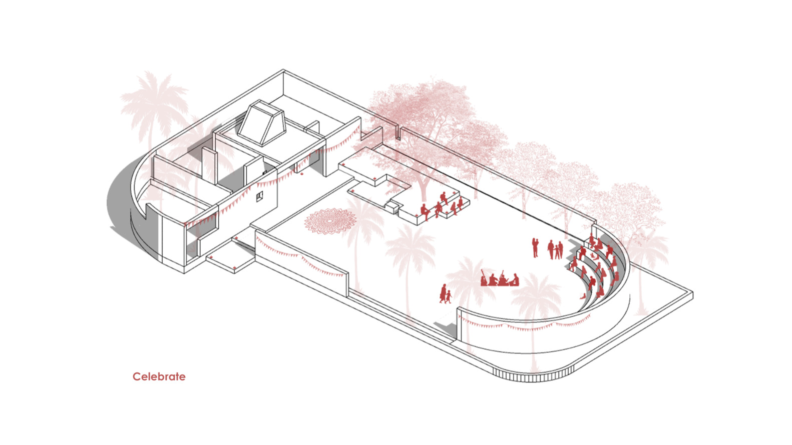 该提供宗教和社区功能为一体的中心设计是由于新的住宅项目,现有神社需要搬迁,这为设计一个能将传统与当代需求无缝融合的空间提供了契机。这块 400 平方英尺的场地,不仅被设想为供奉当地神灵达塔勋爵的神社,还被规划成一个充满活力的社区空间,以促进人们之间的联系和团结。