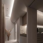 一个极简而优雅的楼梯将患者引至楼上的休息室,设计师在二层地板的平面设置了窗口,这个小窗口加强了两个层之间的视觉联系,并给二层休息室带来一个穿光灯光俯瞰的视角。从诊所入口的视角来看,二层等候室的窗口又是非常重要的元素,它的位置恰好会吸引目光,一个微微抬头的动作让患者自然的感知到挑高空间。在治疗室中,患者座椅面朝窗外的植被,设计师希望借助外界变化,哪怕是被风吹动的树叶来分散患者的注意力,减少由于过分专注治疗本身所引起的任何不愉快的感觉。