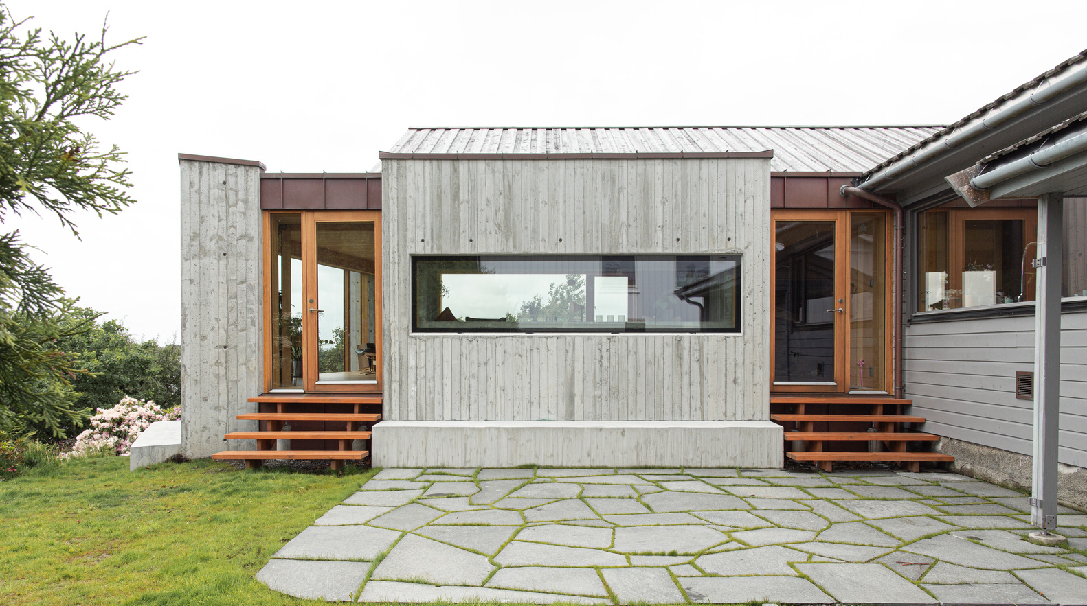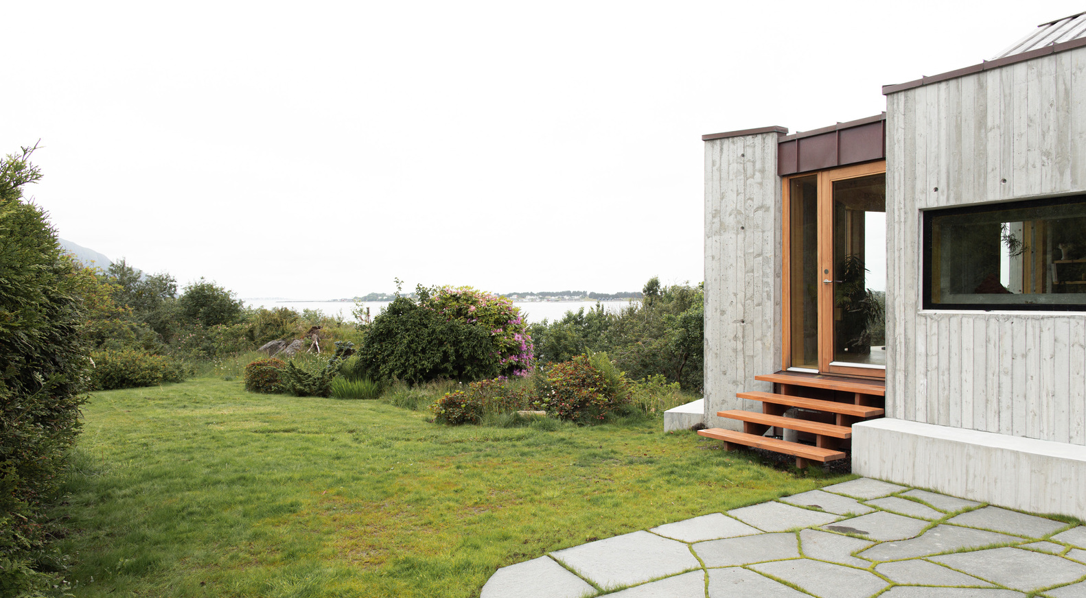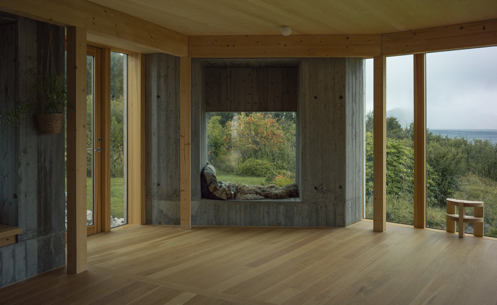 我们提出的解决方案包括扩建房屋并重新设计平面图,以增强这家人与自然的联系以及对海景的观赏体验。考虑到房屋朝西且位置暴露,我们将营造一种宁静和稳定的感觉作为首要任务。三个现浇混凝土构件为房屋提供了防护,营造出一个安全舒适的环境。这使得房屋能够设置大窗户,包括一扇面向阿尔内斯(Alnes)灯塔和戈多伊(Godøy)的主窗,同时又不会让人感觉过于暴露。