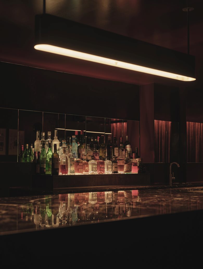 隐藏在一扇没有标记的门后面的是莉娜酒吧(Bar Lina),这里以深酒红色为主色调,充满了单色的魅力,柔和的灯光和反光表面营造出一种私密而迷人的氛围。一进入地下室空间,一张由深色的莱万托红(Rosso Levanto)大理石制成的长条形整体公共吧台桌,被低垂的定制黄铜吊灯照亮。由 A-nrd 设计的定制吧台凳可容纳 24 人就座,采用亚伍德(Yarwood)品牌的传统桃花心木皮革进行装饰,配有拉丝钢底座。