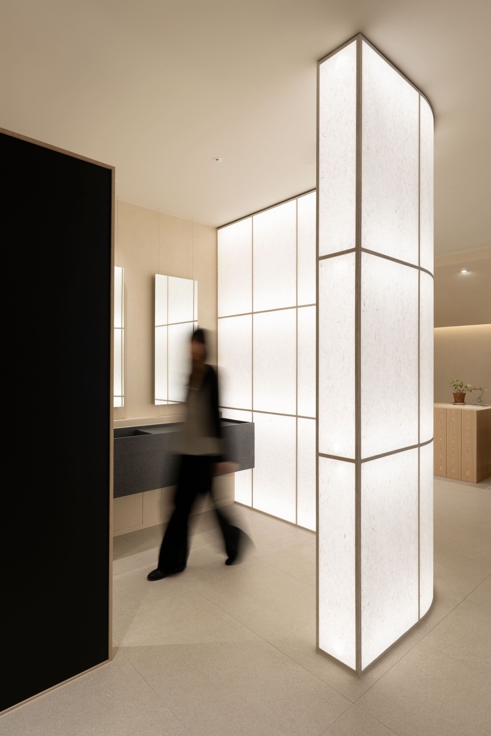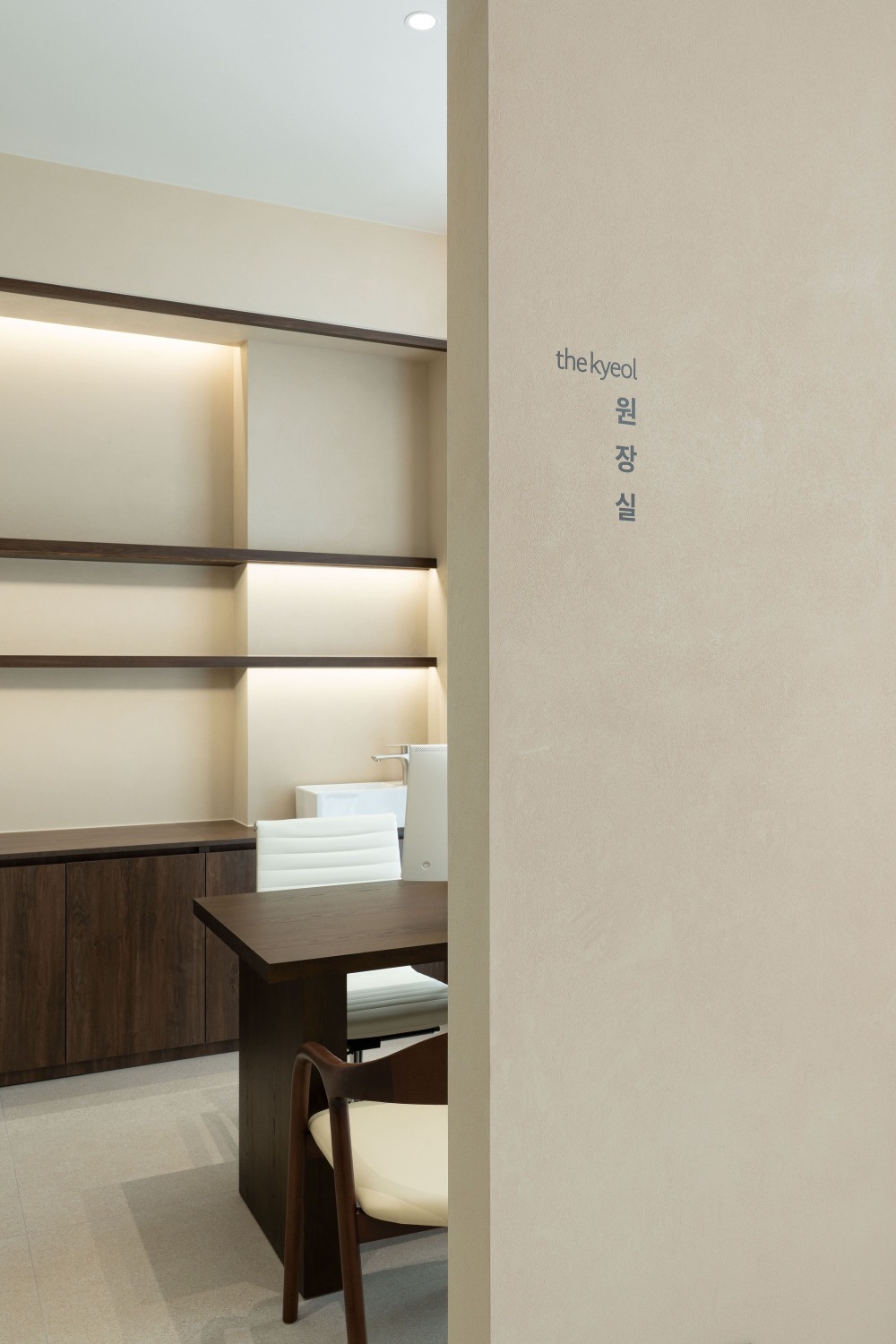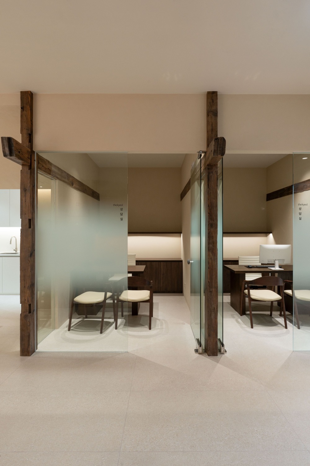 作为医患沟通的核心场景,咨询室与院长室的设计以 “宁静” 为关键词。回收木柱在此处被赋予新的功能意义,不再是传统建筑的结构构件,而是以现代设计语言重构韩国传统建筑的韵律感。浅色调墙面与简约线条搭配,进一步弱化空间的压迫感,让患者在交流时能自然放松。玻璃门的设计堪称点睛之笔。灵感源自韩国水墨画的朦胧意境,通过光影的虚实变化,为空间增添诗意氛围 —— 当光线穿过玻璃,柔和的光斑落在墙面与地面,仿佛将水墨画卷中的意境搬进现实。定制家具则兼顾实用与美学,每一处尺寸、每一个细节都经过反复推敲,既满足办公与咨询的功能需求,又以简洁的造型融入整体空间,实现功能与美学的无缝衔接。