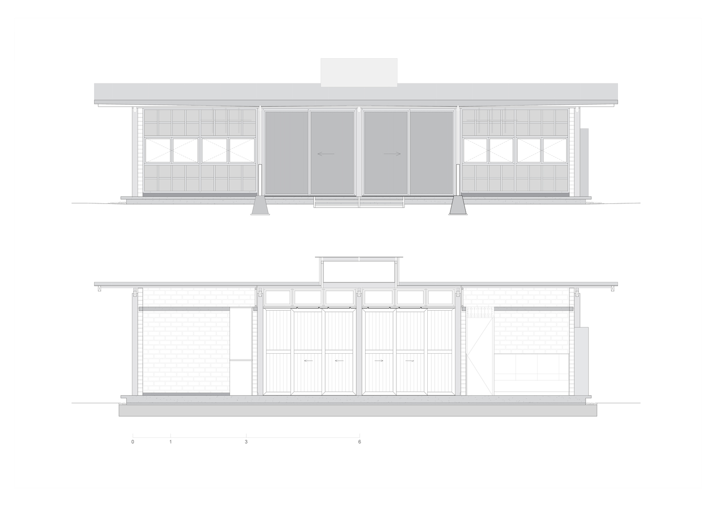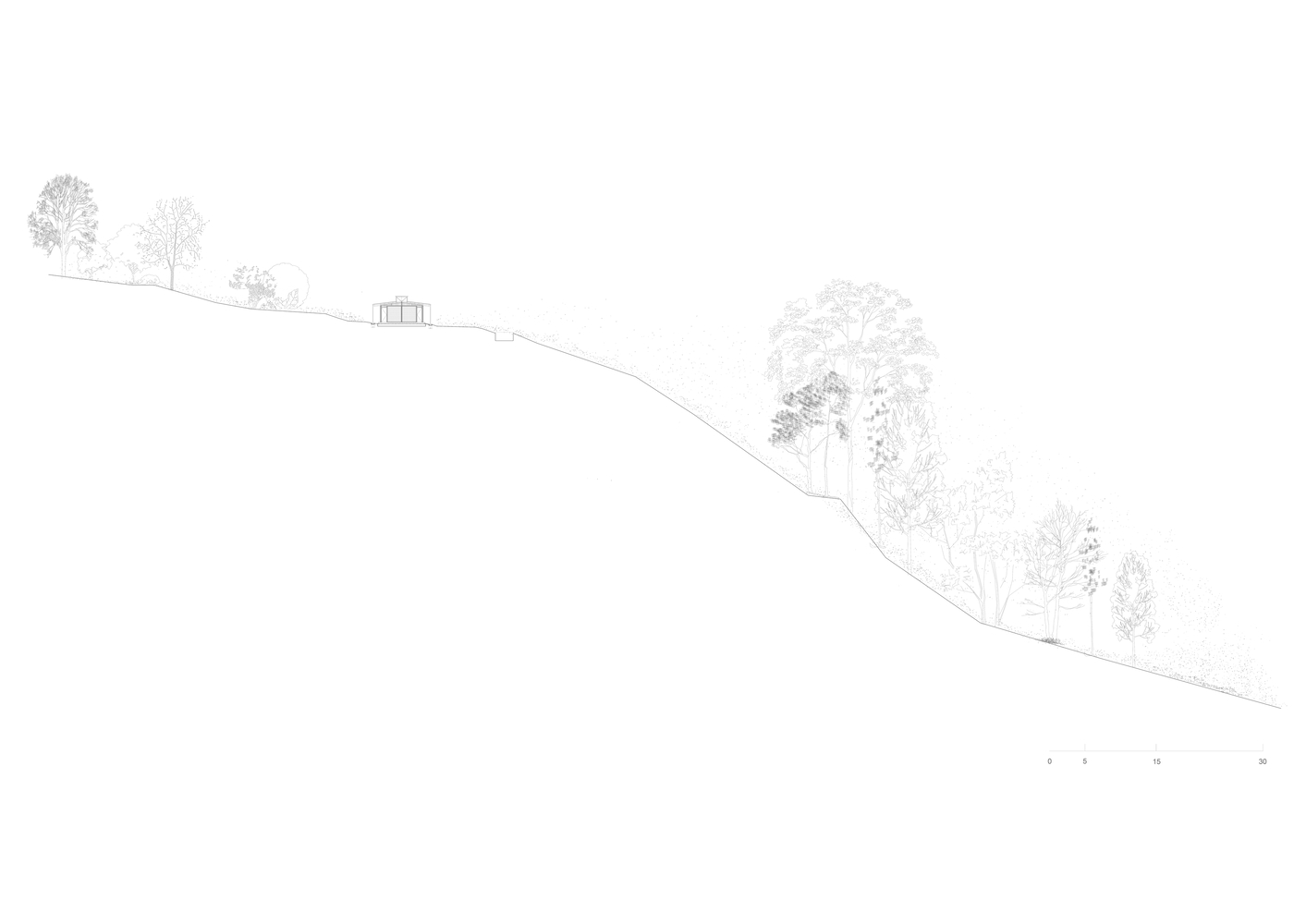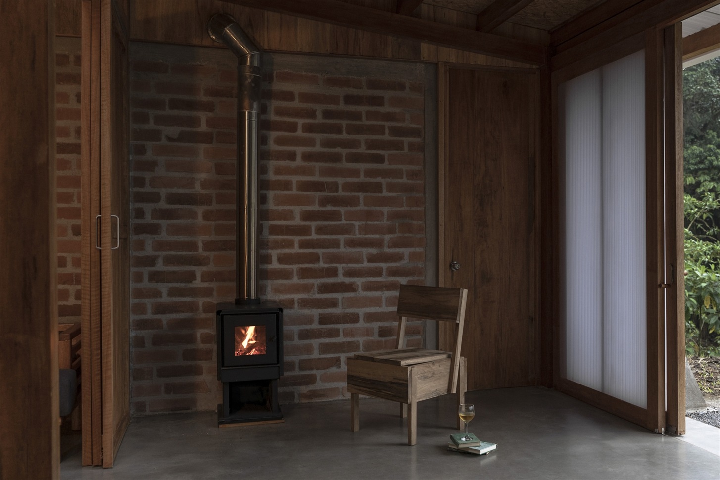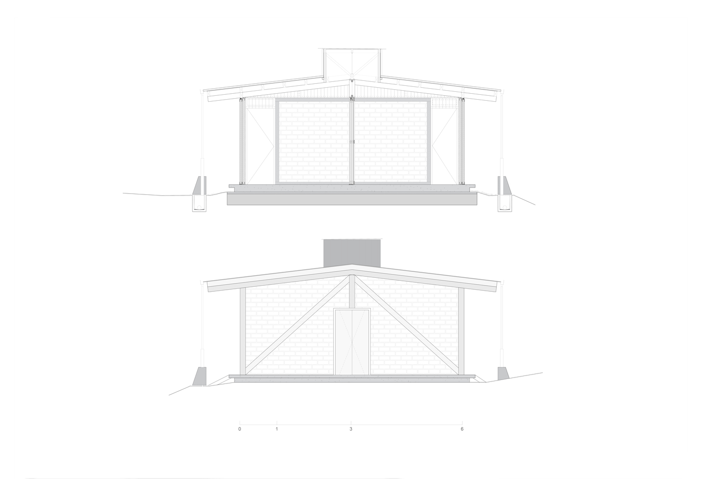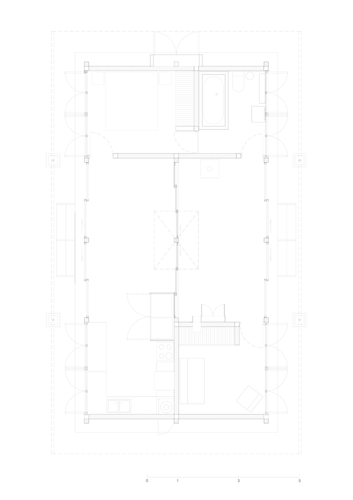 其建造体系融合了两种设计传统:场地周边的简易木结构,以及让・普鲁韦(Jean Prouvé)的预制房屋。这些参考指引设计采用了重复的梁柱框架结构,这种结构抗侧向力强且易于组装。住宅中心矗立着一根独立立柱,上方的天窗更凸显出它的纤细感 —— 这一设计呼应了筱原一男(Kazuo Shinohara)的理念,即结构元素既是稳定装置,也是富有诗意的独特存在。在这个空间的中心,光线与重力仿佛融为一体。天窗解除了中央立柱的结构承重职责,使其不再作为支撑构件,而是作为一种象征存在。通过这种设计,它标记出一个景观的精确中心 —— 这个景观并非天然存在,而是由住宅自身框定出的室内地平线。