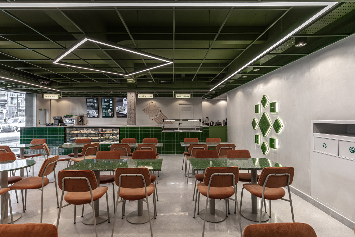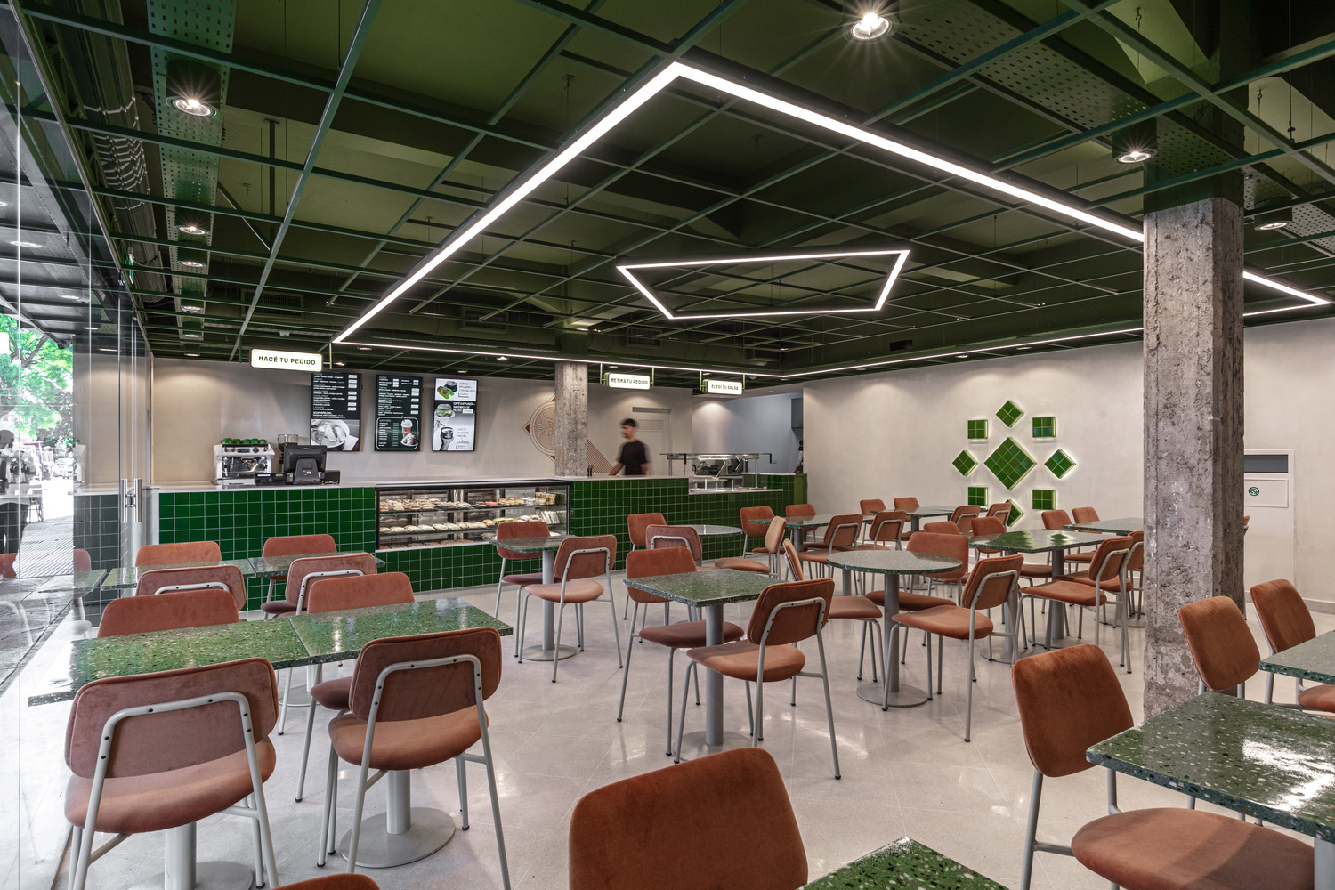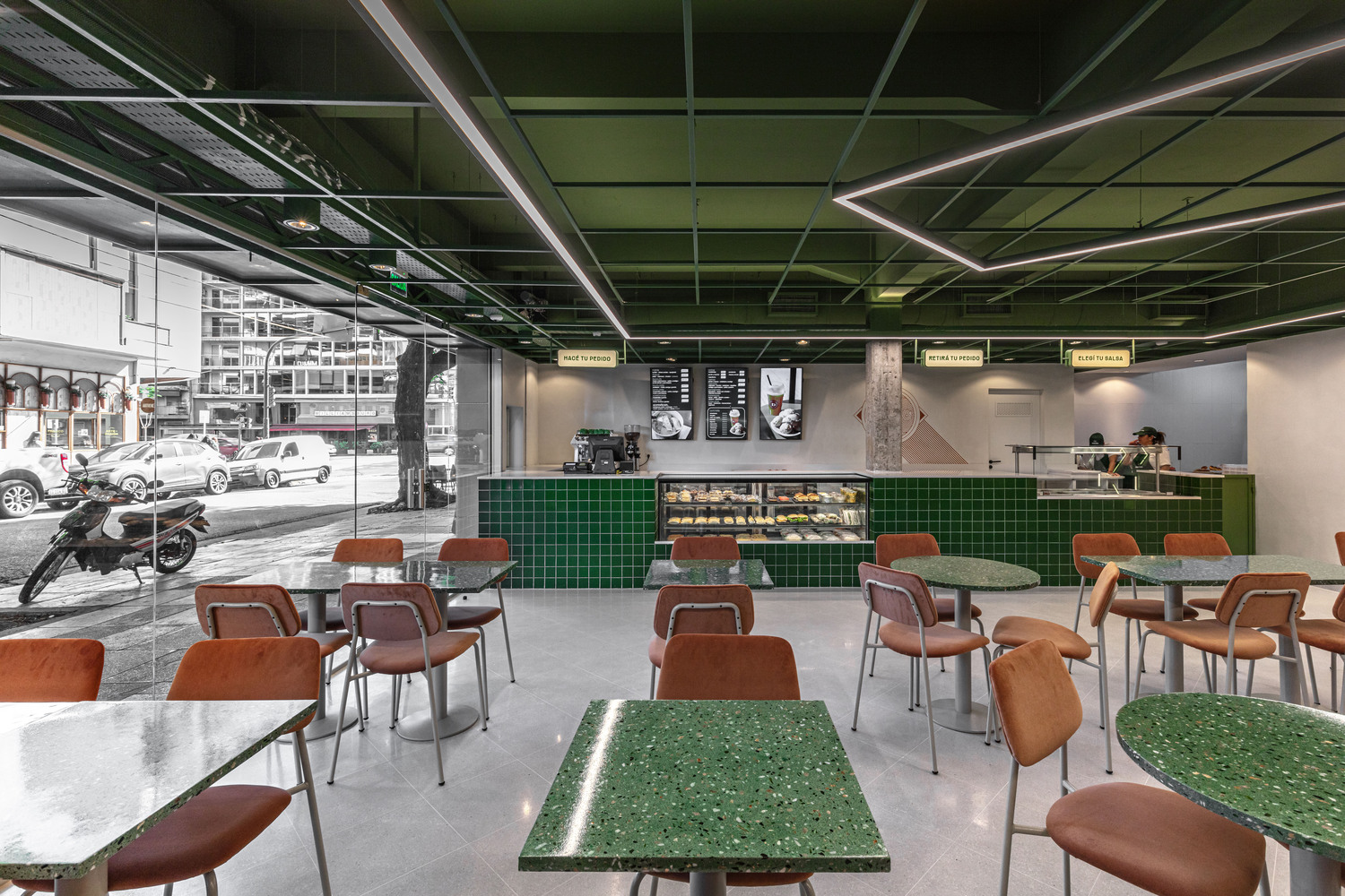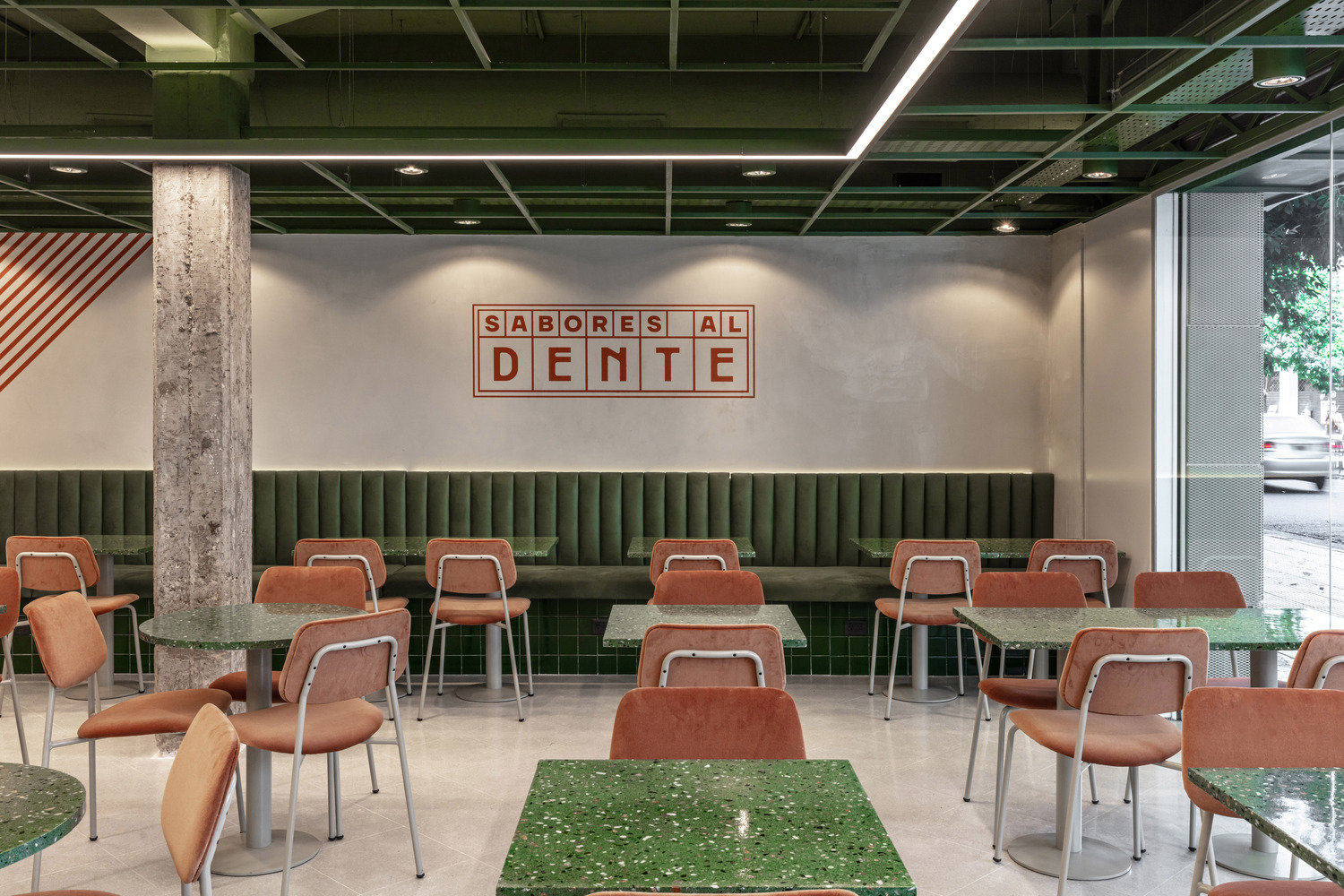 Diletto III 餐厅兼酒吧设计是我们工作室为该品牌打造的第三家美食场所。首家门店于 2019 年开业,第二家于 2024 年开业,同年,这家新项目在布宜诺斯艾利斯的贝尔格拉诺街区落成。该品牌始终面临着一项挑战 —— 将新鲜意大利面的传统与快餐的动态体验相融合。