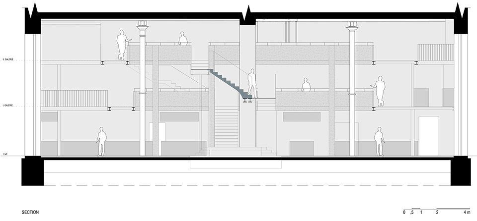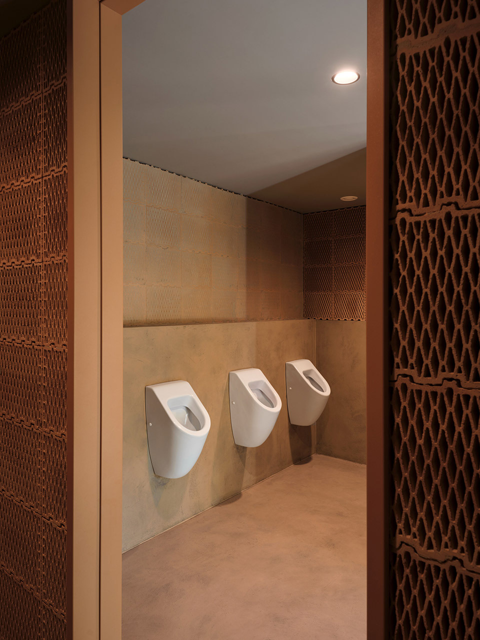 Mexická 餐厅的独特性,首先源于其对场地的创造性改造。前霍莱索维采啤酒厂的挑高空间,为设计提供了天然的 “宏大叙事” 基底,而 20–20–ARCHITEKTI 则在此基础上,构建出两层带中央庭院的画廊式结构,让工业遗迹与墨西哥的空间美学碰撞出全新的火花。画廊式结构以青绿色实心钢型材为骨架,铺面采用可行走的橡木板,冷硬的工业材料与温润的木质纹理形成质感对比,既呼应了啤酒厂的工业基因,又暗合了墨西哥文化中 “自然与人工共生” 的特质。