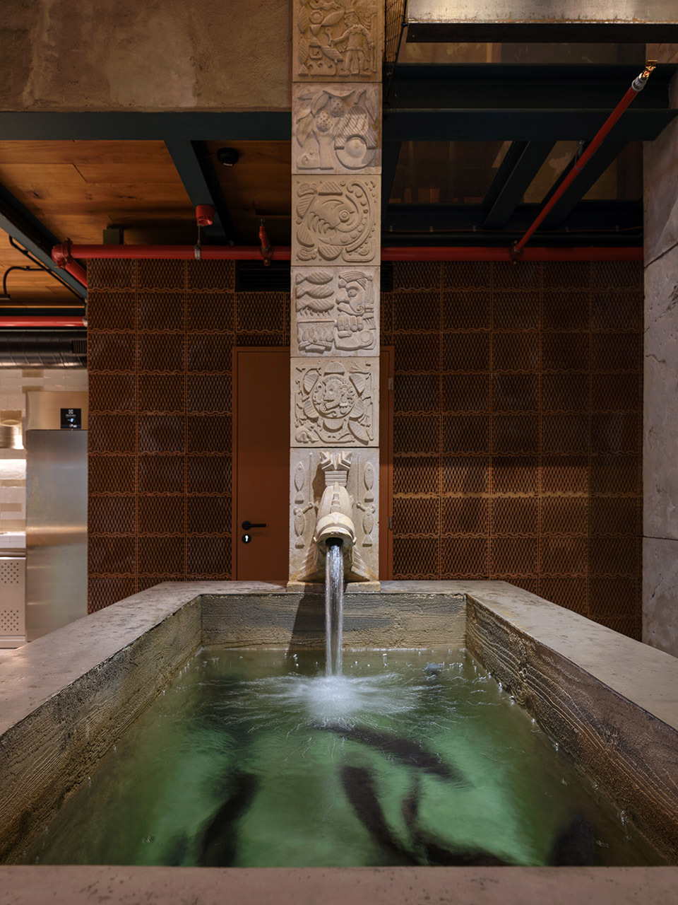 中央庭院的设计则打破了封闭的空间格局,让自然光从顶部倾泻而下,为室内注入了墨西哥庄园式的通透与开阔;而支撑画廊的石材柱子,更是成为文化表达的关键载体 —— 平面设计师 Petr Štěpán 与建筑师、雕塑家合作,为餐厅独家原创了玛雅象形文字浮雕,这些刻在柱身的符号,如同打开墨西哥古文明的密码,让空间瞬间拥有了历史的厚重感。