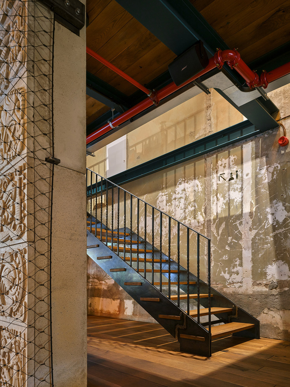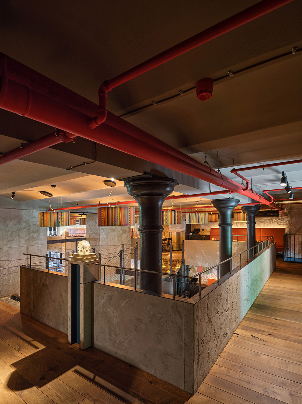 这种 “可视化的烹饪”,不仅满足了顾客的好奇心,更还原了墨西哥庄园中 “围炉而食” 的热闹氛围。柴火烤炉作为厨房的视觉中心,明火的跳动与食材的香气交织,成为空间中最具生命力的场景;而楼上的大型鸡尾酒吧,则延续了这种 “质朴与真实” 的表达 —— 饮品展示柜延伸跨越酒吧、连接至另一处画廊,玻璃与金属的组合让酒品如同艺术品般陈列,与楼下的美食烟火形成 “味觉与视觉” 的双重呼应。