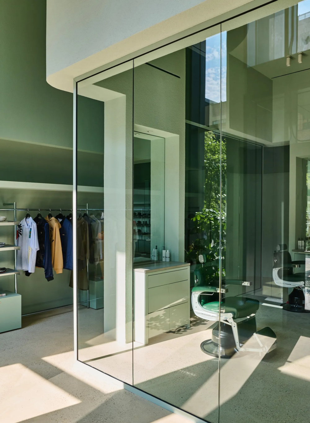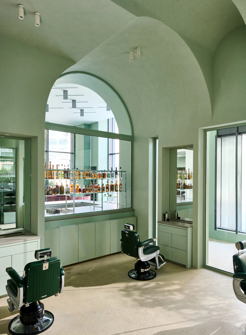 走进 Manifest 002,最先被吸引的是它的 “空间通透感”—— 四米高的天花板纵向拉伸了视觉尺度,彻底消解了小空间的压抑感;全景玻璃墙面如同 “城市取景框”,白天将室外的街景与自然光引入室内,柔和的漫射光洒在理发区,既方便发型师精准操作,又让顾客在剪发时能透过玻璃瞥见街景,减少久坐的枯燥;夜晚,室内暖光透过玻璃映亮街道,让理发店成为城市夜景的一部分,路过的人会被这份 “热闹却不喧嚣” 的氛围吸引,而店内顾客也能在 “被看见却不被打扰” 的安全感中,享受属于自己的时光。