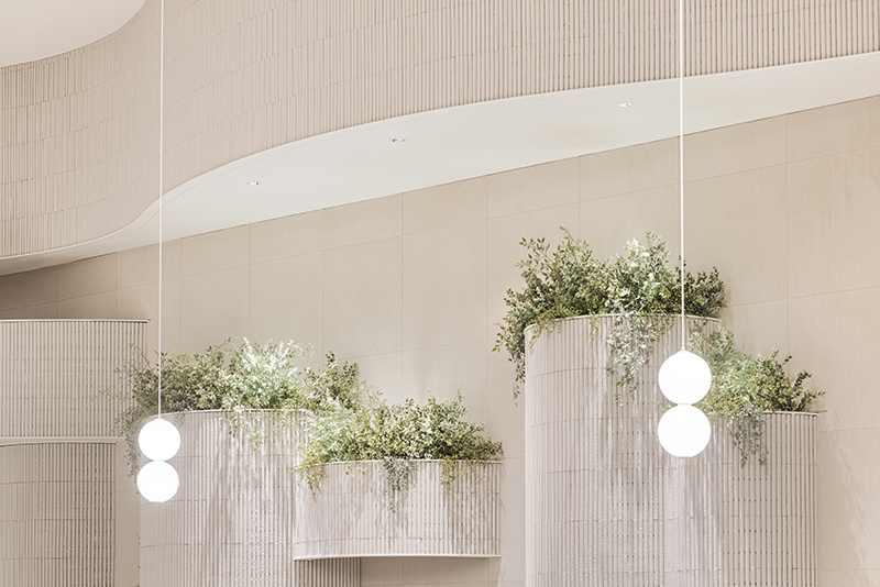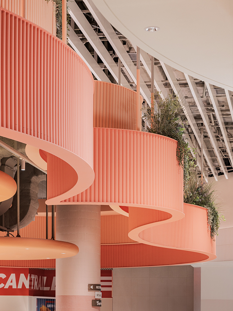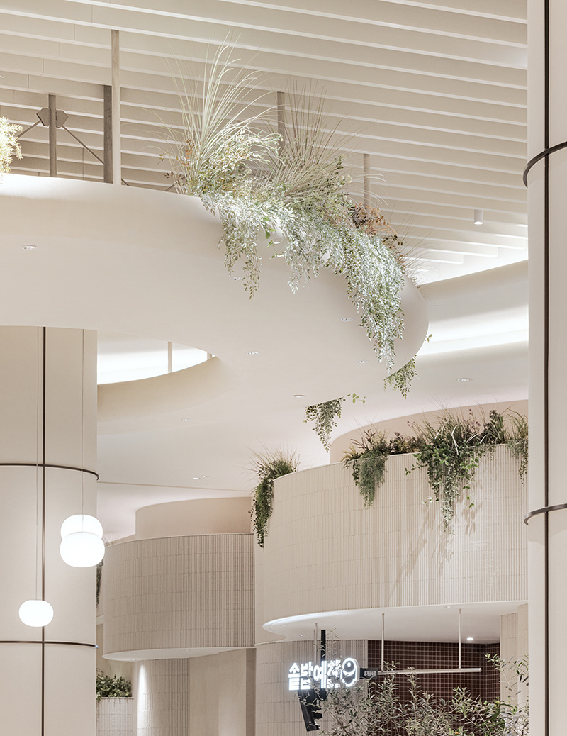 走进美食城,最先被治愈的是满眼的绿意。上层平台边缘垂落着纤细的藤蔓,立柱顶端簇拥着蓬松的草植,甚至连隔断处都嵌着小型盆栽,像是建筑本身 “长” 出了植物,把户外花园的清新感直接拽进了室内。这些绿植不再是 “装饰配角”,更像是空间的 “呼吸器官”,让原本可能闷热的美食城,瞬间有了自然的通透感,仿佛每一次呼吸,都能吸入草木的清新气息。