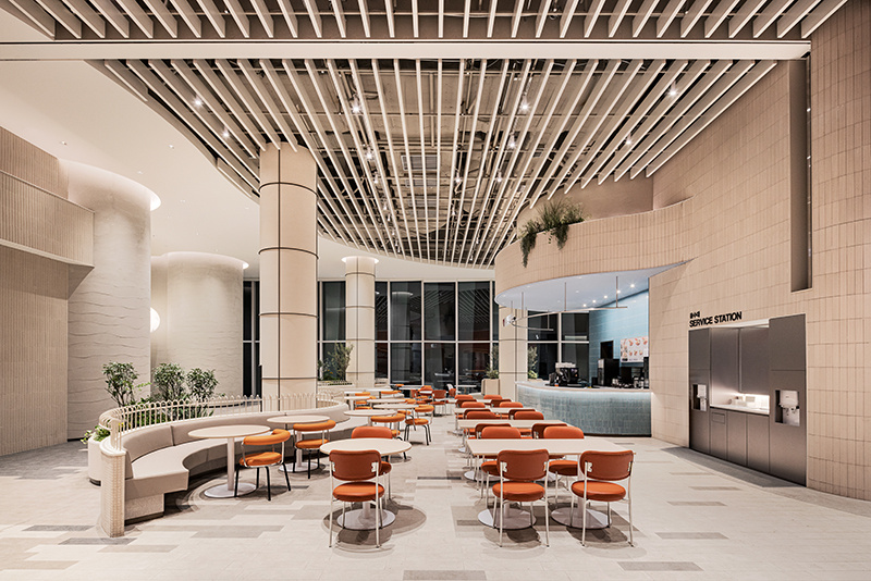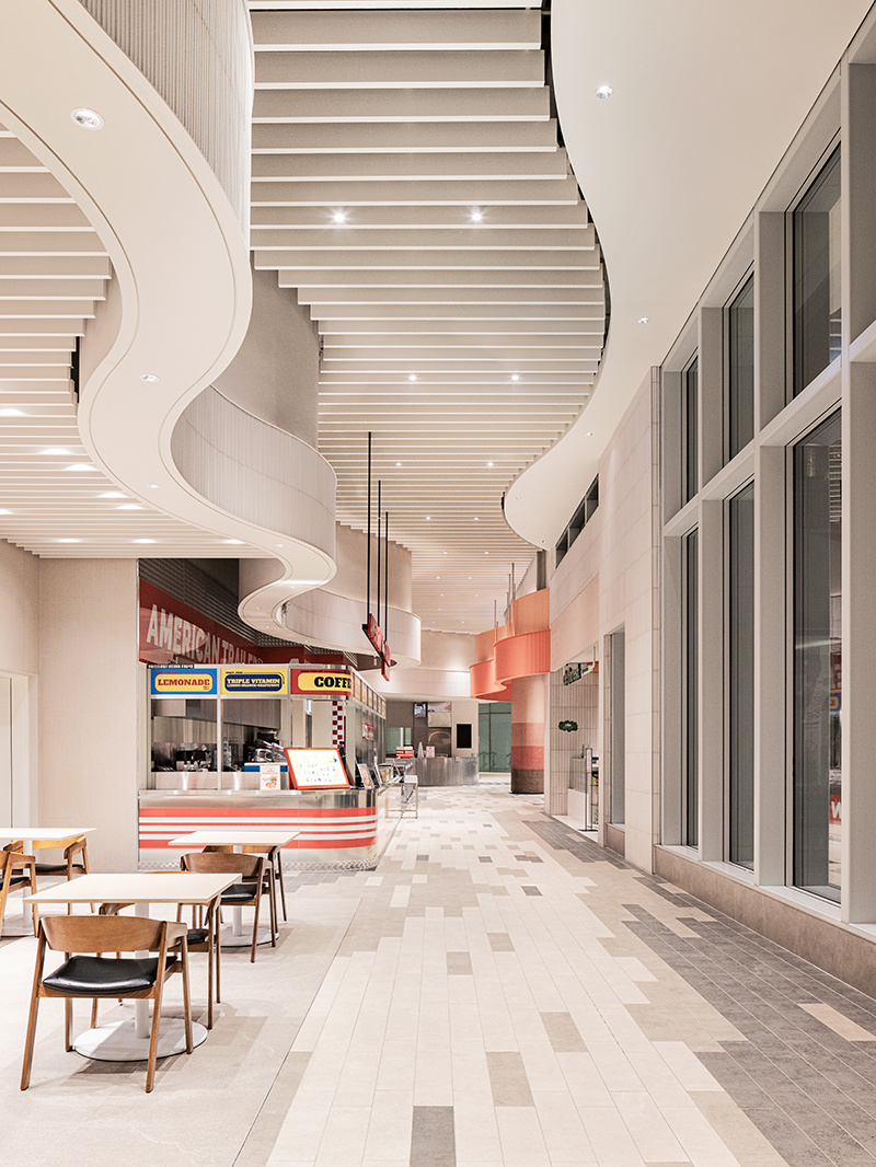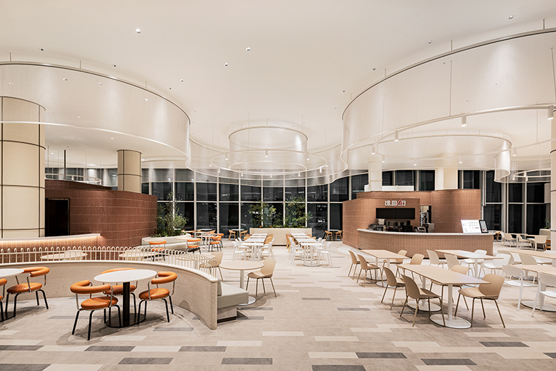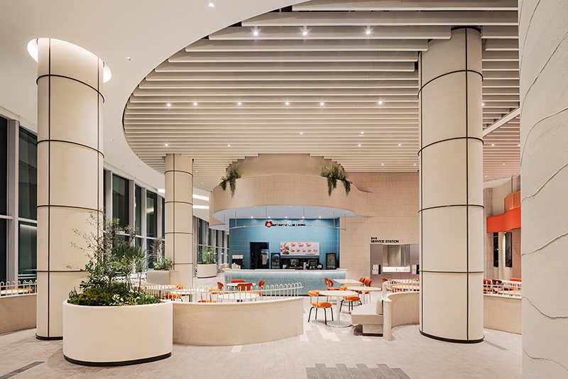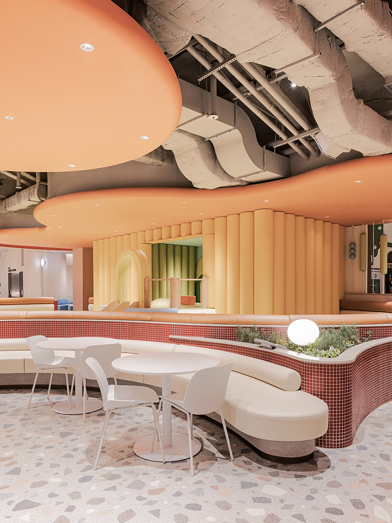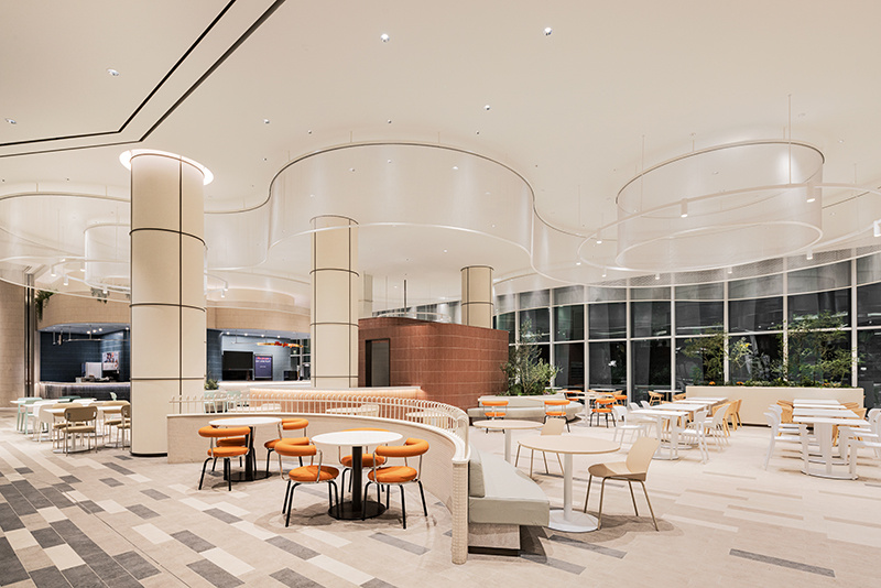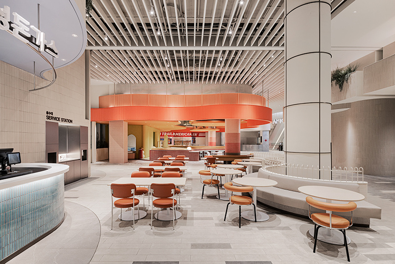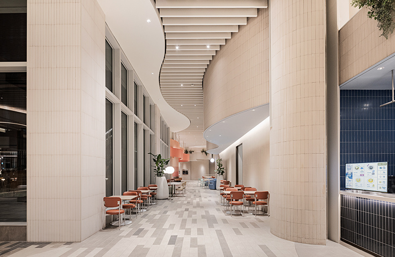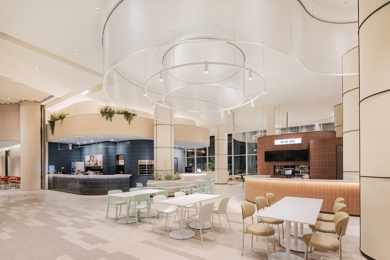 空间的线条设计,没有半分生硬感。弧形的建筑结构层层叠叠,像被风吹软的云朵,从天花板的波浪形格栅,到档口的圆润轮廓,再到休息区的曲线座椅,每一处线条都透着温柔。色调更是 “治愈系” 的绝佳诠释:大面积的米白色打底,像一块干净的画布;局部点缀浅蓝、薄荷绿的座椅,清新得像初夏的风;还有区域用暖橙色做跳色,活泼却不刺眼,像一块融化的甜橙软糖,让整个空间既雅致又充满活力,坐在里面干饭,仿佛不是在美食城,而是在逛一场清新向的艺术展。