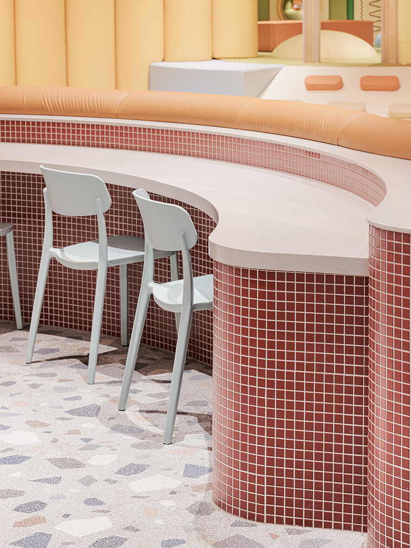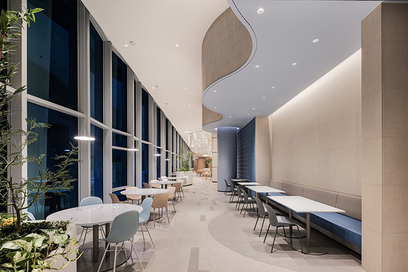 除了大场景的治愈,细节更是把 “享受感” 拉满:灯光像温柔的滤镜:圆润的球形灯散发出柔和的光,和空间的曲线完美呼应,哪怕饭点人多,也不会觉得刺眼喧闹,反而像给整个美食城加了层 “柔焦滤镜”;桌椅是咖啡馆级配置:浅蓝、薄荷绿的椅子搭配白色圆桌,质感细腻,坐上去完全不是传统美食城 “硬邦邦” 的体验,更像在一家精致咖啡馆里等待餐点;动线像 “花园漫游”:档口与休息区的布局,不是 “挤挤挨挨”,而是带着 “漫步感”,逛着逛着选美食,就像在花园里偶遇不同的 “惊喜小食铺”。