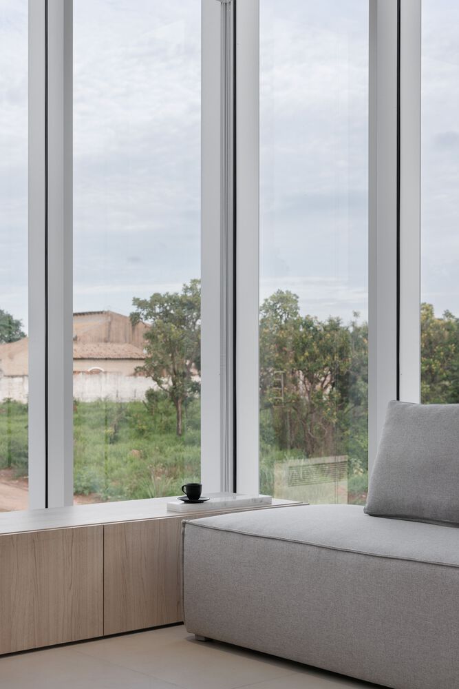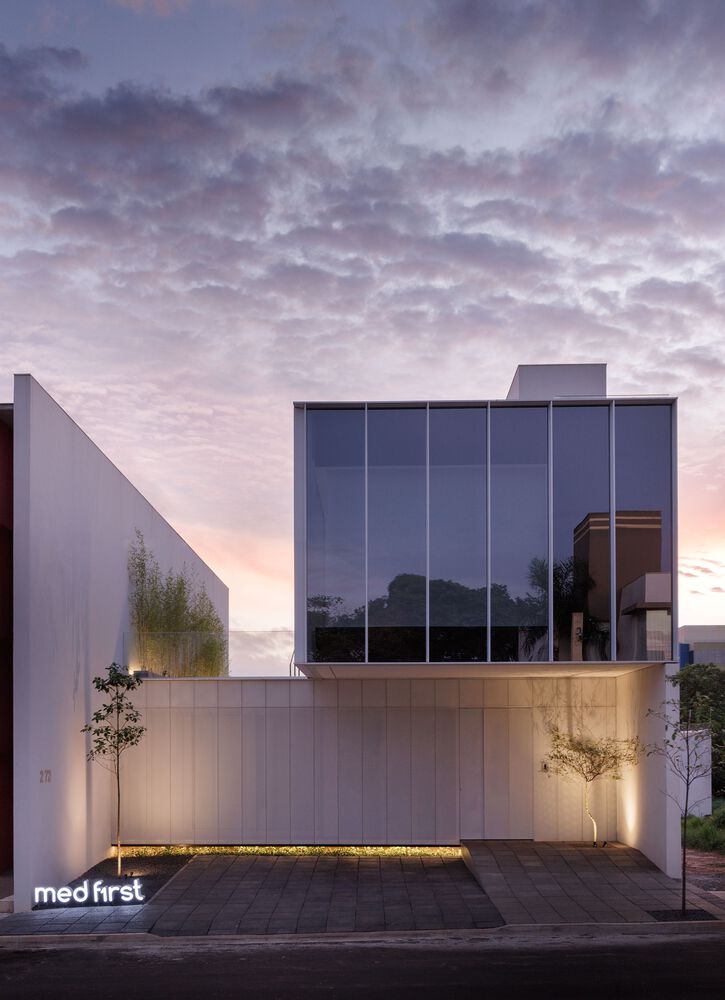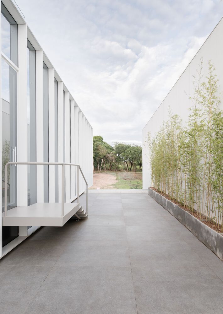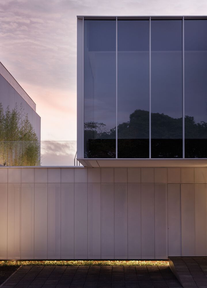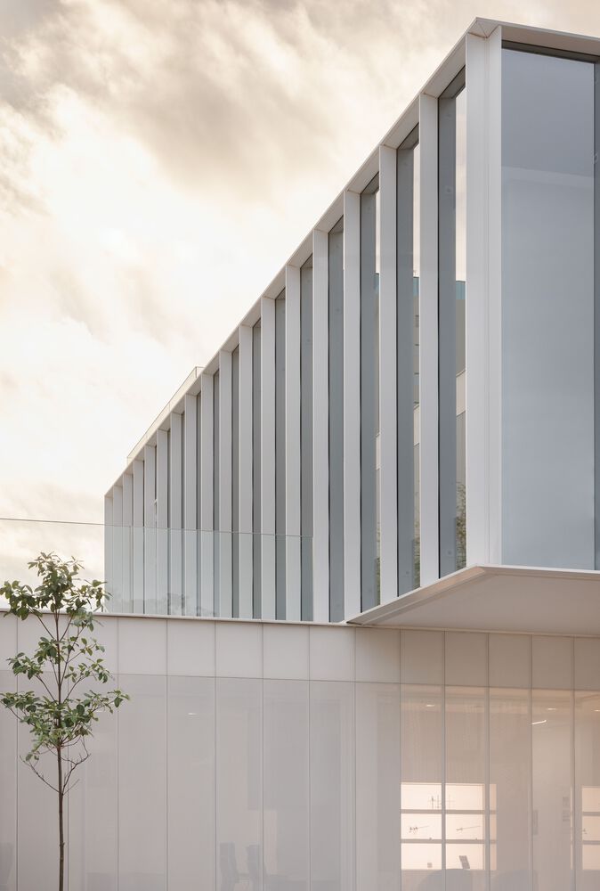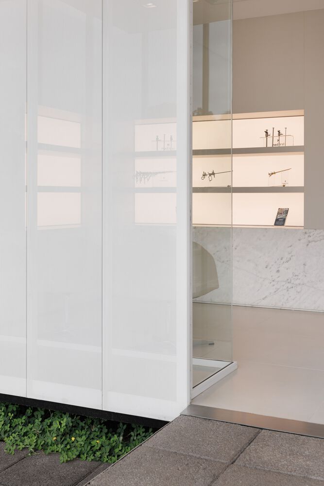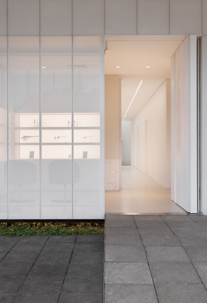 上层悬挑的建筑体块中设有功能空间,人行道延伸至正面退台区域,自然引导人们走向带有镂空设计的金属板立面 —— 这一立面如同建筑的 “幕布”。白天,它将街道景观引入前部房间;夜晚,则可能吸引好奇的路人走近大门,透过这一兼具朦胧感与场景感的 “展示窗”,观察公司陈列的产品。