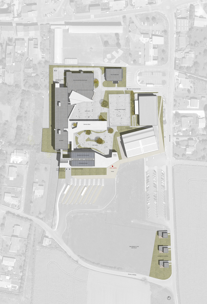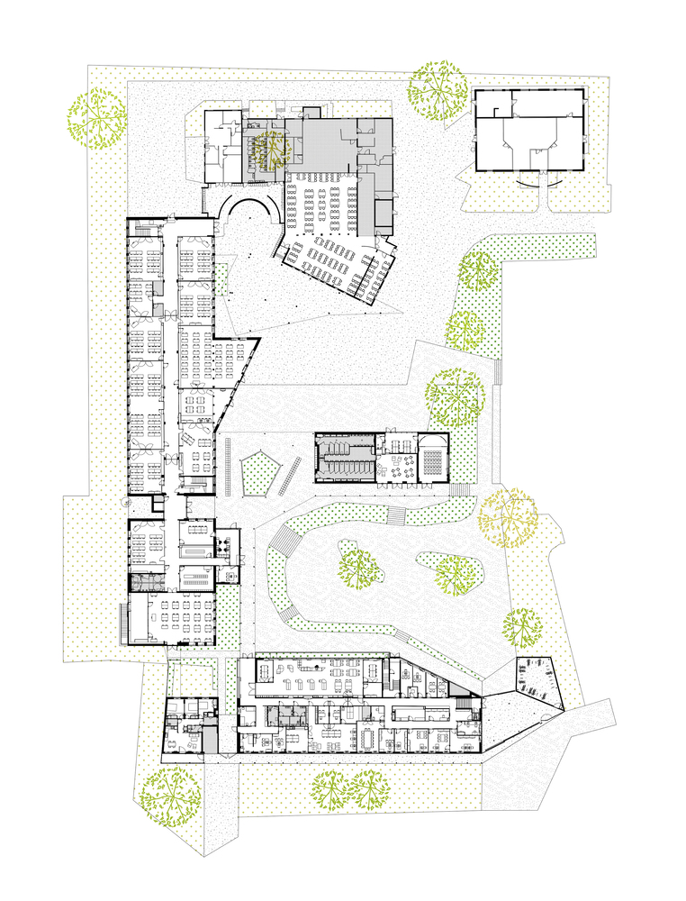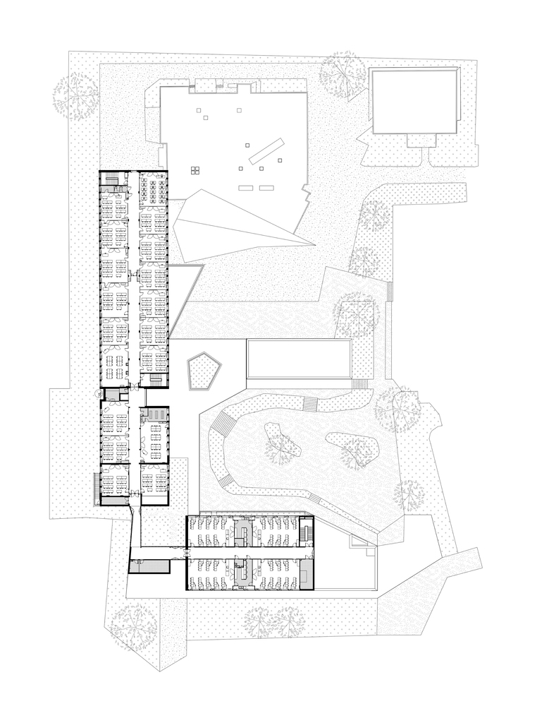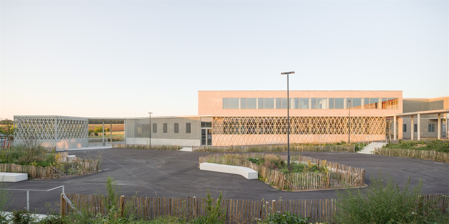 这所学校不仅体现了它在当今社区中的存在,还体现了它在未来社区中的存在,因为它还考虑到了未来体育设施的存在,并为此预留了一块土地。门廊的设计和扩建部分的体量表达了该机构的机构价值,而砖块的温暖质感、钢板的暖色调、自行车架的图案以及将自然重新引入庭院,则从该机构的一开始就宣告了其氛围、空间和使用的特质,在这里,人们可以很好地传播和接受知识,并在该机构的生活中工作。