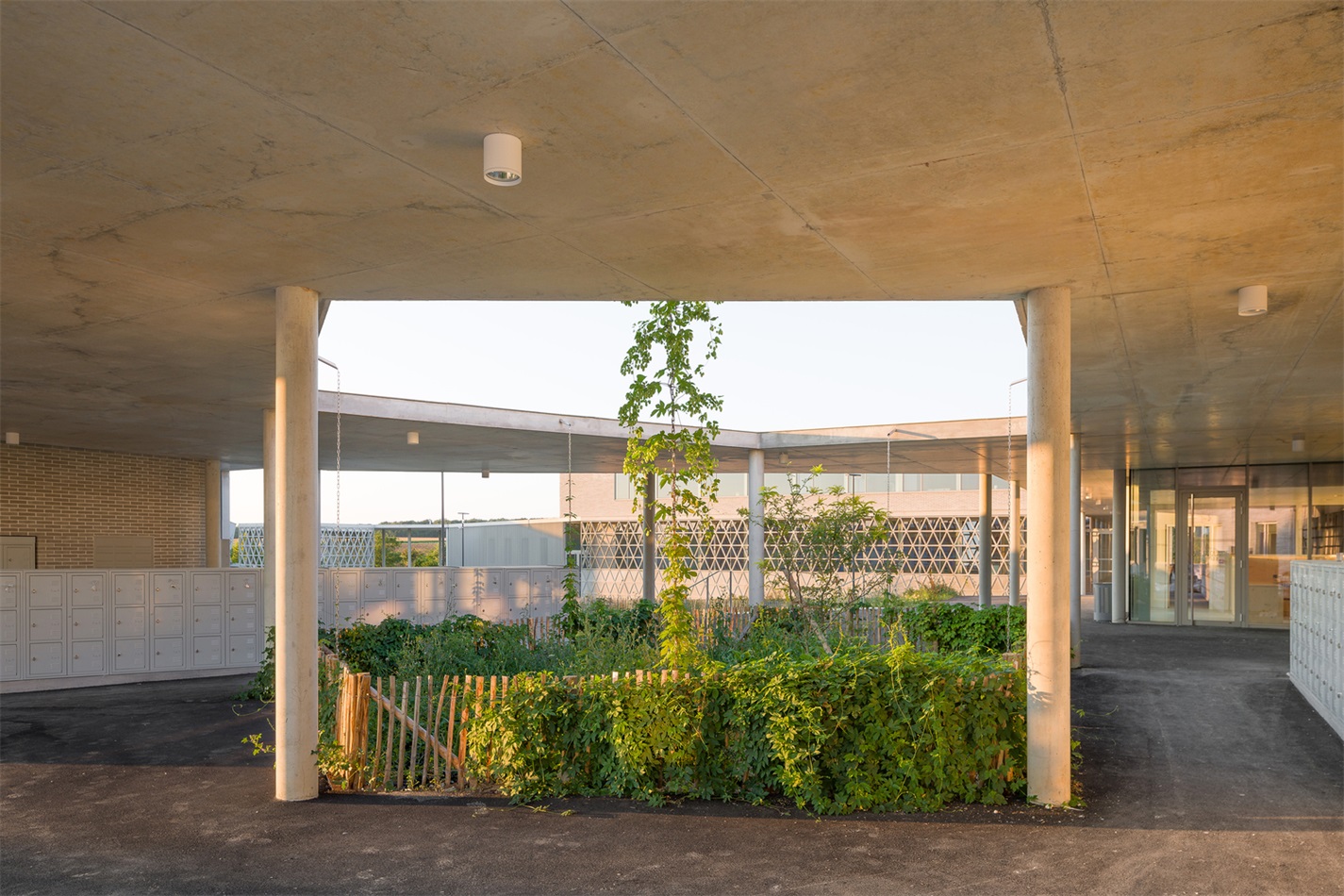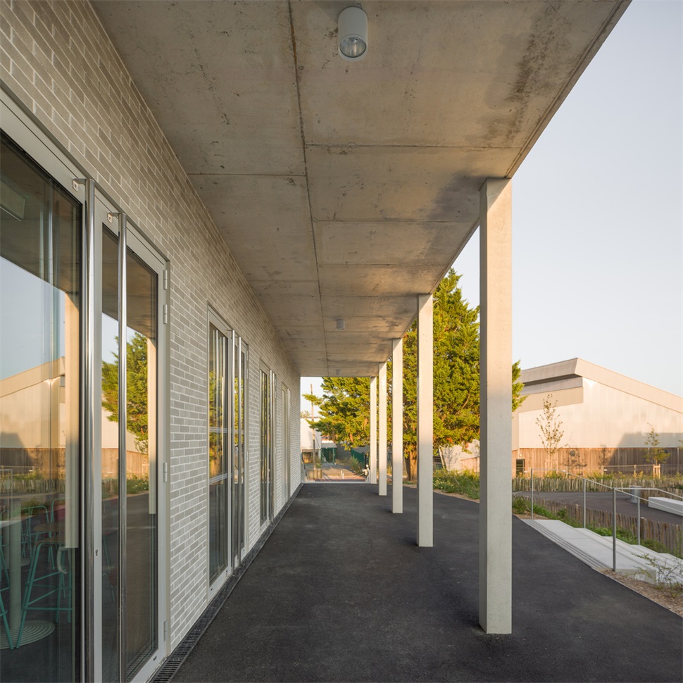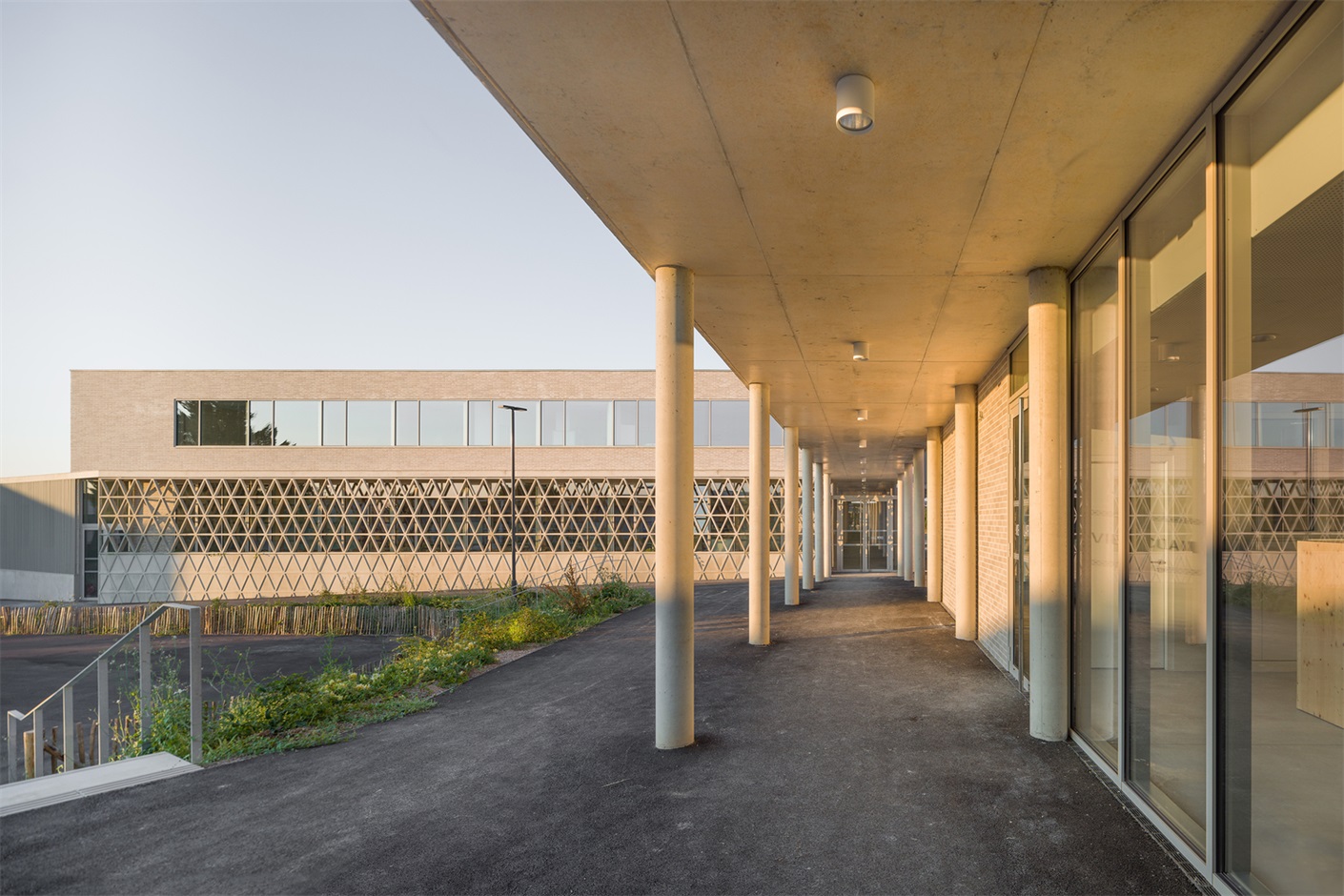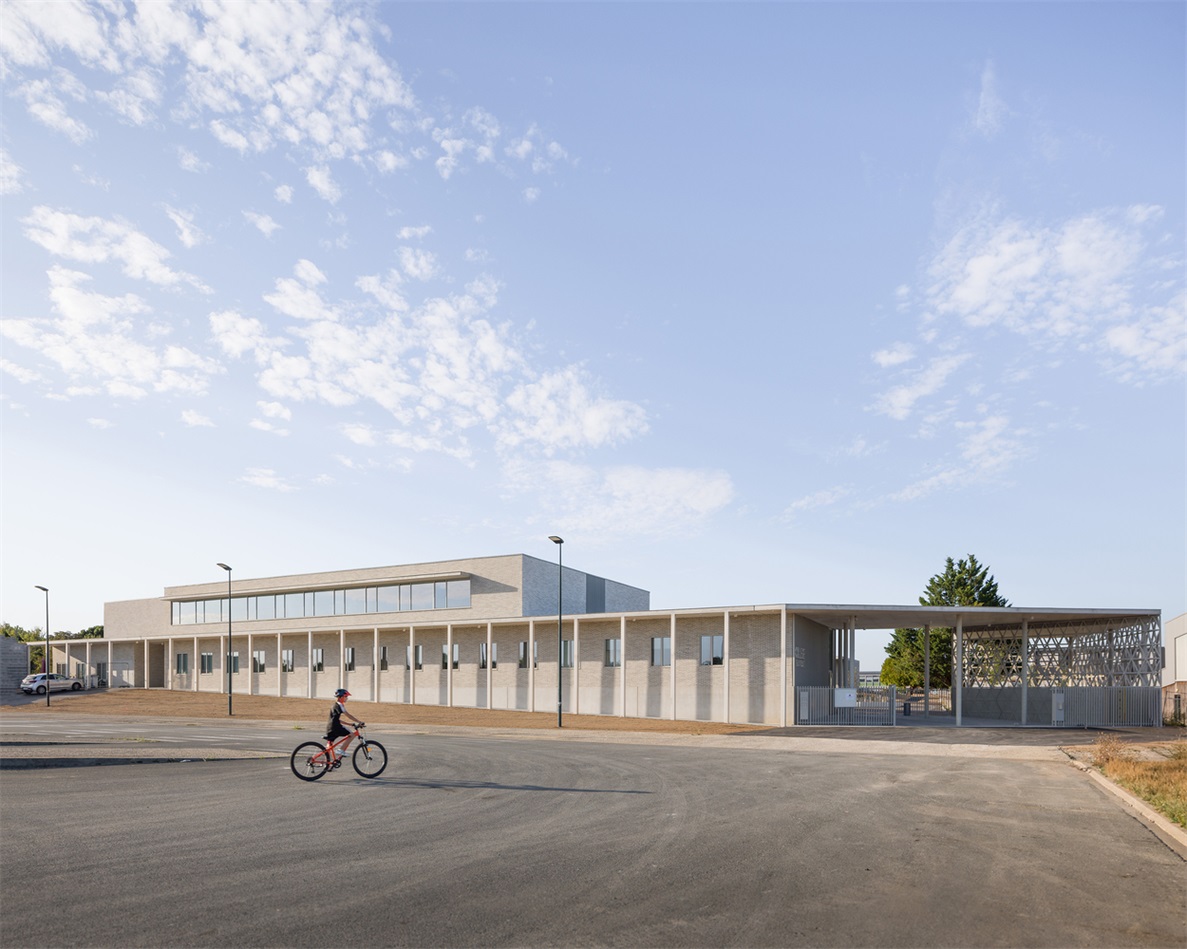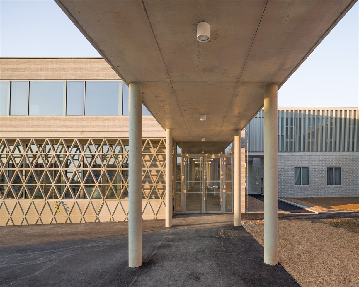 建筑立面向南延伸,以一个门廊为标志,加强了学校的存在感。扩建部分的主体和自行车室之间有一个空隙,由一个宽大的顶棚连接。这种形式界定了建筑的入口。