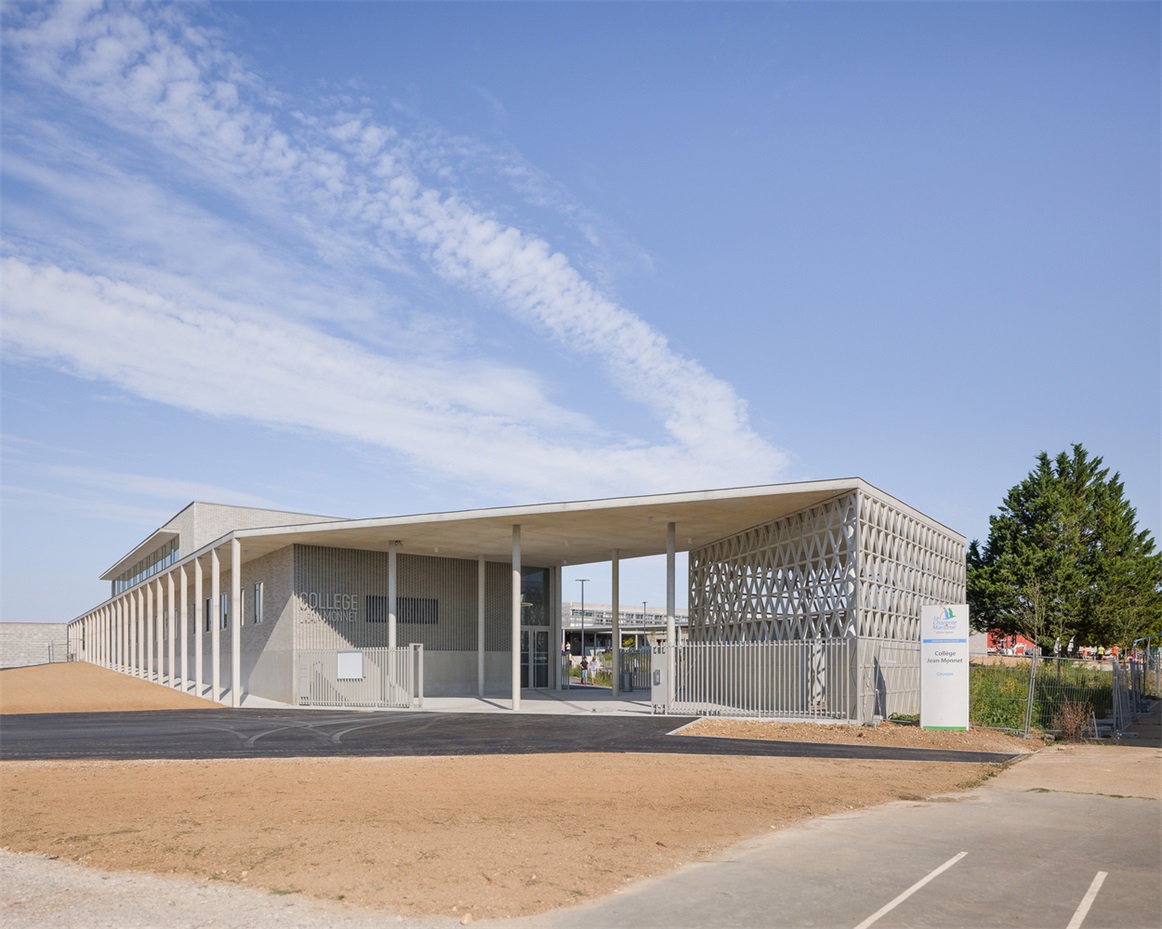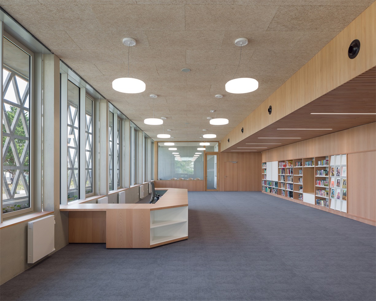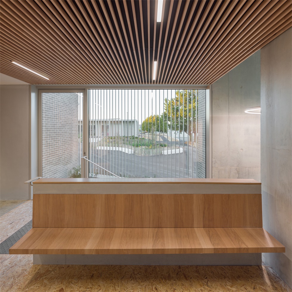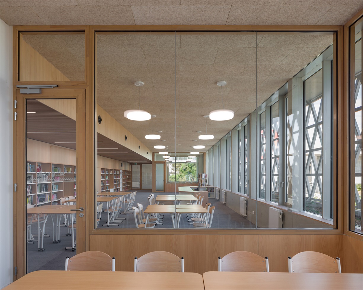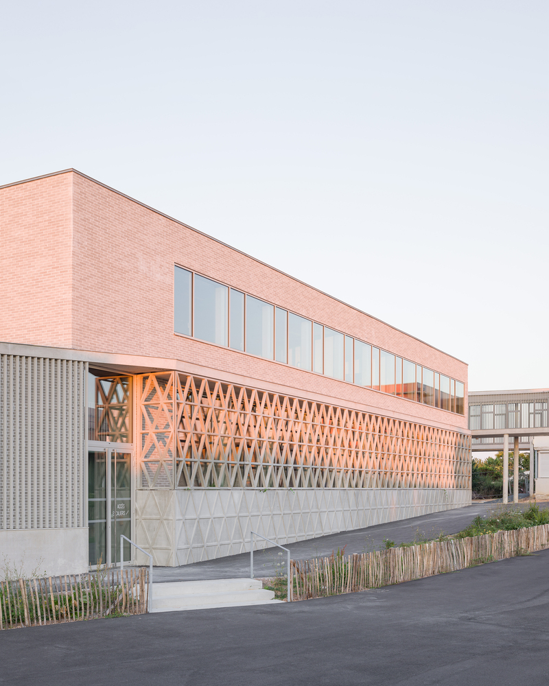 建筑立面向南延伸,以一个门廊为标志,加强了学校的存在感。扩建部分的主体和自行车室之间有一个空隙,由一个宽大的顶棚连接。这种形式界定了建筑的入口。