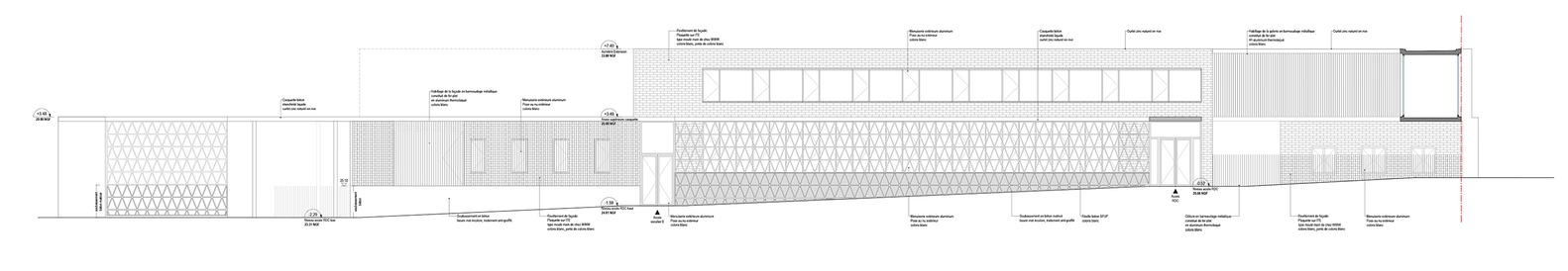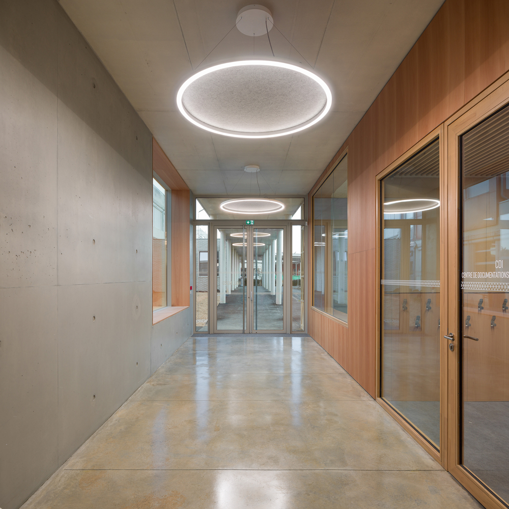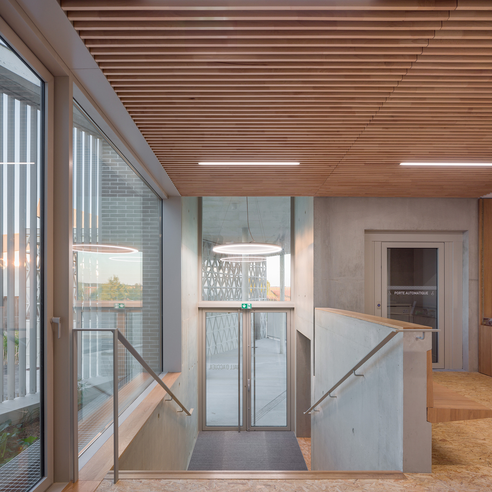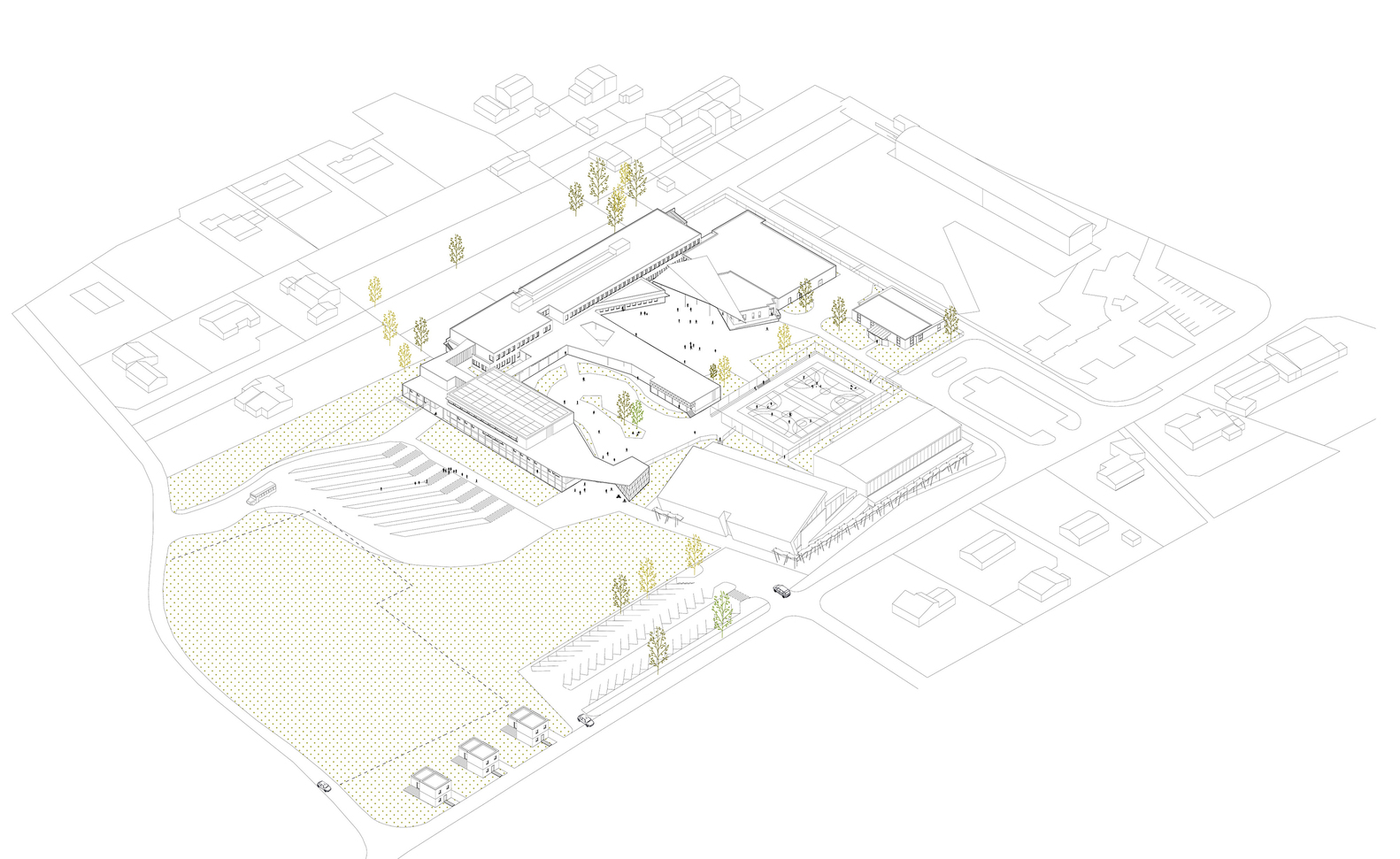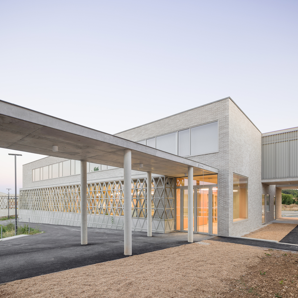 建筑立面向南延伸,以一个门廊为标志,加强了学校的存在感。扩建部分的主体和自行车室之间有一个空隙,由一个宽大的顶棚连接。这种形式界定了建筑的入口。