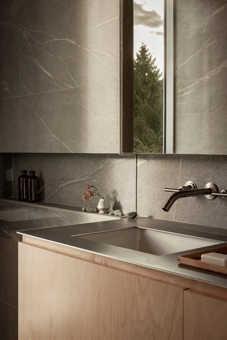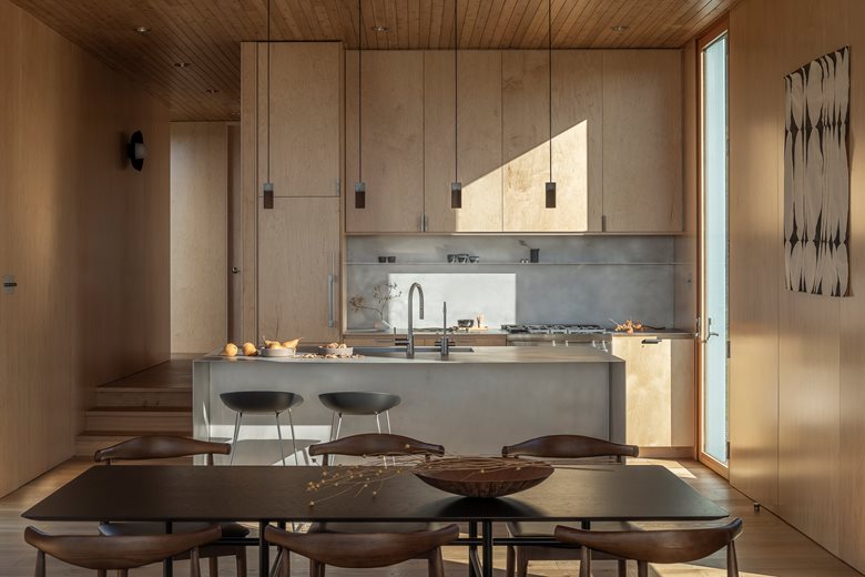 “我们希望通过景观设计让场地‘重归野生状态’,” 首席景观设计师乔迪・埃斯蒂斯(Jody Estes)表示,“清除入侵物种并制定森林恢复计划,这一点至关重要。” 一条步行小径沿着这片 5 英亩(约 2.02 公顷)地块的边缘蜿蜒伸展。在未来的建设阶段,这条小径将延伸至森林中,通向一座冥想亭。 小径尽头的入口台阶将业主引至住宅的最高处。低矮的天花板带来一种空间压缩感,随后步入更为宽敞的客厅和厨房。再往里走,住宅的通透感更强,落地窗将水景与山景框入室内。室内空间以简约的木材细节为设计核心 —— 胶合板墙面、雪松企口天花板和白橡木地板。