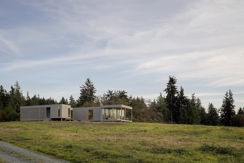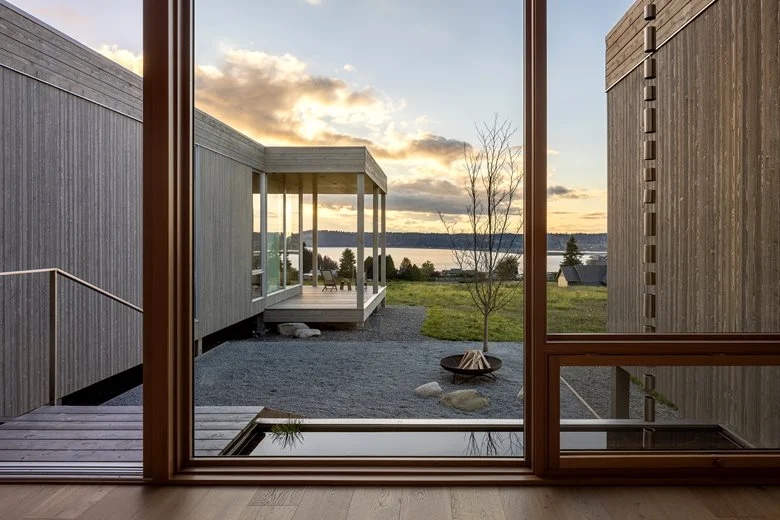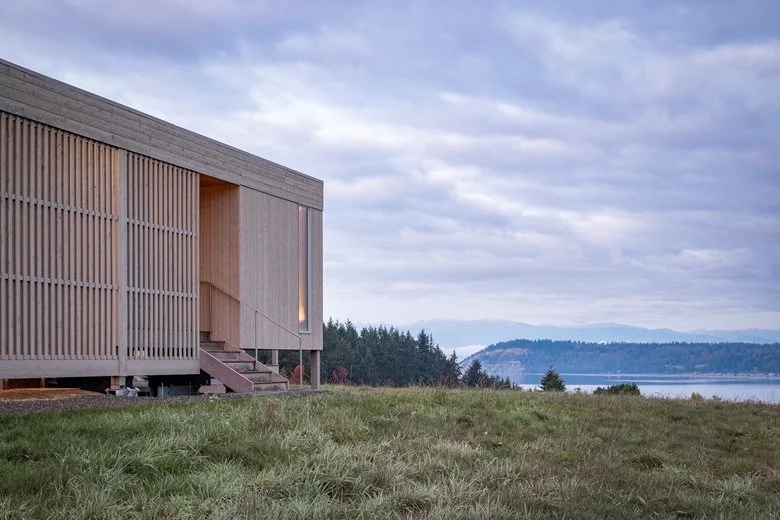 对这座住宅的体验,始于从贝尔维尤(Bellevue)出发的旅程。业主乘坐穆基特奥 – 克林顿渡轮(Mukilteo Clinton ferry)穿越普吉特海湾(Puget Sound),前往惠德比岛(Whidbey Island)的乡村偏远地带。车道引着他们缓缓靠近 —— 沿着平缓的斜坡蜿蜒而上,穿过草地植被(蓝燕麦草、墨西哥羽毛草、agio 芒草)和夏季盛开的花卉(松果菊、红花鼠尾草)。