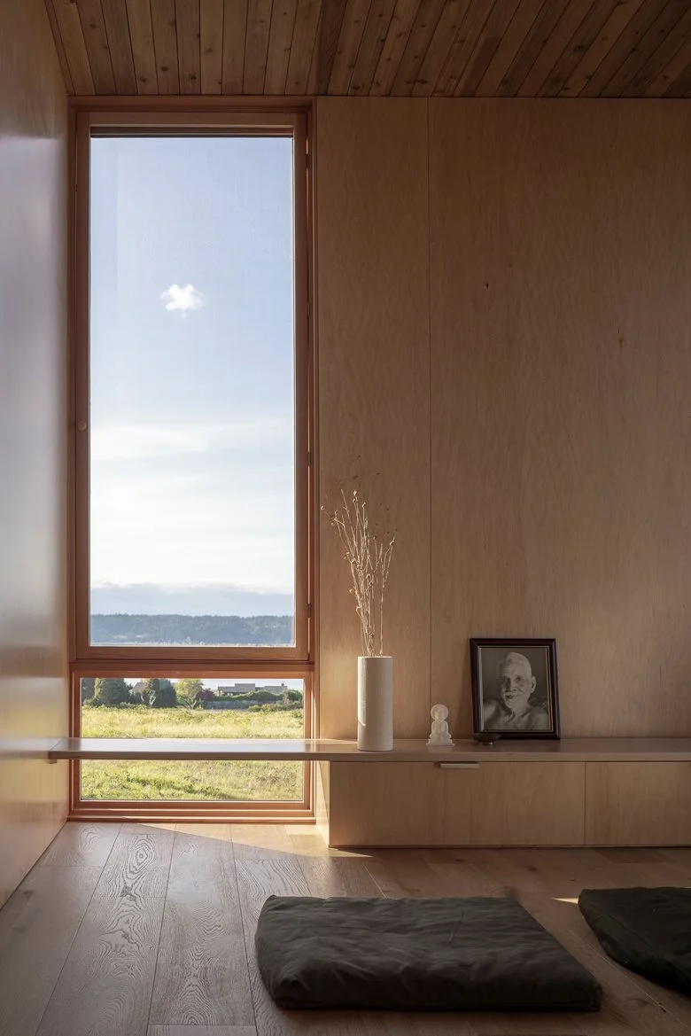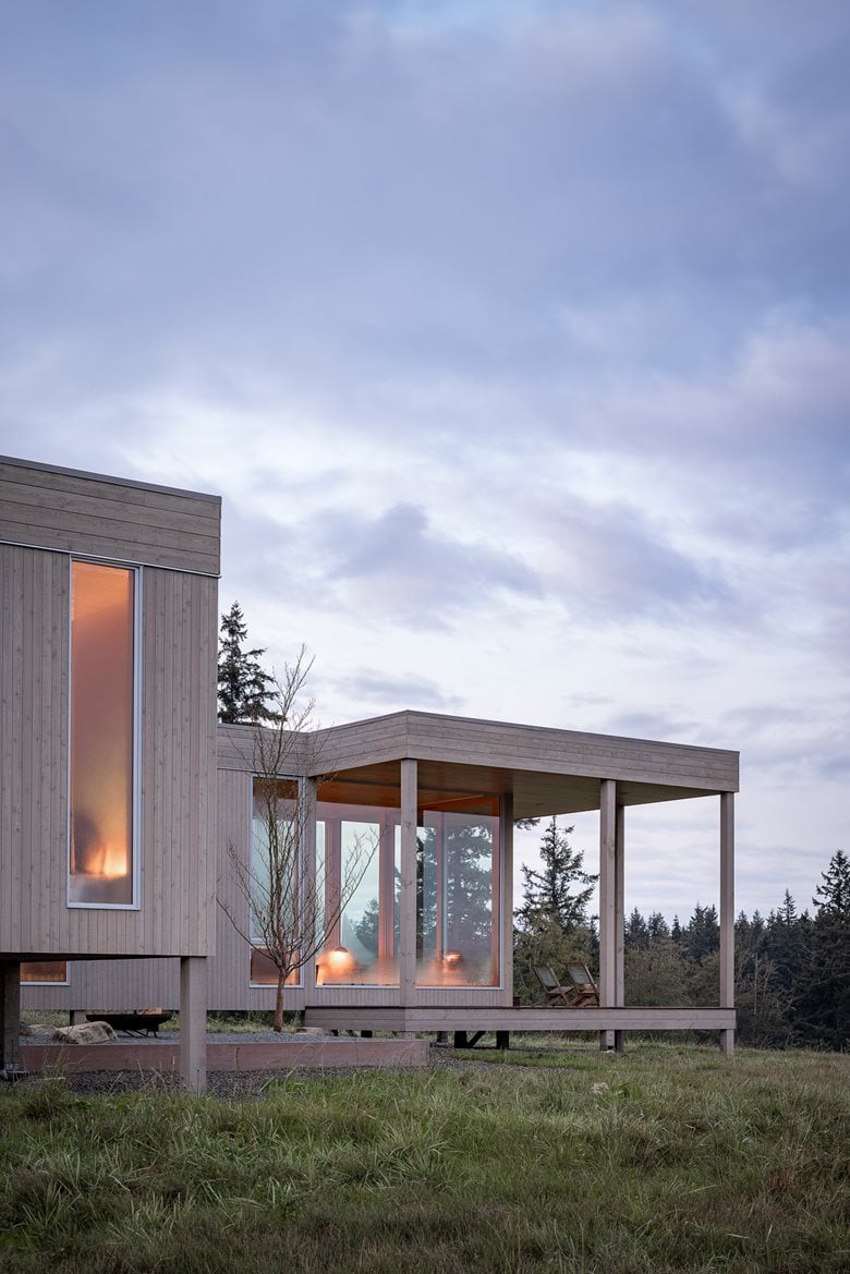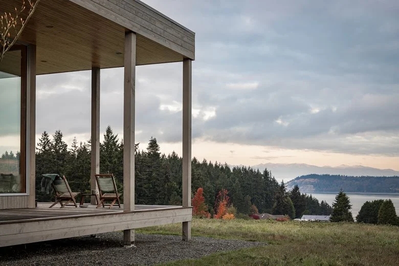 住宅包含两间卧室、两间浴室、一个多功能室,以及一个供集体活动使用的客厅和厨房。住宅的通透设计让居住者愿意共处时光、欣赏乡村景致;而住宅位于地块最高处的位置,又能让人将周边 “无用湾”(Useless Bay)和奥林匹克山脉的全景尽收眼底。在温暖的季节里,业主还能享用宽敞的西向露台。