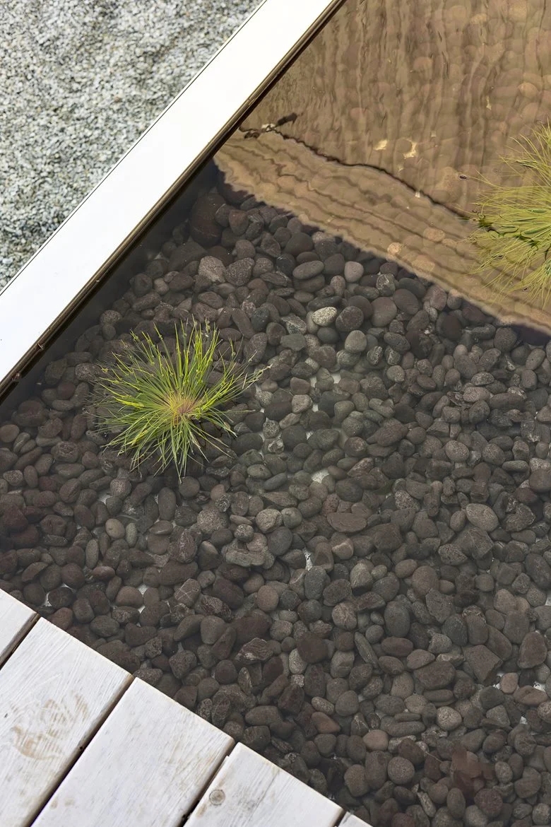这座面积为 1880 平方英尺(约 174.6 平方米)的住宅坐落于自然环境的高处。草地牧草环绕着这座外立面为柔和雪松材质的建筑,宽敞的窗户让住宅与周边自然在听觉和视觉上都产生了联结。住宅采用庭院式布局,中央是碎石铺就的露台,露台上设有倒影池、火坑和一棵单株的紫茎树。