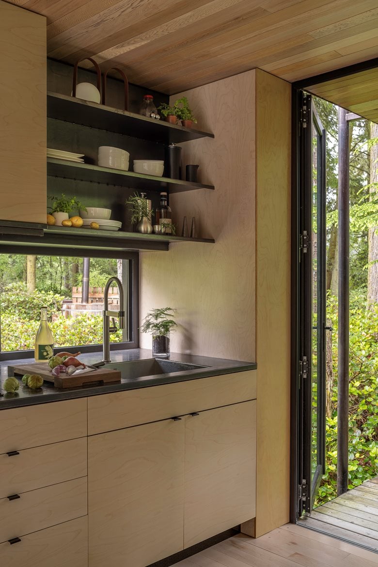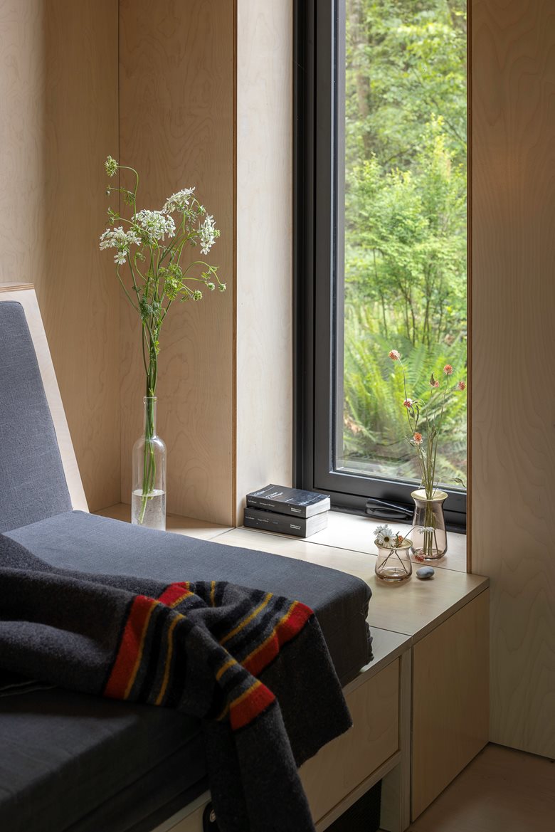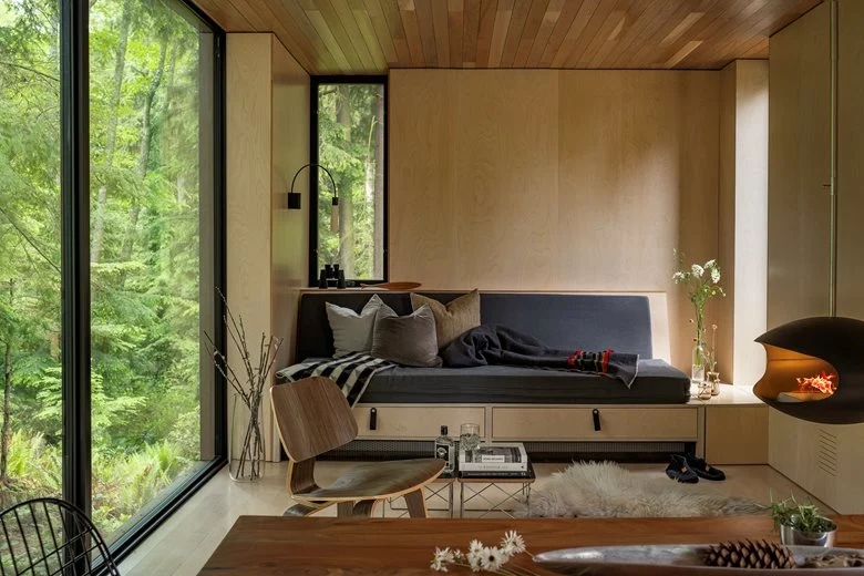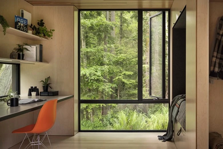 以灵活性为核心的 “Puzzle Prefab(拼图预制森林度假屋设计)” 接受了一项挑战:打造对环境影响最小的住宅,同时为居住者促进健康生活并增强与自然的联系。该原型住宅的面积仅为典型美式住宅(2000 平方英尺)的四分之一,包含 600 平方英尺的室内生活空间,以及与之相连的 557 平方英尺带顶户外空间。