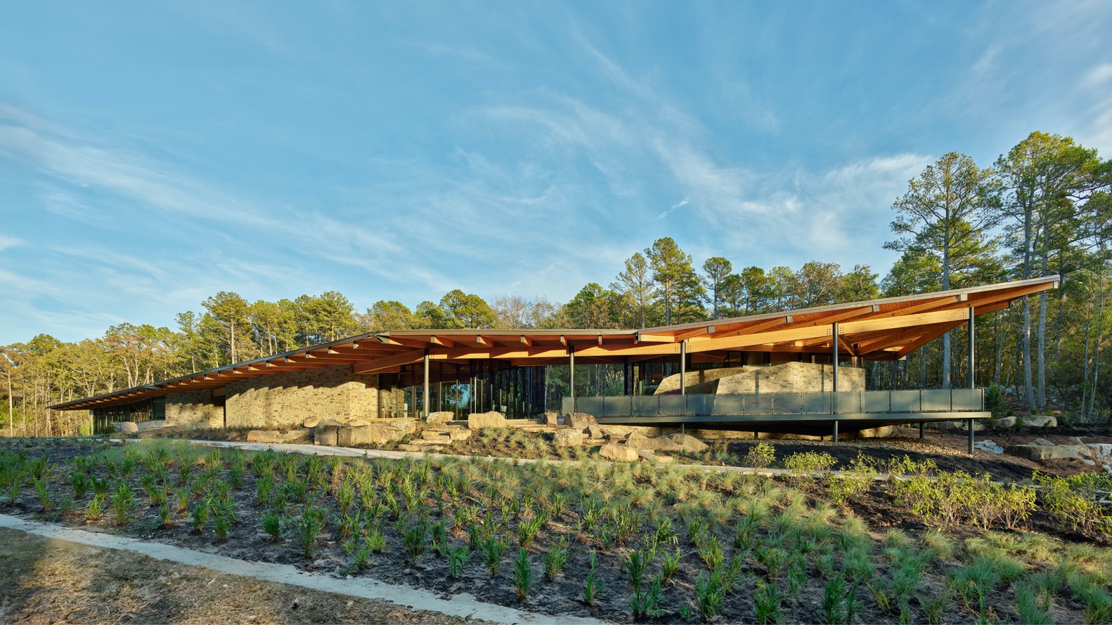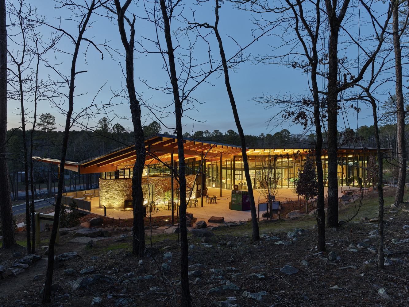 尖顶山州立公园的新游客中心设计像一个有结构的、起伏的树冠一样穿过树木,轻轻地扎根于倾斜的场地,形成了一个通往尖顶山和所有阿肯色州州立公园的门户。