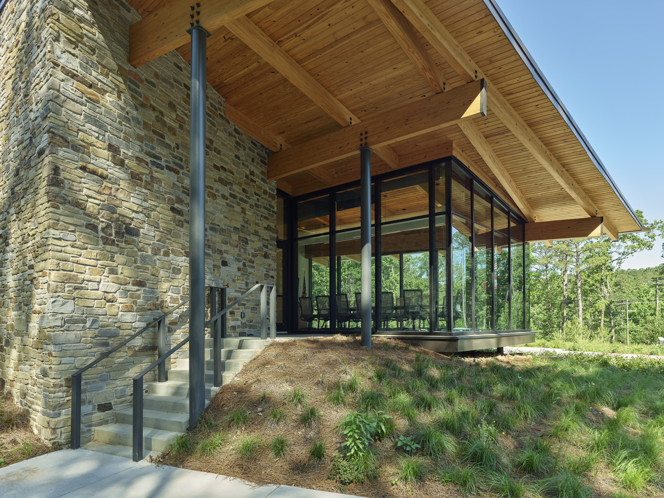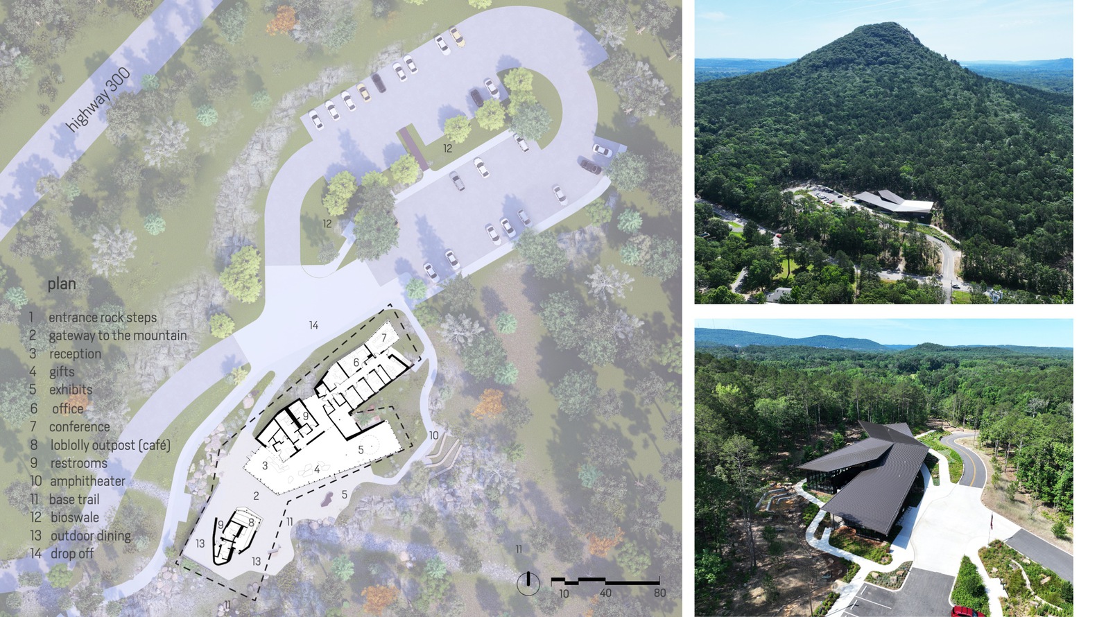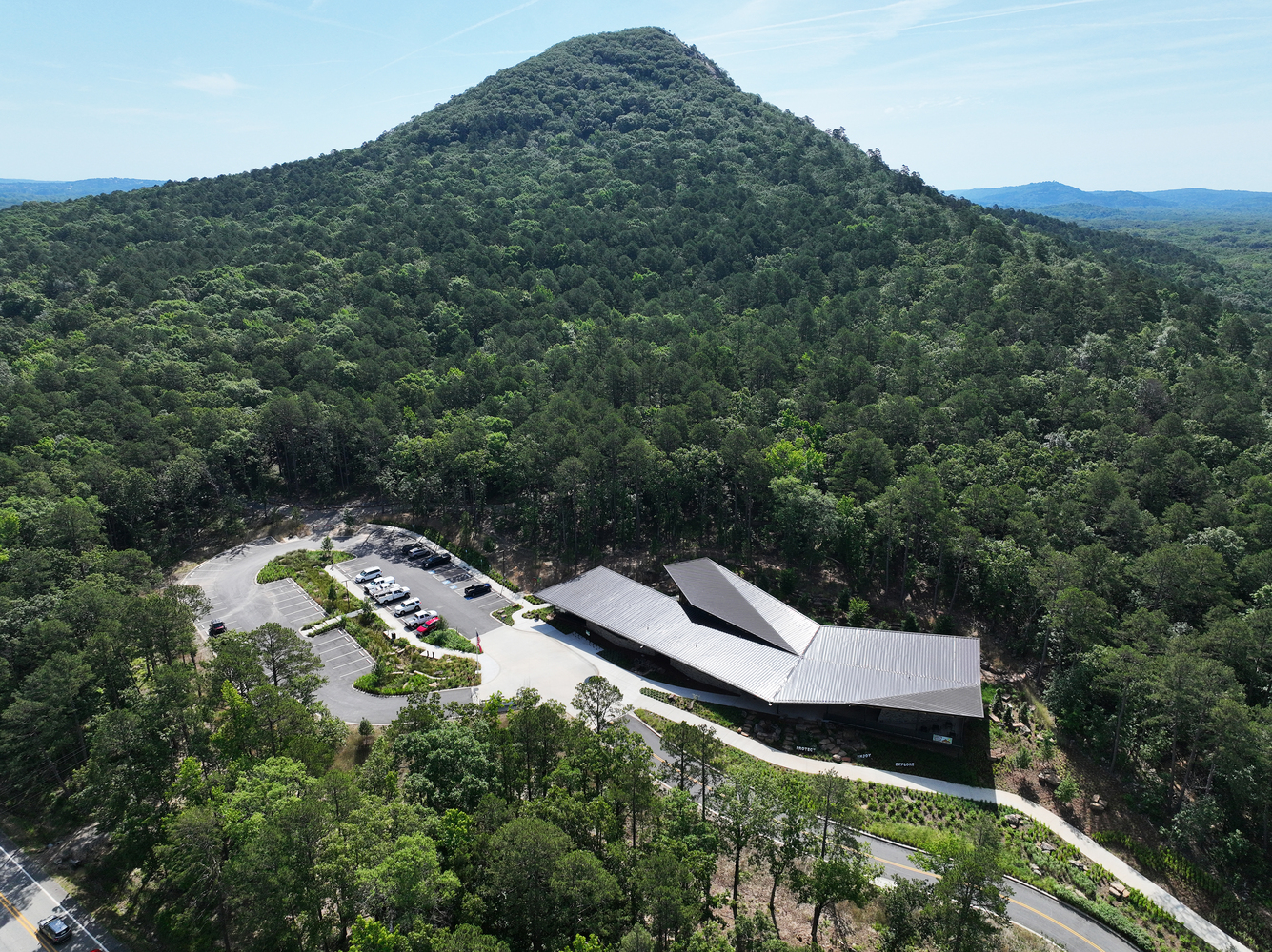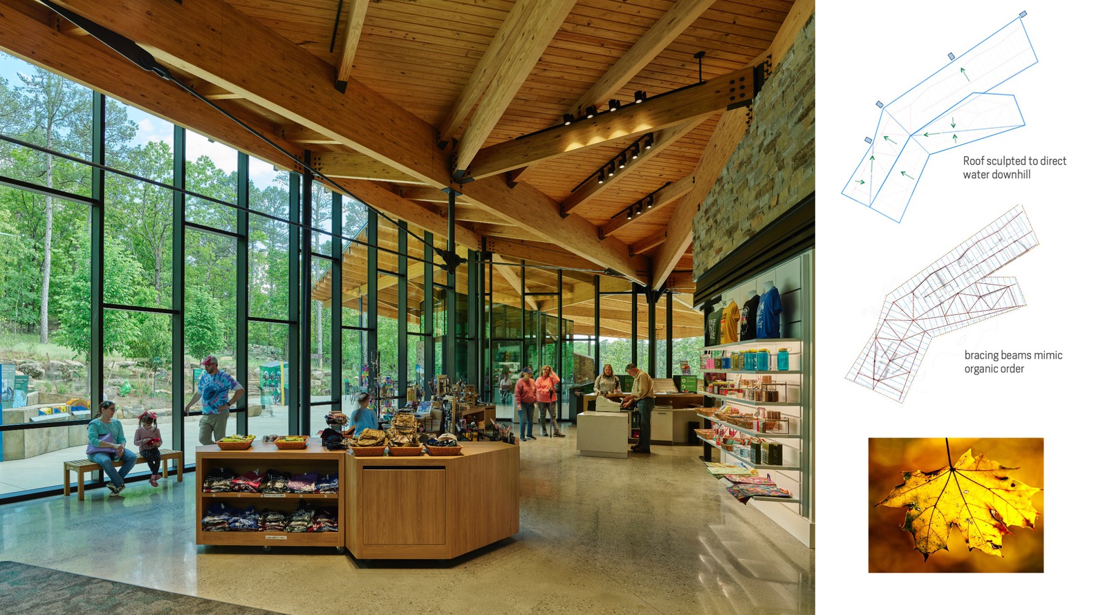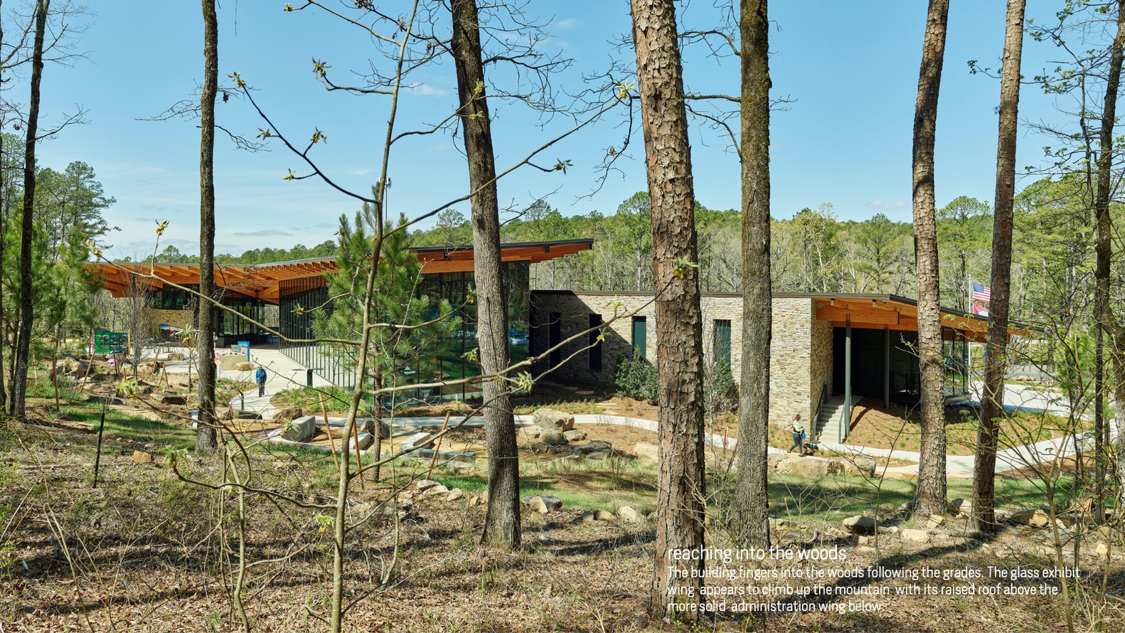 虽然奥扎克和瓦希托山脉的其他州立公园有各种各样的历史小屋和建筑,这些建筑都是平民保护团(CCC)时期的建筑风格,但Pinnacle山没有先例;它与城市的联系,以及那些在这座山上划独木舟、划皮艇、徒步旅行、登山和骑自行车的年轻城市顾客说,它应该以一种不同的方式连接起来。州立公园想要一座与山无缝结合的建筑,作为山的一部分。对于那些没有冒险走过这个公园的人来说,这个游客中心不仅需要成为通往顶峰公园的门户,而且需要成为通往所有州立公园的门户。