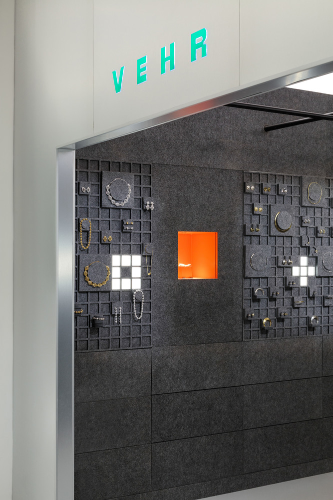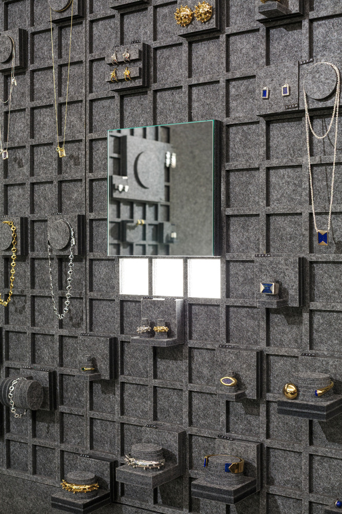 为了支撑珠宝,设计了大约 25 种不同的展示件,以展示品牌的全部产品系列。它们嵌入在一个 1.20 米宽的区域内,带有一个凹陷的网格,可根据新品发布和系列产品进行多种组合。在门店周边,还设置了两个彩色橱窗(蓝色和橙色),以突出新系列和产品。除了展示件外,还有镜子和未包覆的区域,在这些地方,小型背光灯面板会照亮客户试戴项链、耳环、戒指、手镯和吊坠时的面容。